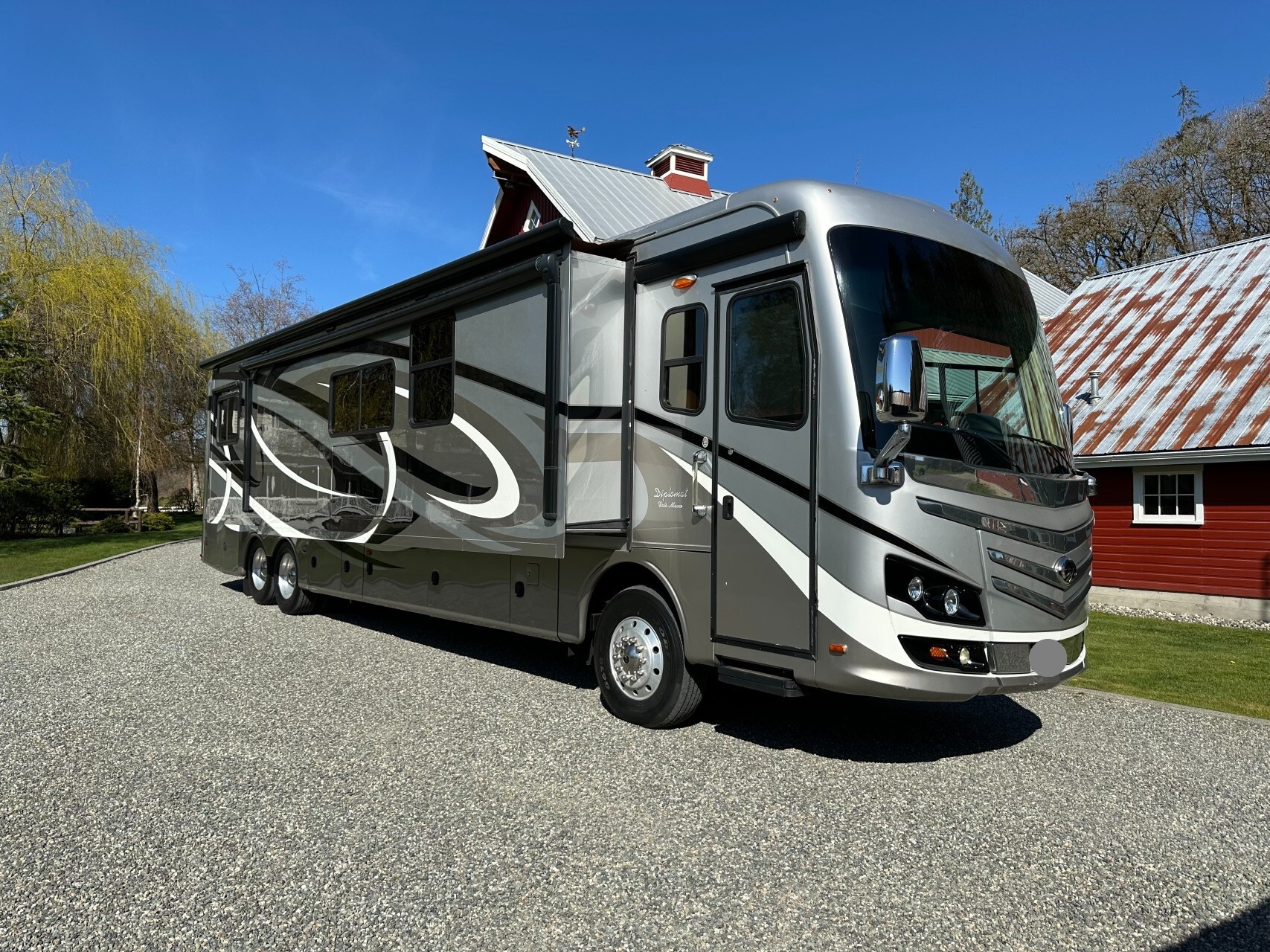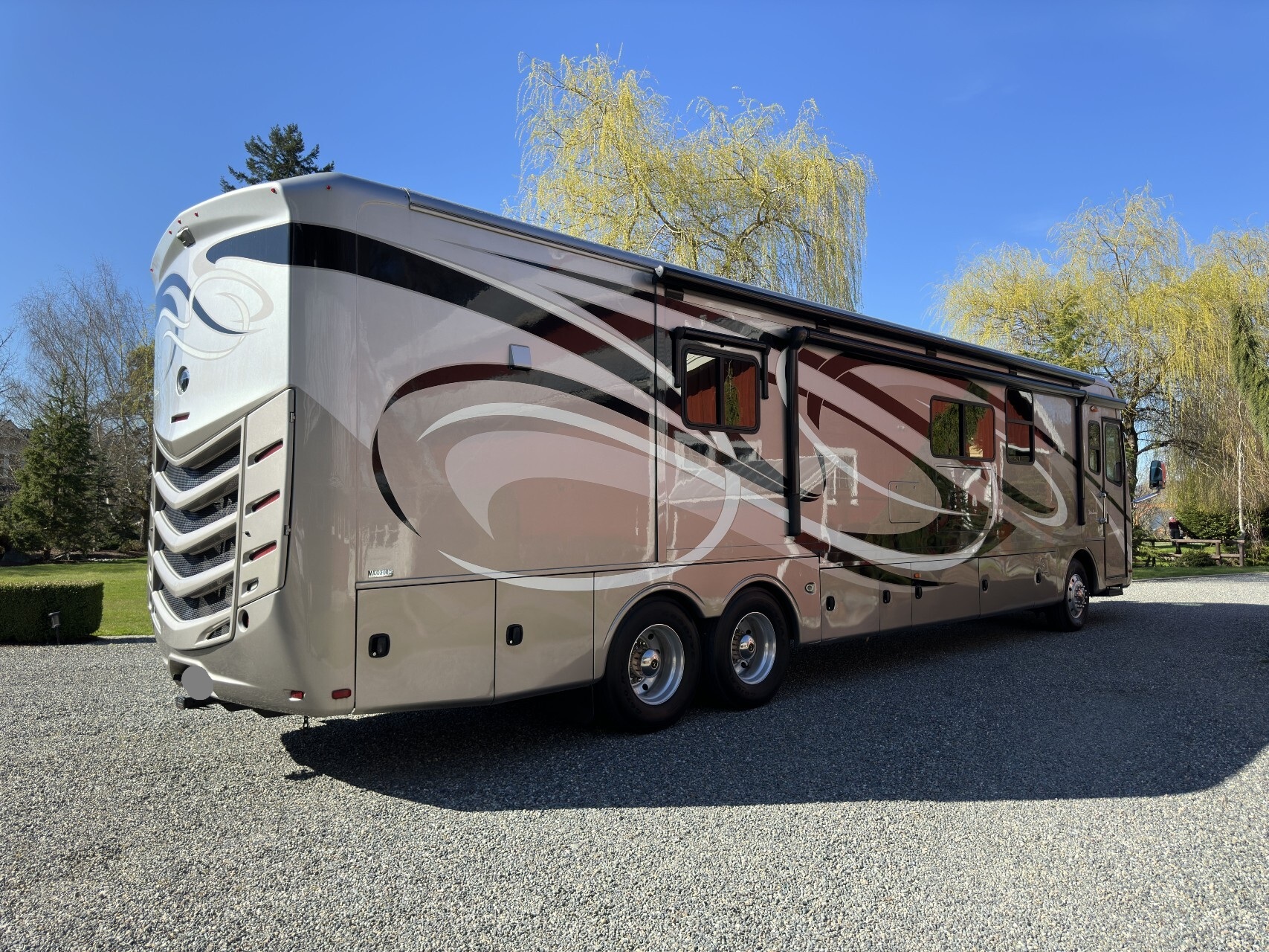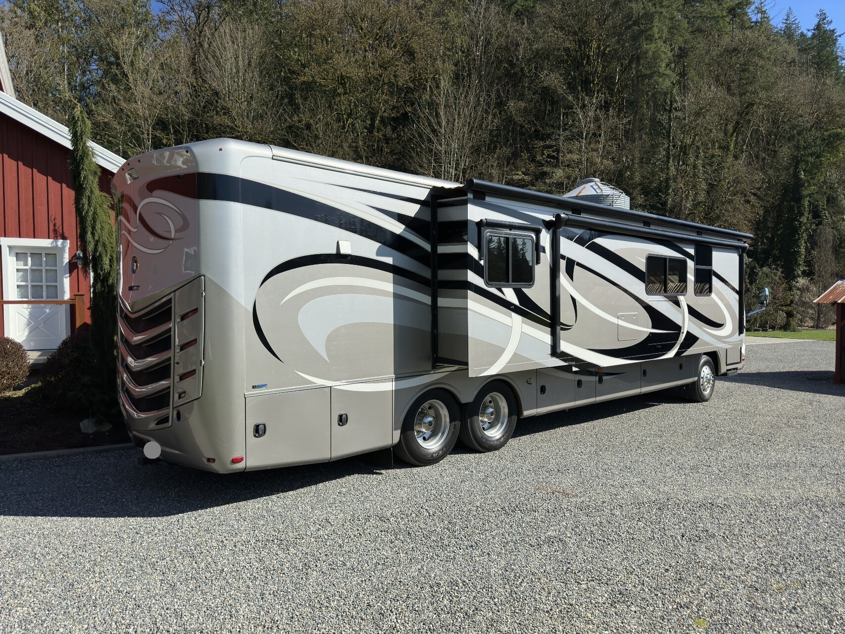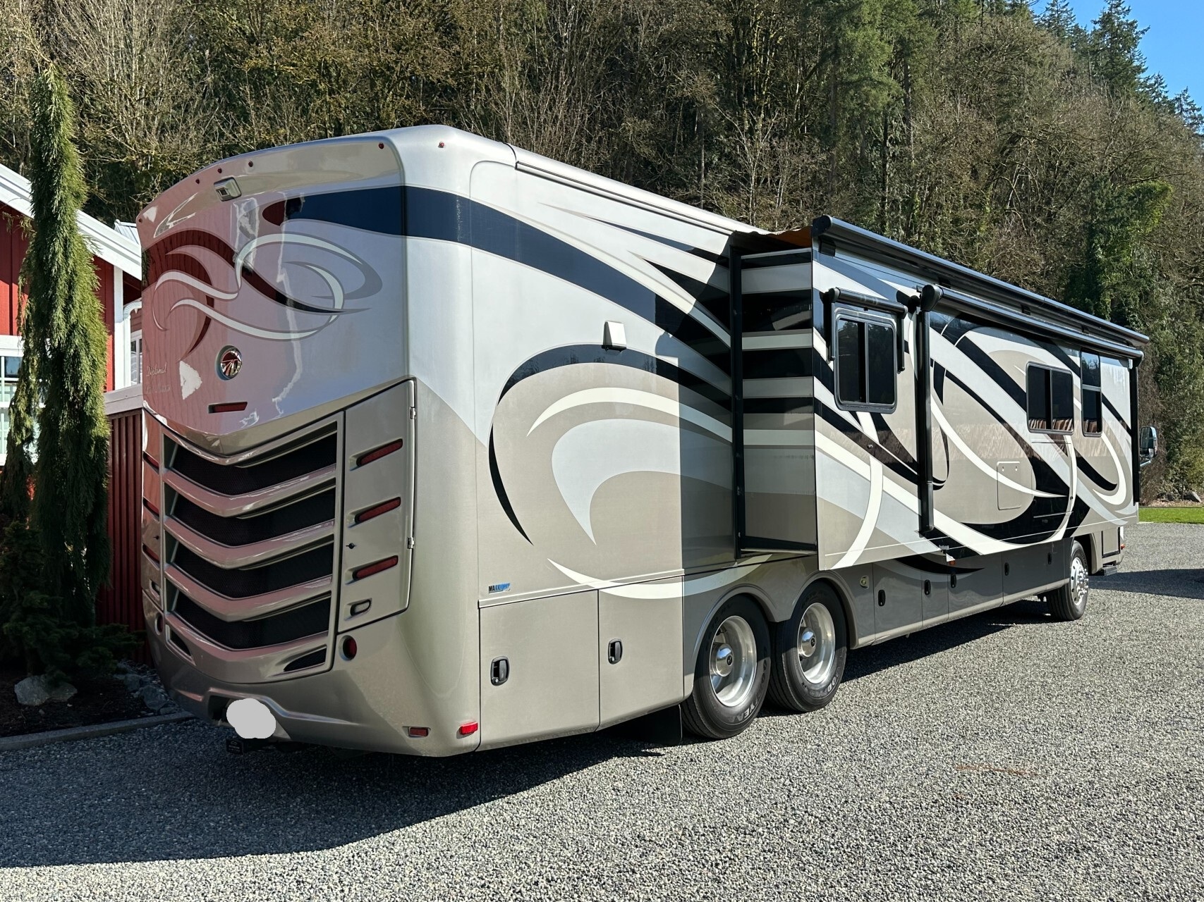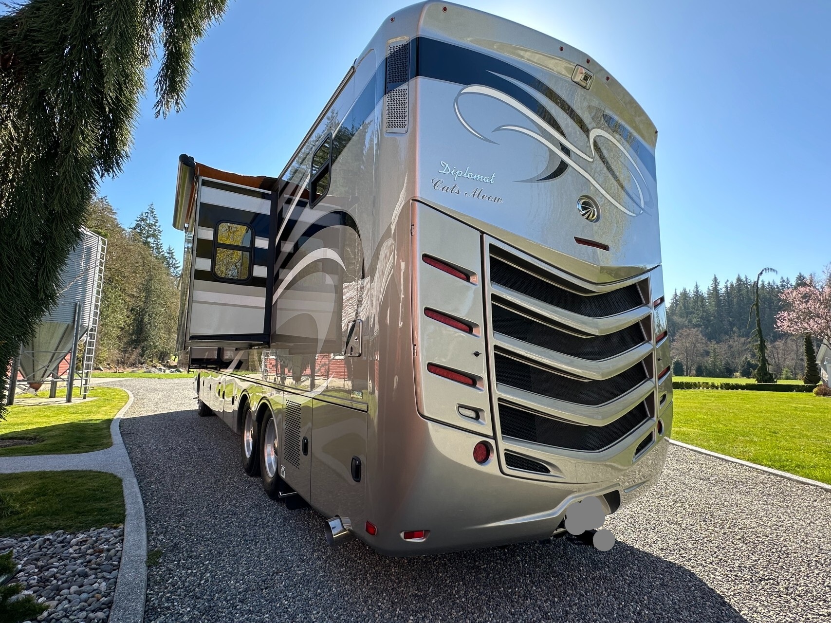 2013 Monaco Diplomat 43RFT with only 15k original miles. One owner. With the distinctive styling of a Monaco Coach, a powerful 405 hp engine and the best ride in the industry, the Diplomat offers the finest in residential living. Very clean and unabused condition. Would make for a great cross-country coach or luxury living on your dream property. Great configuration with the aft master suite and separate bathroom. Forward pull-out sofa gives extra sleeping arrangements for guests. Cozy living room equipped with an electric fireplace, recliner and extendable sofa. Stainless steel appliances, residential refrigerator, 2-burner induction cooktop, 1-1/2 bath floorplan configuration, stackable washer and dryer, tile flooring, Quiet Cool roof air conditioners with heat pumps and Aquahot 400 Hydronic heating system, exterior entertainment center with 42 inch LCD TV, automatic hydraulic leveling system and a Cummins Onan generator. The Roadmaster Chassis was built to deliver the very best diesel motorhome experience. Roadmaster construction utilizes advanced design and engineering, along with its eight outboard-mounted air bags and shock absorbers, to distribute stress evenly throughout the entire chassis, reducing the possibility of twisting and increasing durability and reliability. It's the ultimate foundation for a luxury ride. The MaxxForce 10 design grew from a big idea: bring to the mid-range diesel market traditional big bore features like wet-sleeve design and in-chassis rebuild capability. This model, which brings increased 9.3-liter displacement by longer stroke, meets the requirements of more demanding applications. The high-output MaxxForce 10 offers these features plus the performance you would expect from larger heavy-duty engines in a weight-saving medium-duty package.