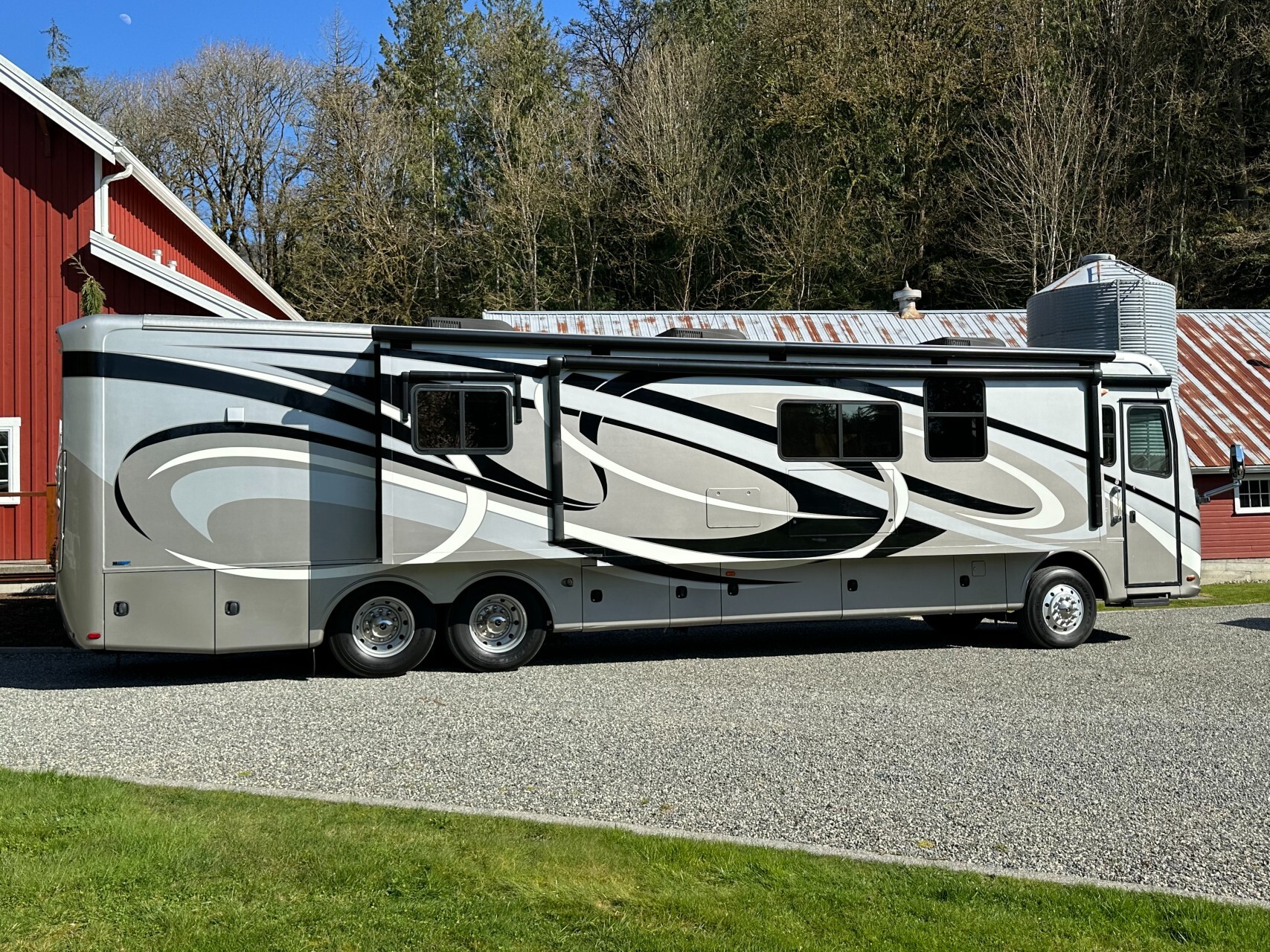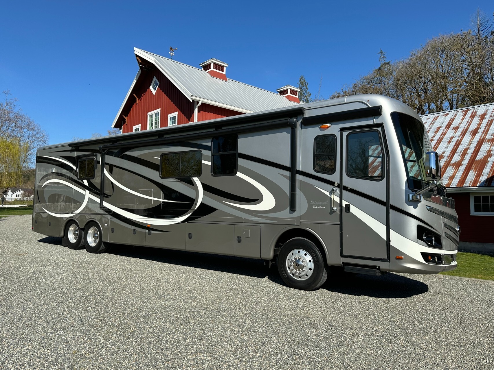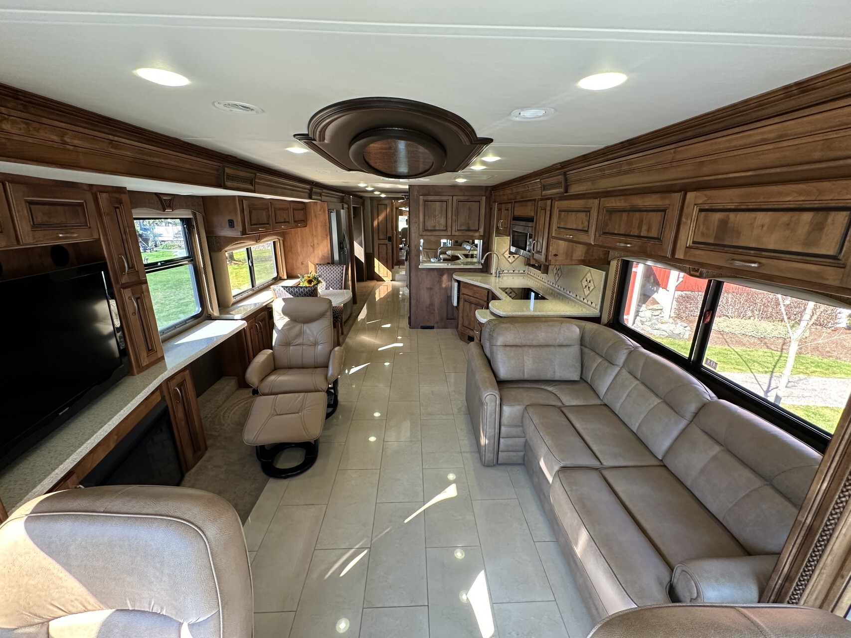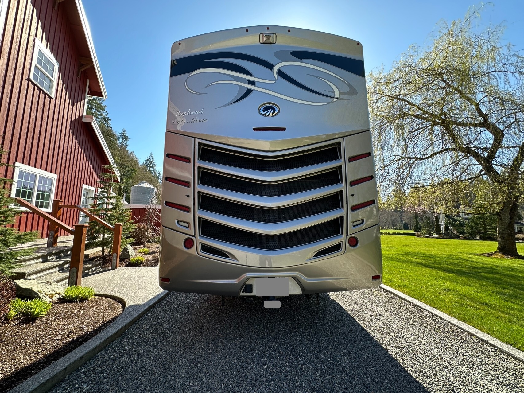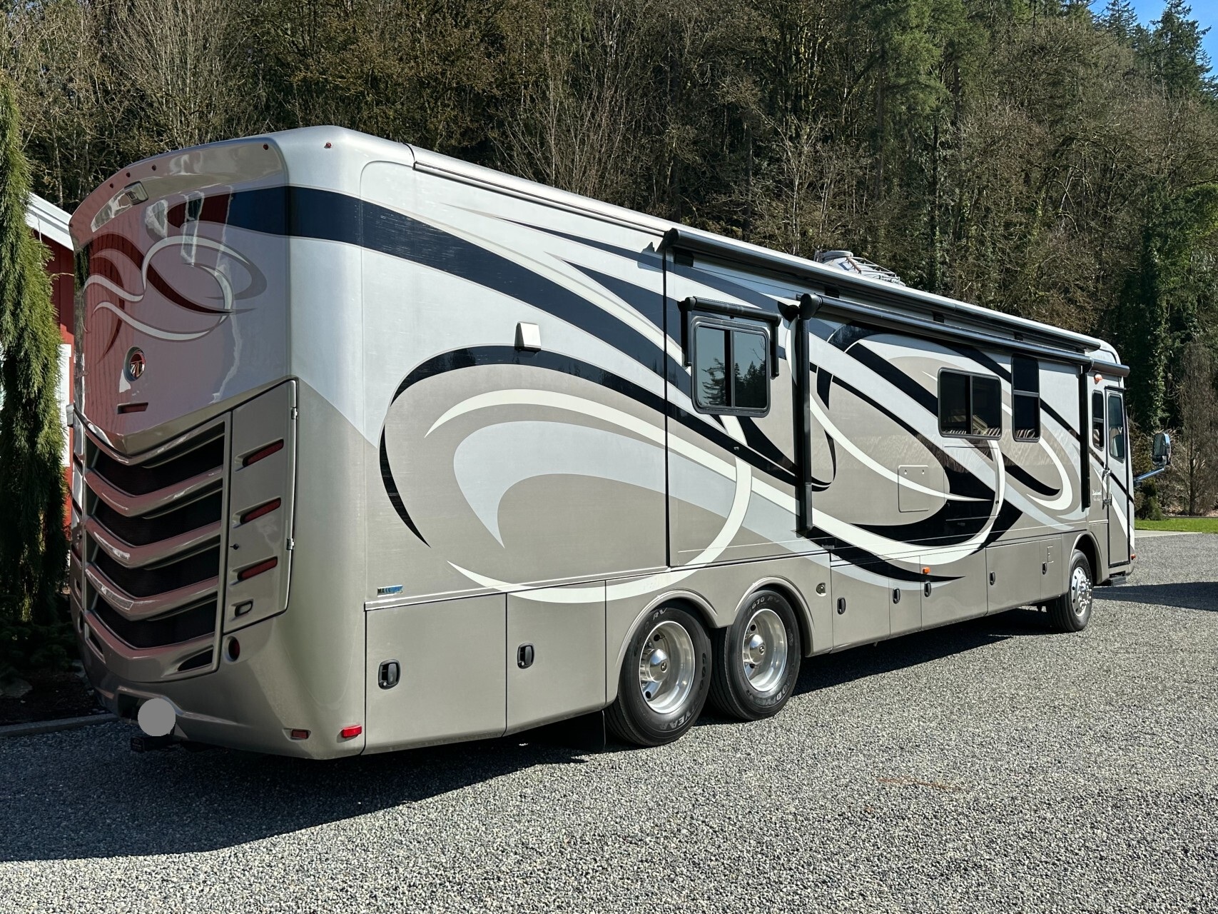 2013 Monaco Diplomat 43RFT with only 15k original miles. One owner. With the distinctive styling of a Monaco Coach, a powerful 405 hp engine and the best ride in the industry, the Diplomat offers the finest in residential living. Very clean and unabused condition. Would make for a great cross-country coach or luxury living on your dream property. Great configuration with the aft master suite and separate bathroom. Forward pull-out sofa gives extra sleeping arrangements for guests. Cozy living room equipped with an electric fireplace, recliner and extendable sofa. Stainless steel appliances, residential refrigerator, 2-burner induction cooktop, 1-1/2 bath floorplan configuration, stackable washer and dryer, tile flooring, Quiet Cool roof air conditioners with heat pumps and Aquahot 400 Hydronic heating system, exterior entertainment center with 42 inch LCD TV, automatic hydraulic leveling system and a Cummins Onan generator. The Roadmaster Chassis was built to deliver the very best diesel motorhome experience. Roadmaster construction utilizes advanced design and engineering, along with its eight outboard-mounted air bags and shock absorbers, to distribute stress evenly throughout the entire chassis, reducing the possibility of twisting and increasing durability and reliability. It's the ultimate foundation for a luxury ride. The MaxxForce 10 design grew from a big idea: bring to the mid-range diesel market traditional big bore features like wet-sleeve design and in-chassis rebuild capability. This model, which brings increased 9.3-liter displacement by longer stroke, meets the requirements of more demanding applications. The high-output MaxxForce 10 offers these features plus the performance you would expect from larger heavy-duty engines in a weight-saving medium-duty package.