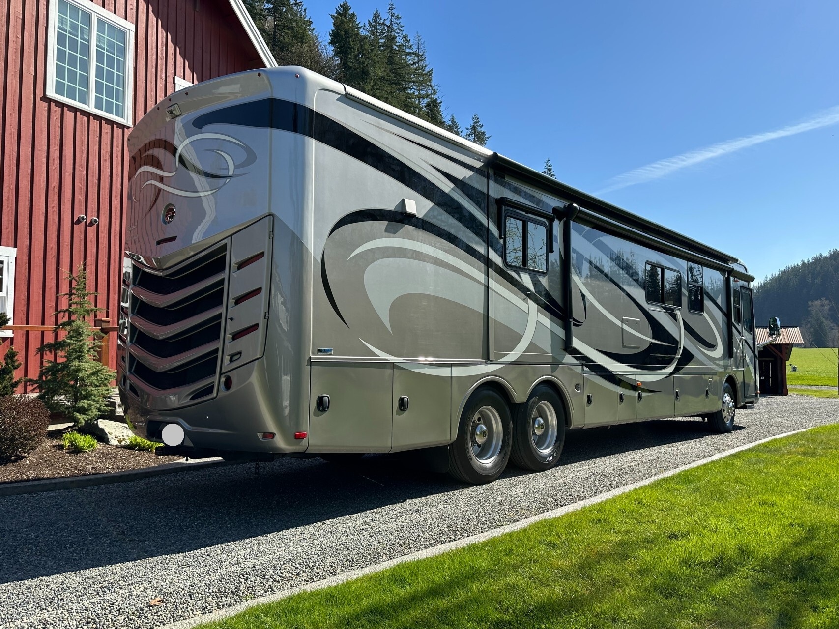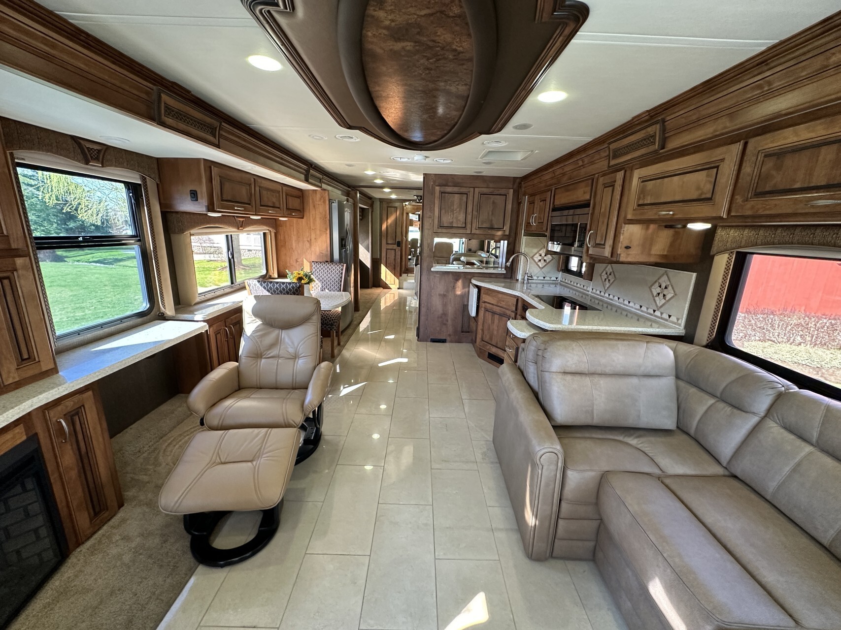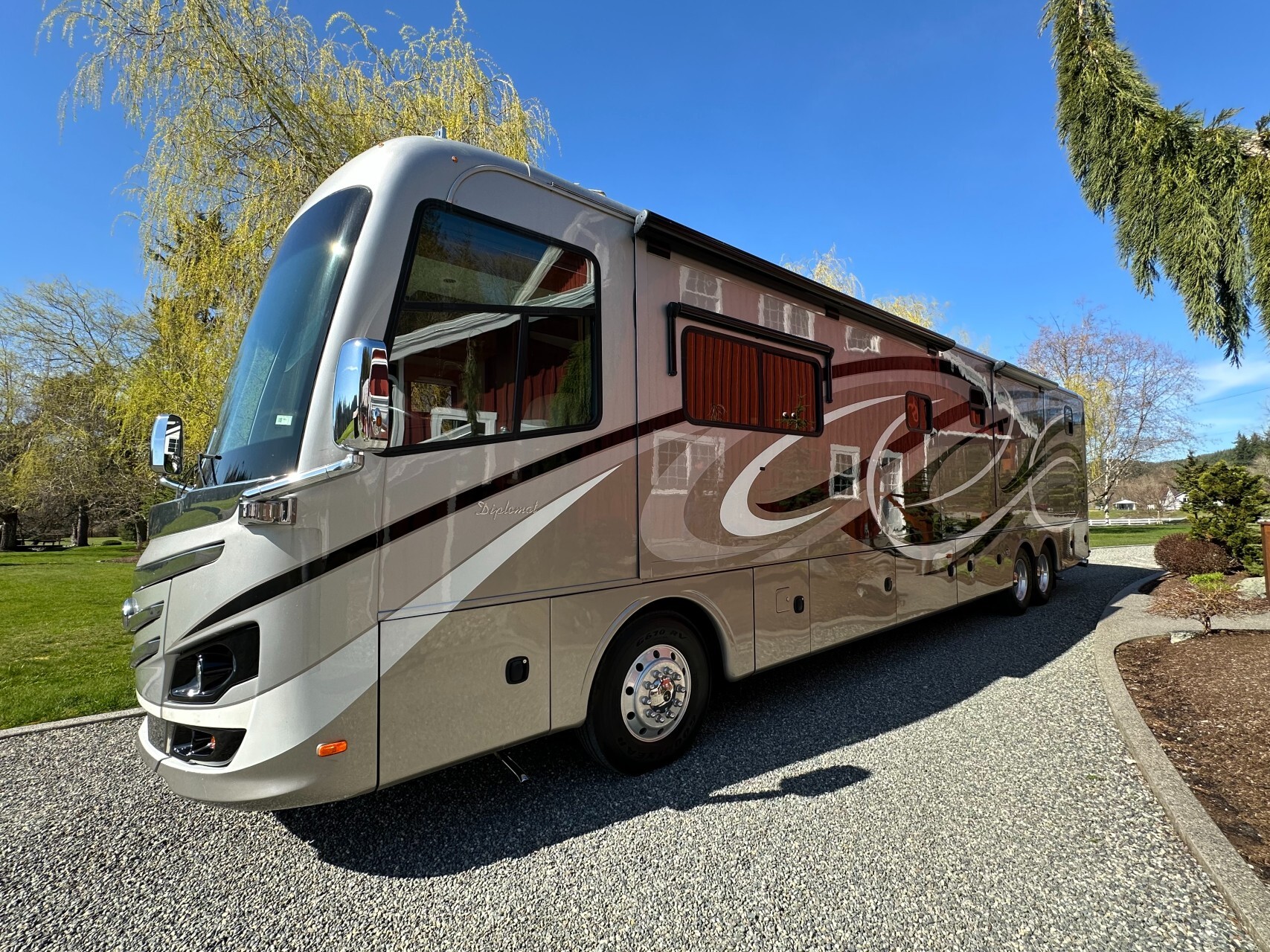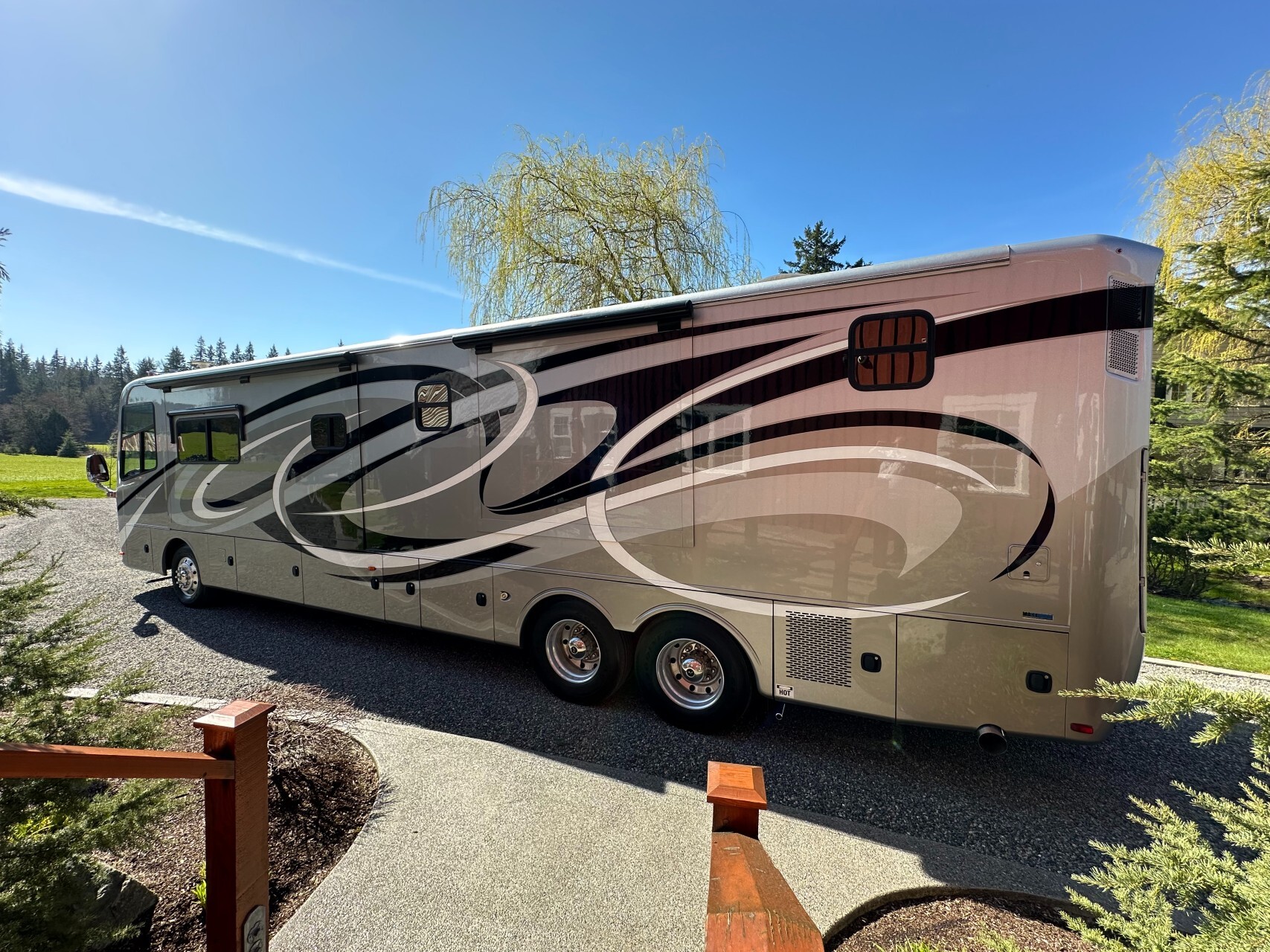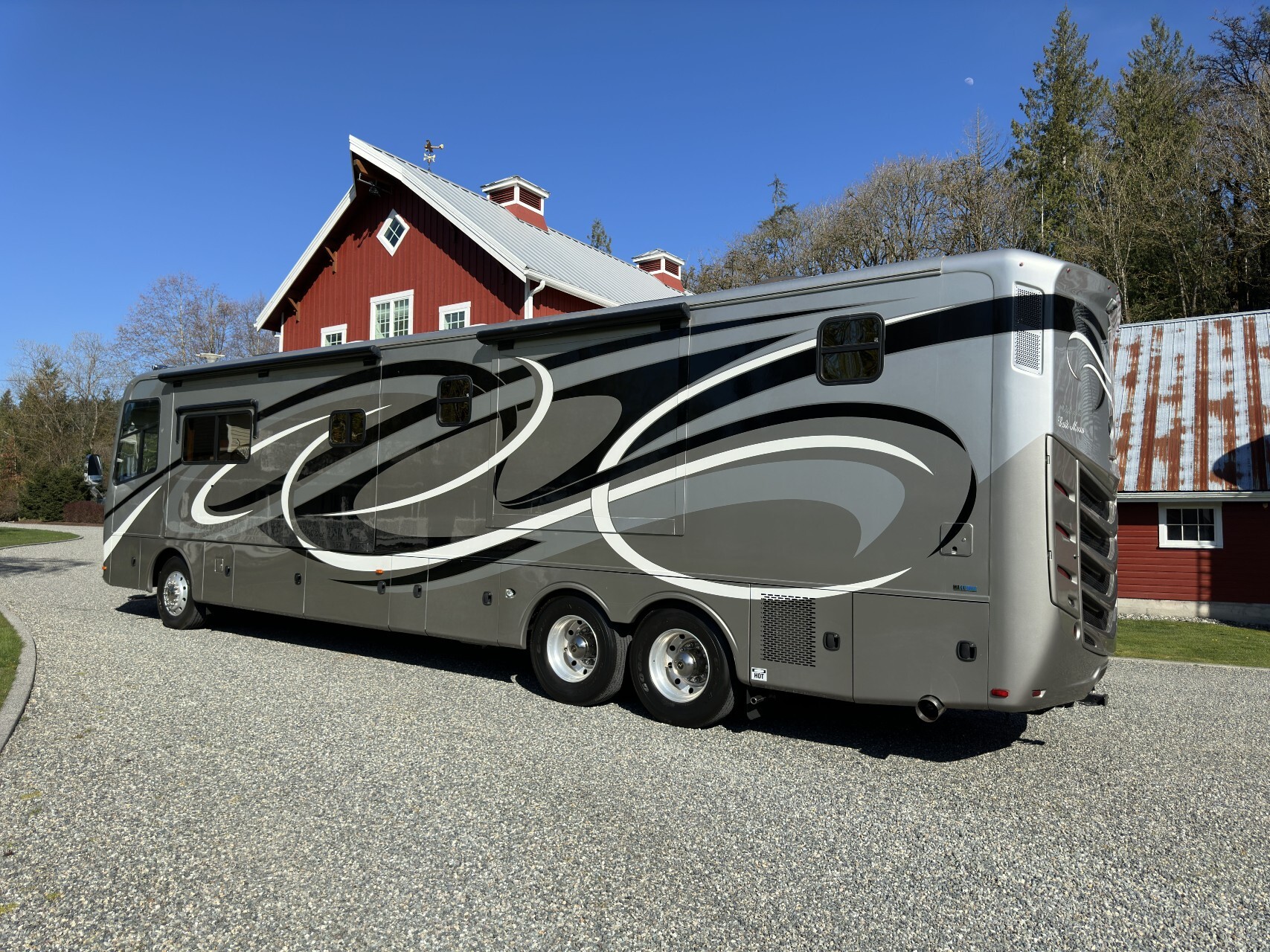 2013 Monaco Diplomat 43RFT with only 15k original miles. One owner. With the distinctive styling of a Monaco Coach, a powerful 405 hp engine and the best ride in the industry, the Diplomat offers the finest in residential living. Very clean and unabused condition. Would make for a great cross-country coach or luxury living on your dream property. Great configuration with the aft master suite and separate bathroom. Forward pull-out sofa gives extra sleeping arrangements for guests. Cozy living room equipped with an electric fireplace, recliner and extendable sofa. Stainless steel appliances, residential refrigerator, 2-burner induction cooktop, 1-1/2 bath floorplan configuration, stackable washer and dryer, tile flooring, Quiet Cool roof air conditioners with heat pumps and Aquahot 400 Hydronic heating system, exterior entertainment center with 42 inch LCD TV, automatic hydraulic leveling system and a Cummins Onan generator. The Roadmaster Chassis was built to deliver the very best diesel motorhome experience. Roadmaster construction utilizes advanced design and engineering, along with its eight outboard-mounted air bags and shock absorbers, to distribute stress evenly throughout the entire chassis, reducing the possibility of twisting and increasing durability and reliability. It's the ultimate foundation for a luxury ride. The MaxxForce 10 design grew from a big idea: bring to the mid-range diesel market traditional big bore features like wet-sleeve design and in-chassis rebuild capability. This model, which brings increased 9.3-liter displacement by longer stroke, meets the requirements of more demanding applications. The high-output MaxxForce 10 offers these features plus the performance you would expect from larger heavy-duty engines in a weight-saving medium-duty package.
