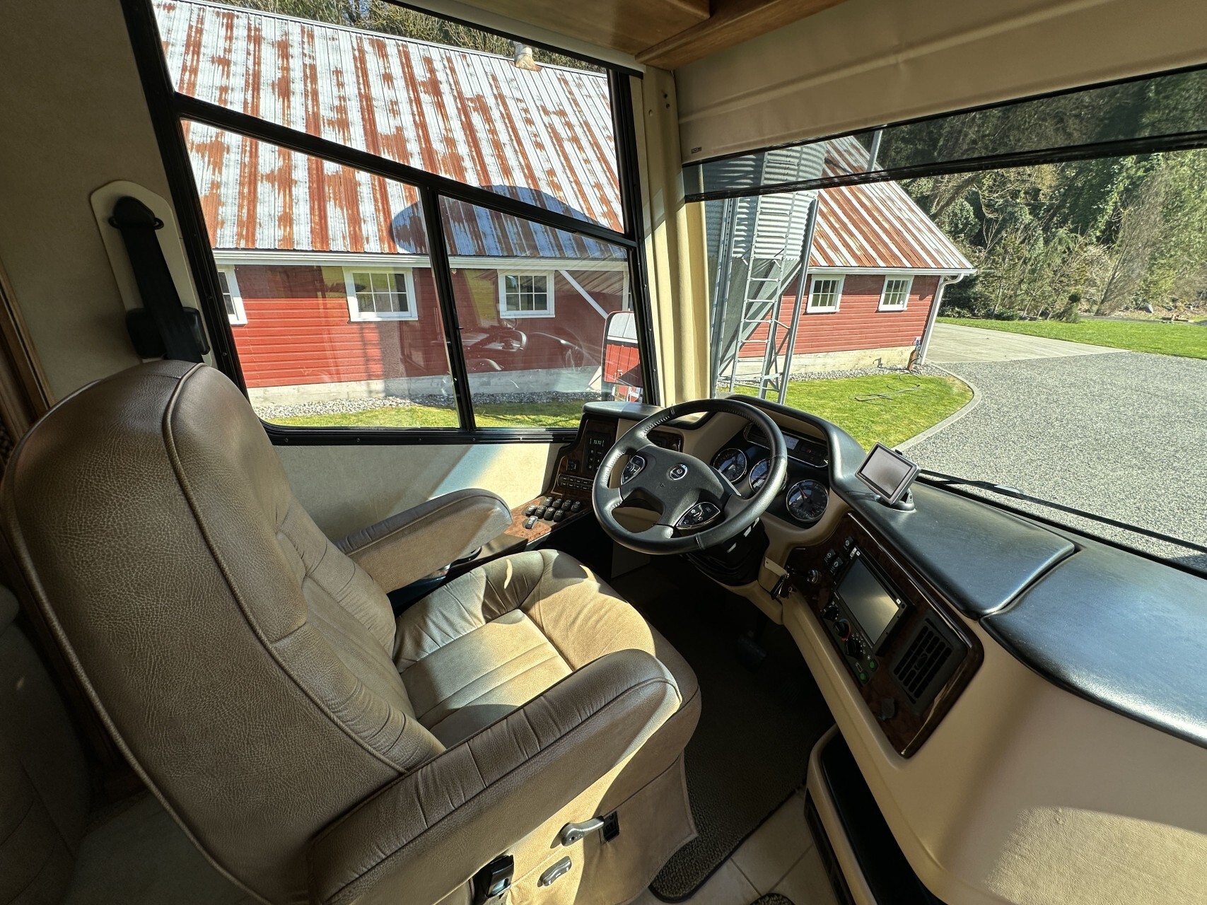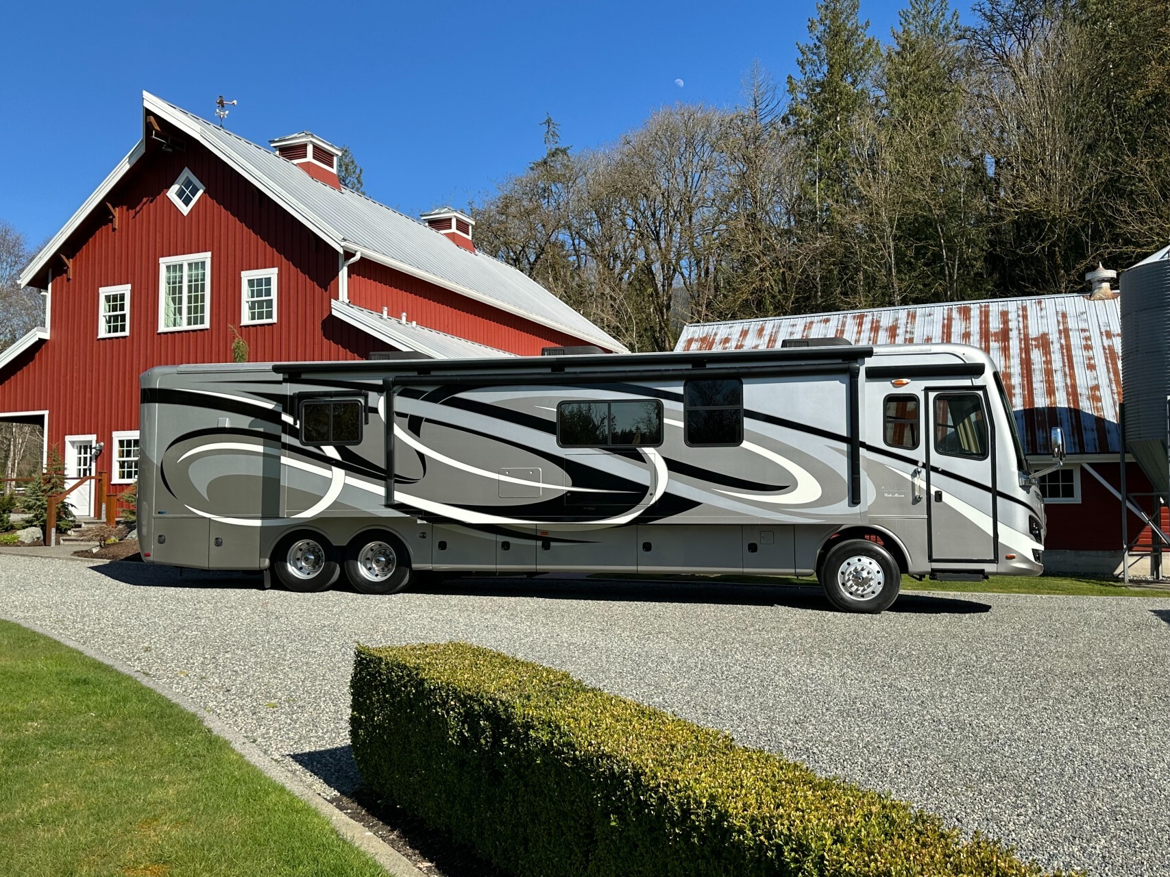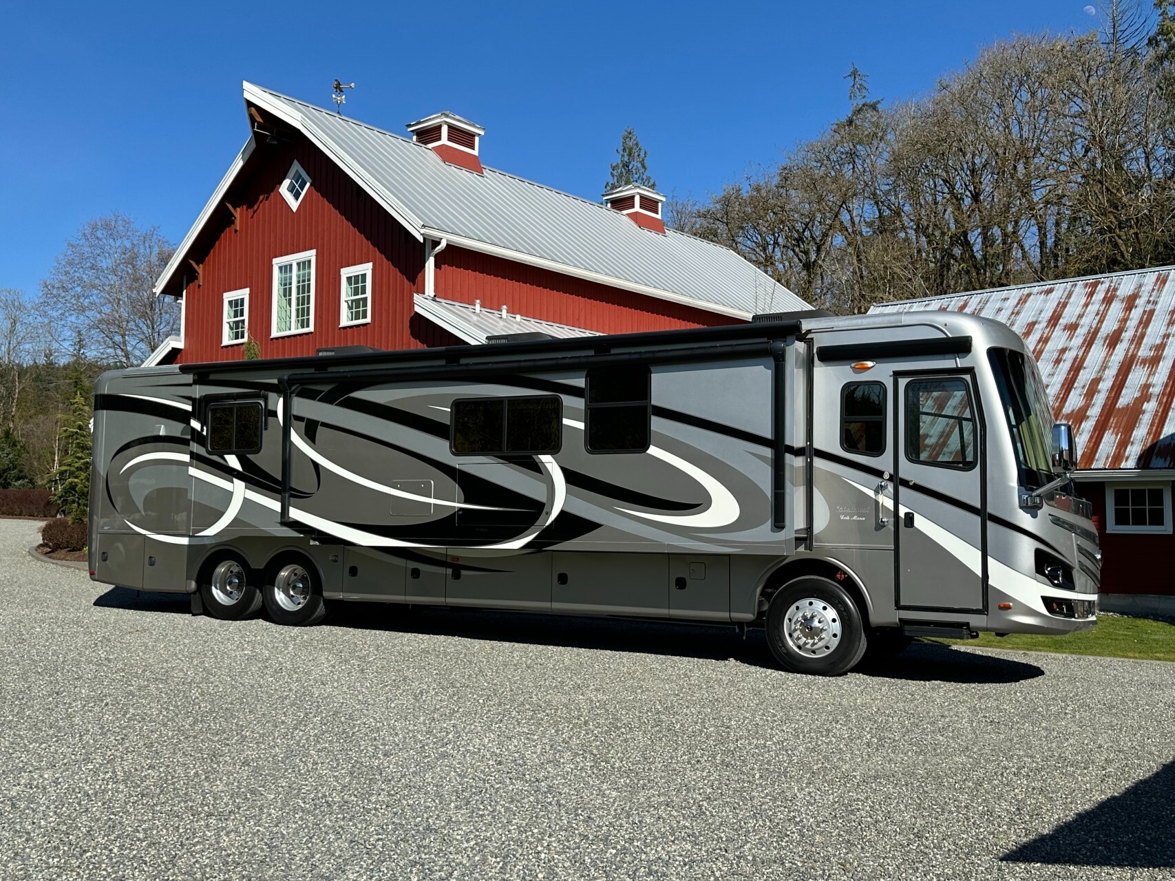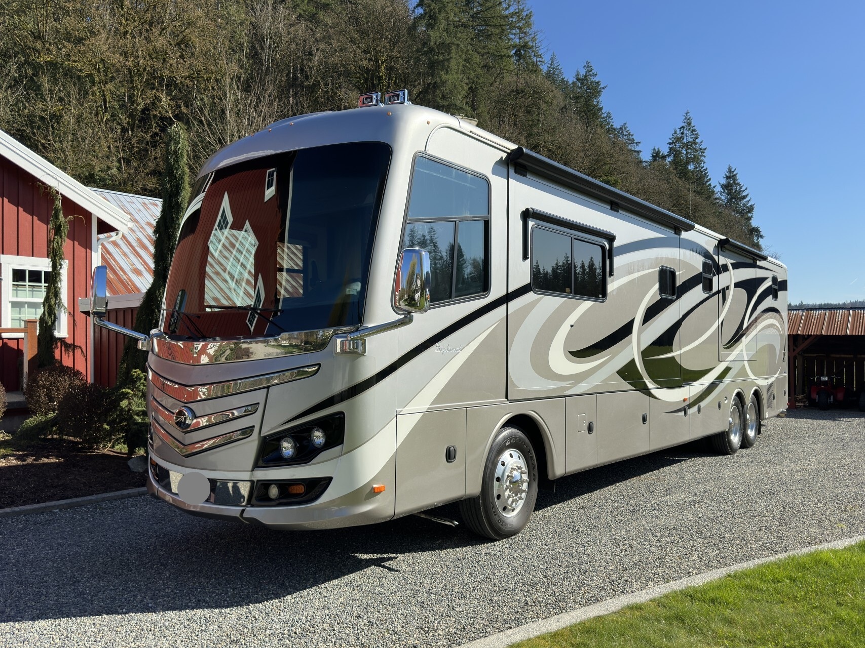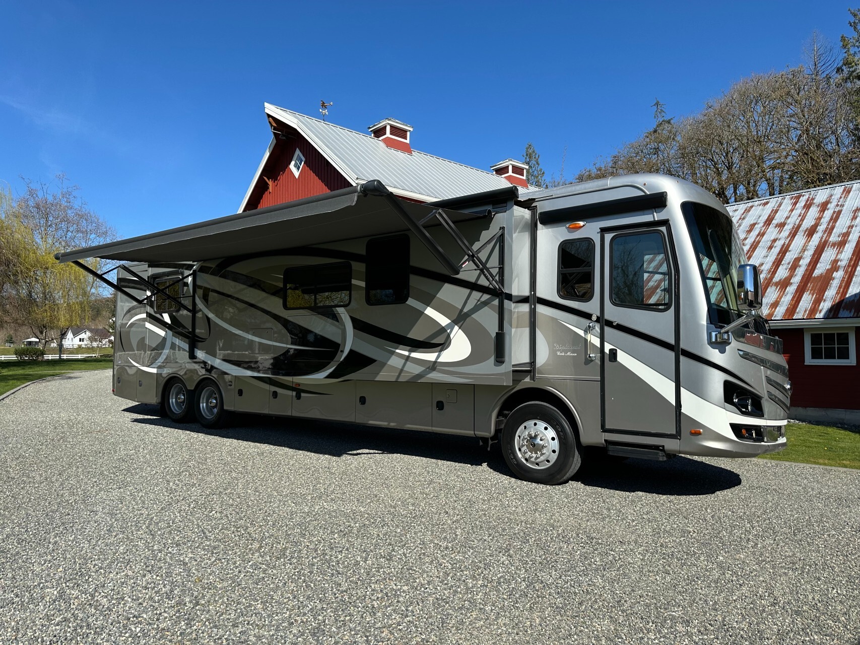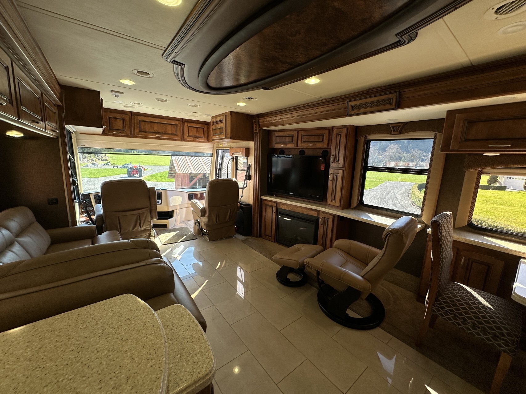 2013 Monaco Diplomat 43RFT with only 15k original miles. One owner. With the distinctive styling of a Monaco Coach, a powerful 405 hp engine and the best ride in the industry, the Diplomat offers the finest in residential living. Very clean and unabused condition. Would make for a great cross-country coach or luxury living on your dream property. Great configuration with the aft master suite and separate bathroom. Forward pull-out sofa gives extra sleeping arrangements for guests. Cozy living room equipped with an electric fireplace, recliner and extendable sofa. Stainless steel appliances, residential refrigerator, 2-burner induction cooktop, 1-1/2 bath floorplan configuration, stackable washer and dryer, tile flooring, Quiet Cool roof air conditioners with heat pumps and Aquahot 400 Hydronic heating system, exterior entertainment center with 42 inch LCD TV, automatic hydraulic leveling system and a Cummins Onan generator. The Roadmaster Chassis was built to deliver the very best diesel motorhome experience. Roadmaster construction utilizes advanced design and engineering, along with its eight outboard-mounted air bags and shock absorbers, to distribute stress evenly throughout the entire chassis, reducing the possibility of twisting and increasing durability and reliability. It's the ultimate foundation for a luxury ride. The MaxxForce 10 design grew from a big idea: bring to the mid-range diesel market traditional big bore features like wet-sleeve design and in-chassis rebuild capability. This model, which brings increased 9.3-liter displacement by longer stroke, meets the requirements of more demanding applications. The high-output MaxxForce 10 offers these features plus the performance you would expect from larger heavy-duty engines in a weight-saving medium-duty package.