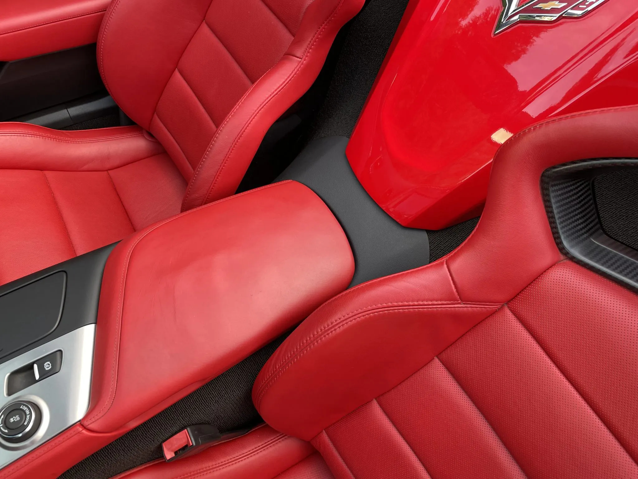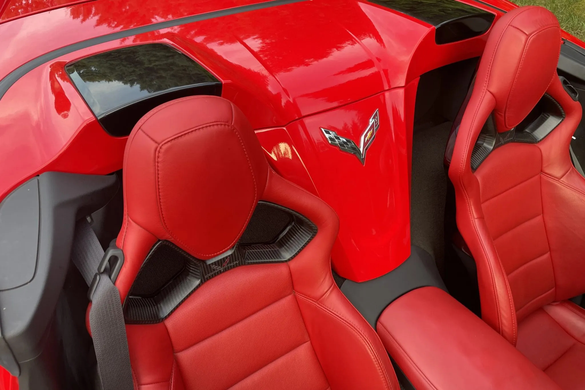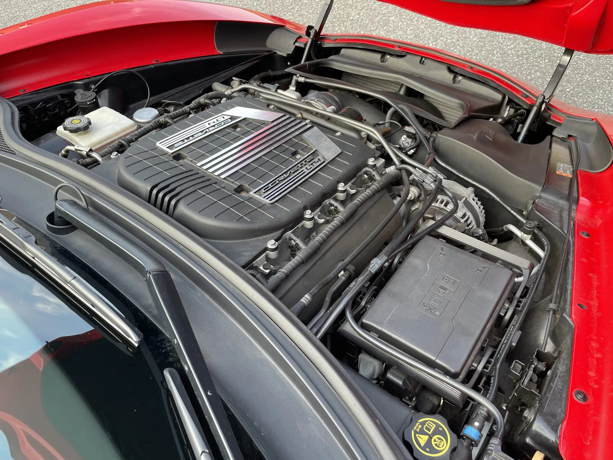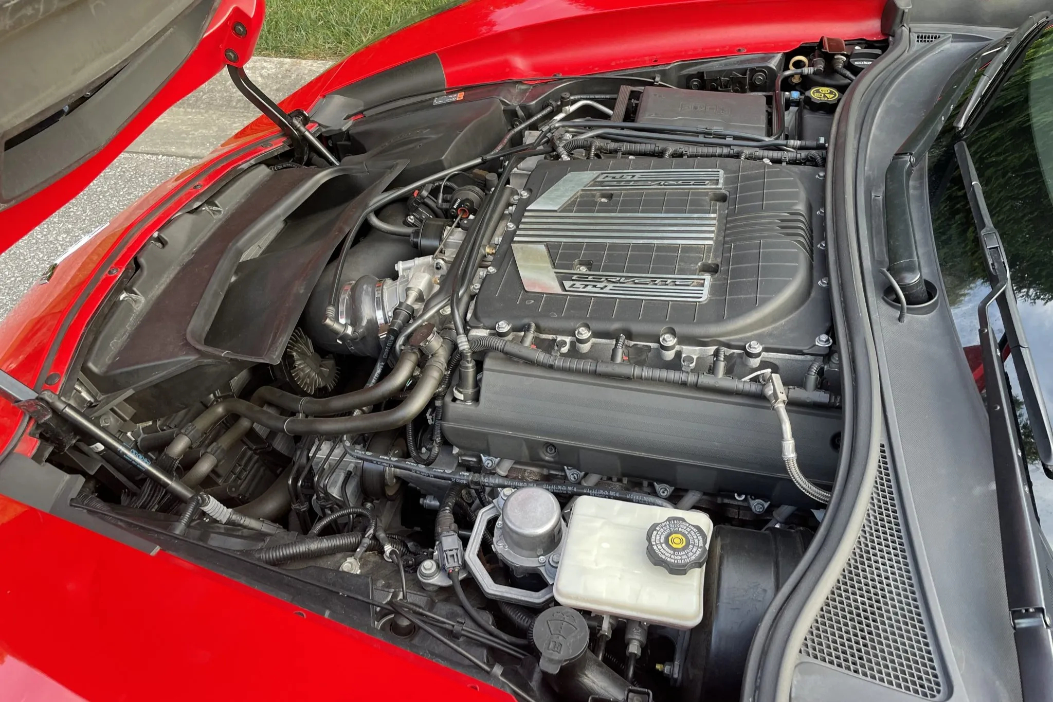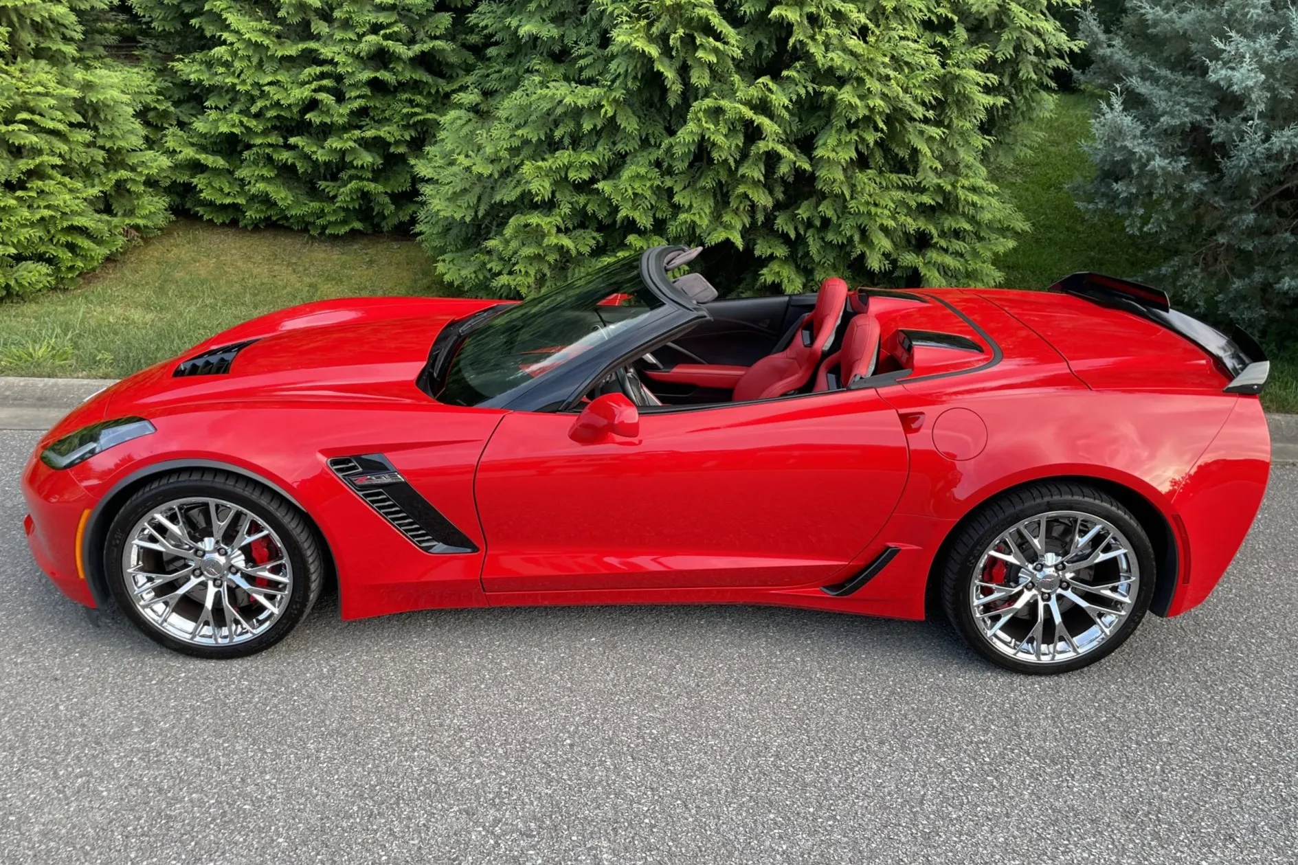 This 2015 Chevrolet Corvette Z06 convertible is powered by a supercharged 6.2-liter LT4 V8 linked with an eight-speed automatic gearbox and an electronic limited-slip differential, and it is finished in Torch Red over Adrenaline Red leather upholstery. Additional equipment includes the 3LZ Premium Equipment Group, 19″ and 20″ Z06 chrome aluminum wheels, Brembo brakes, Magnetic Ride Control, a black convertible soft top, xenon headlights, a rear spoiler, heated and ventilated Competition Sport bucket seats, a performance data recorder, navigation, a head-up display, and a Bose sound system. The car has 22,800 miles.