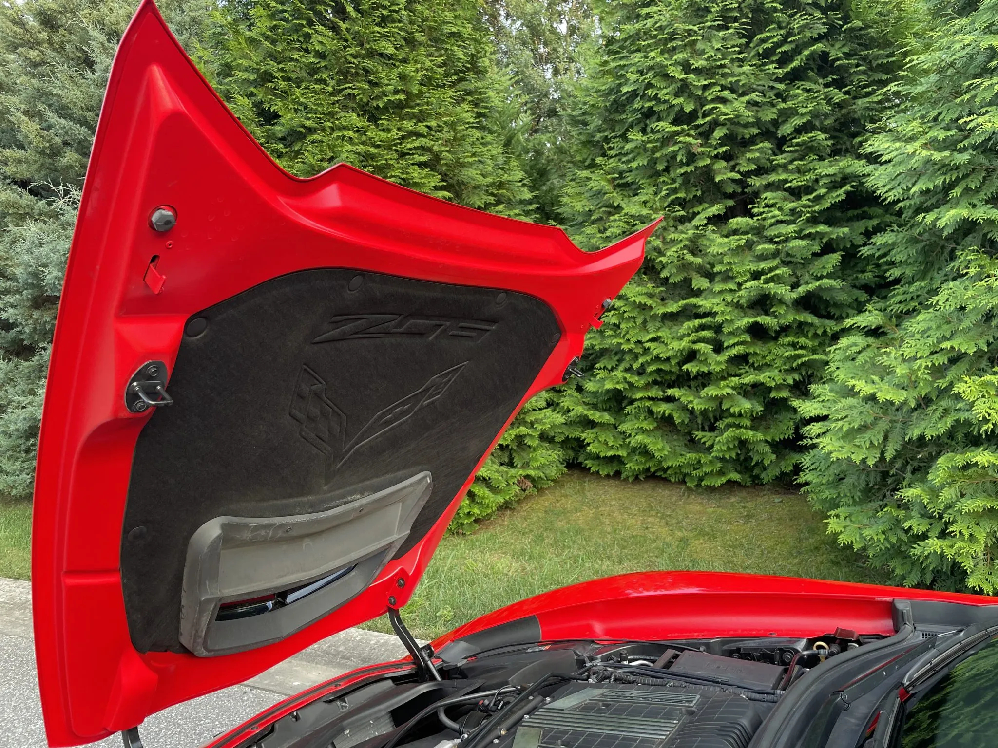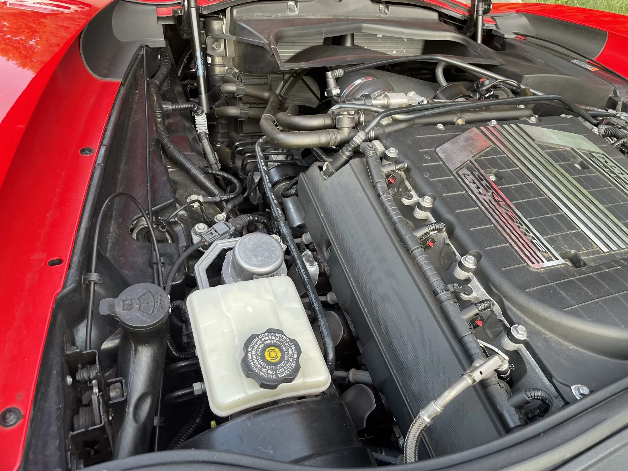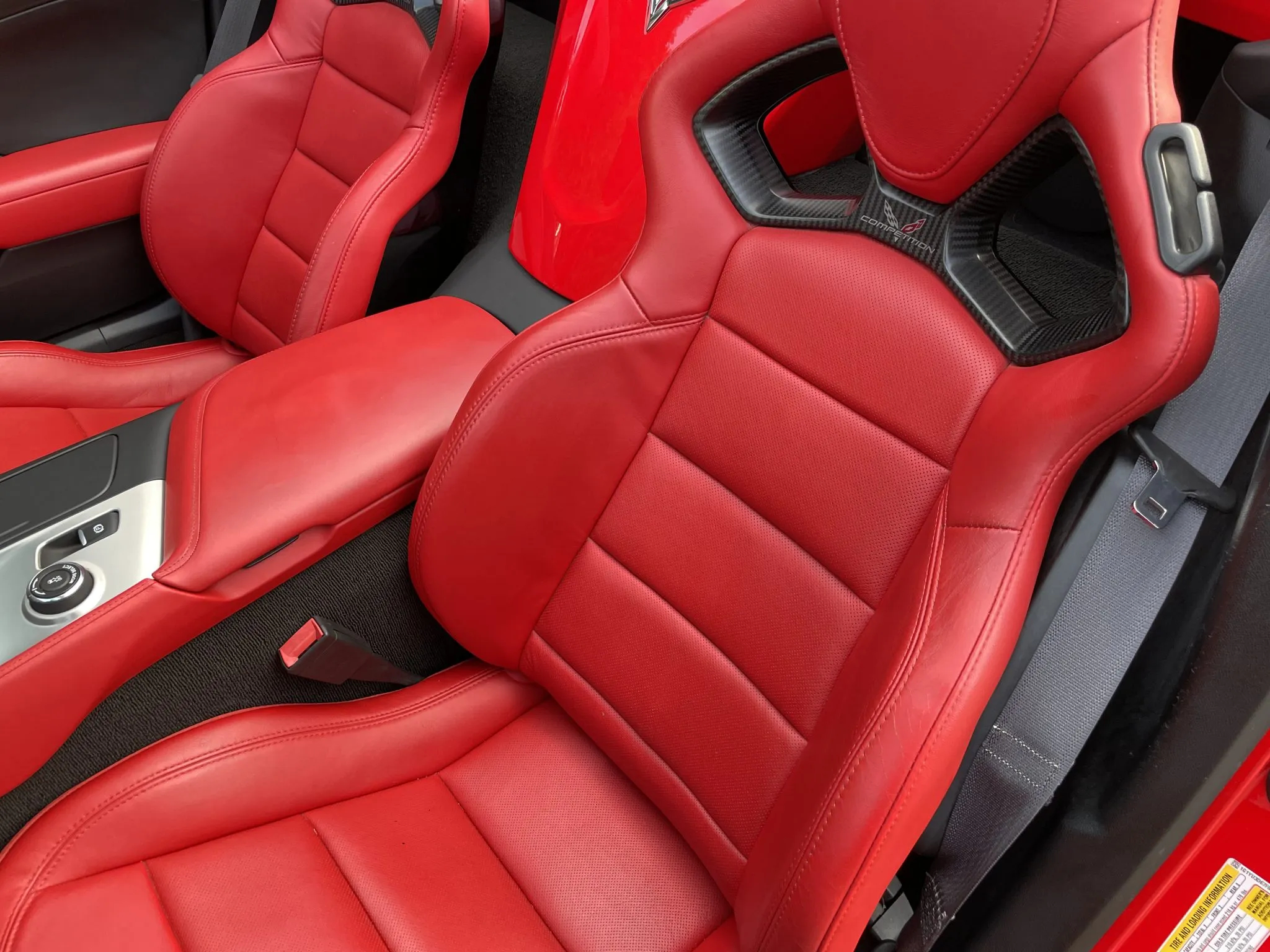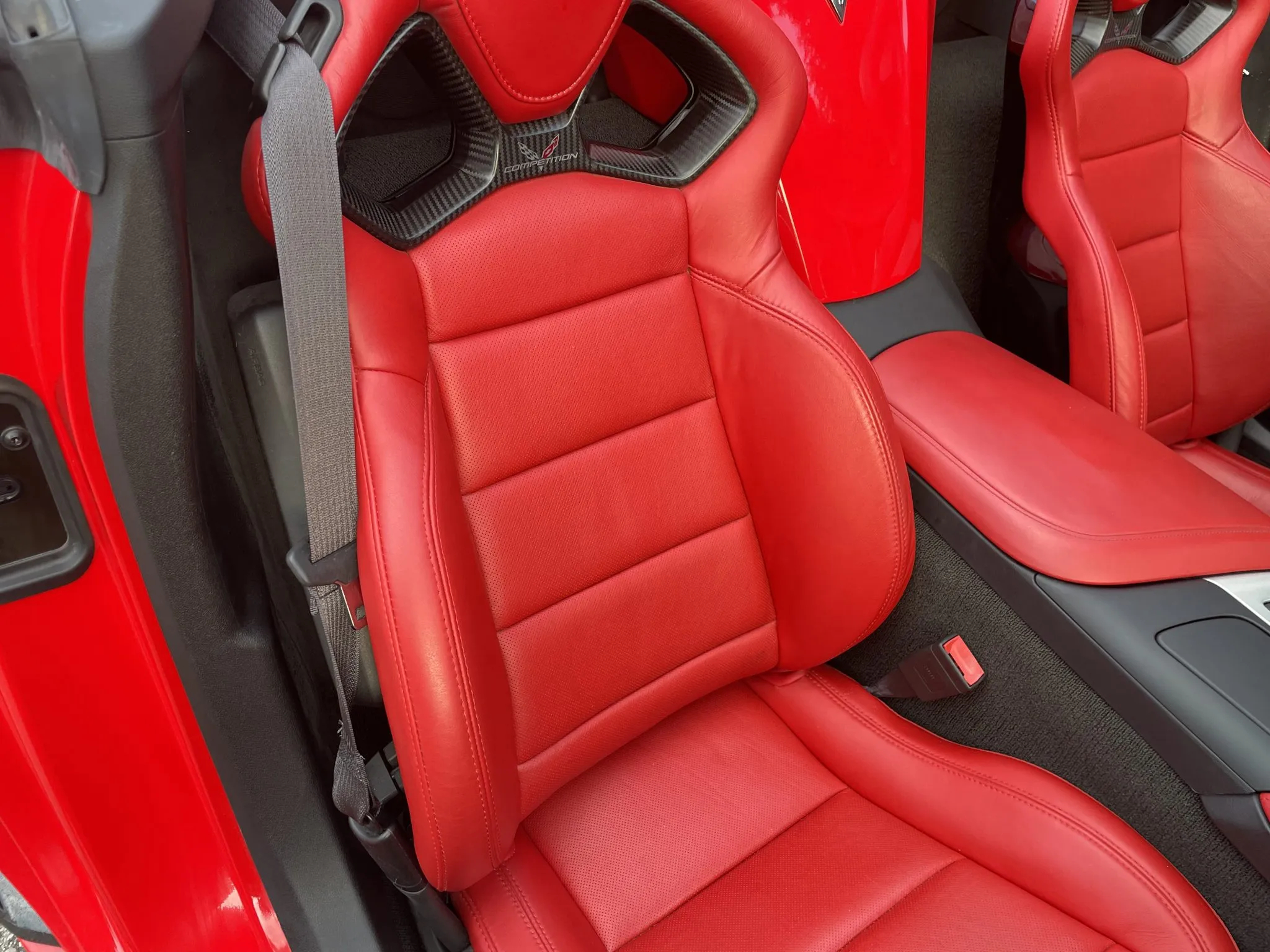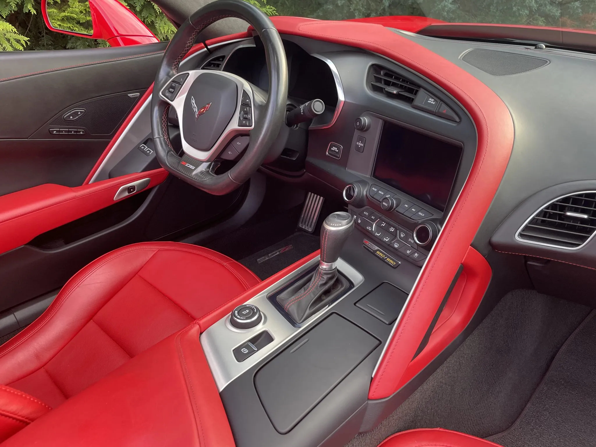 The 19″ and 20″ Z06 chrome aluminum wheels are mounted with Michelin Pilot Sport All Season 4 tires, and the seller states two tires were recently replaced. The car is equipped with Magnetic Ride Control, Performance Traction Management, and an Active Handling System. Stopping power is provided by red-finished Brembo brake calipers over slotted and ventilated rotors at each corner.