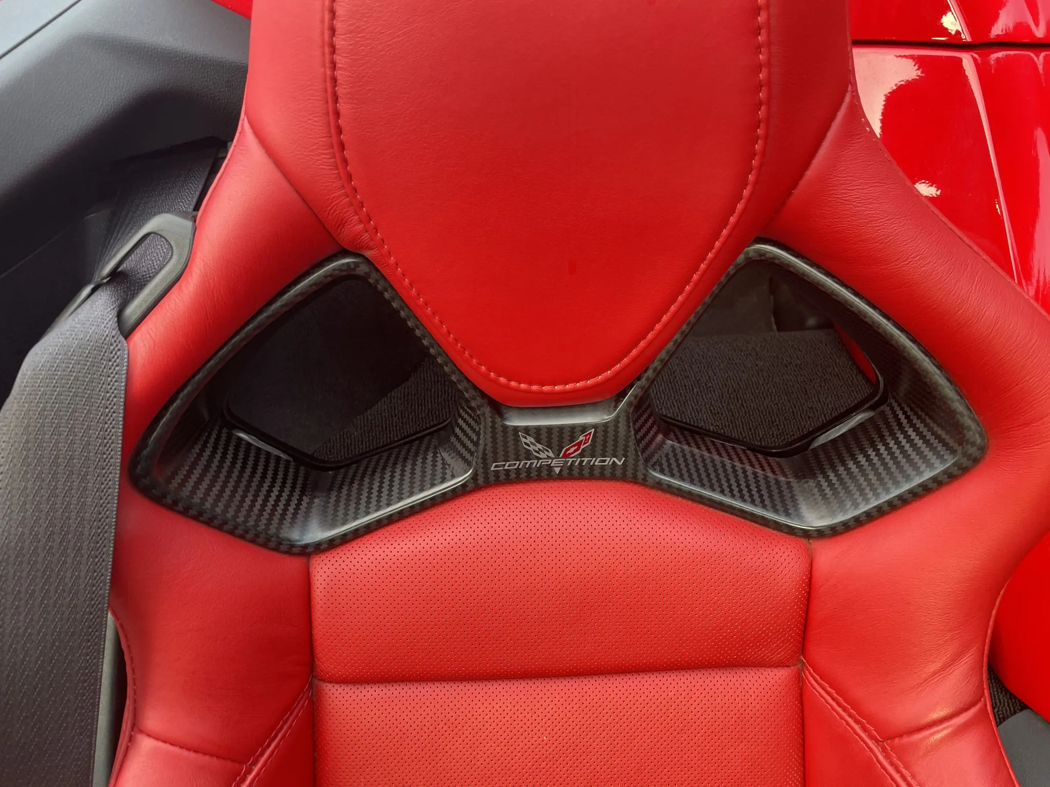The cockpit features heated and ventilated Competition Sport bucket seats upholstered in Adrenaline Red leather. Interior features include a head-up display, a 10-speaker Bose sound system, keyless-entry, a performance data recorder, automatic climate control, cruise control, and a touchscreen infotainment system with navigation.