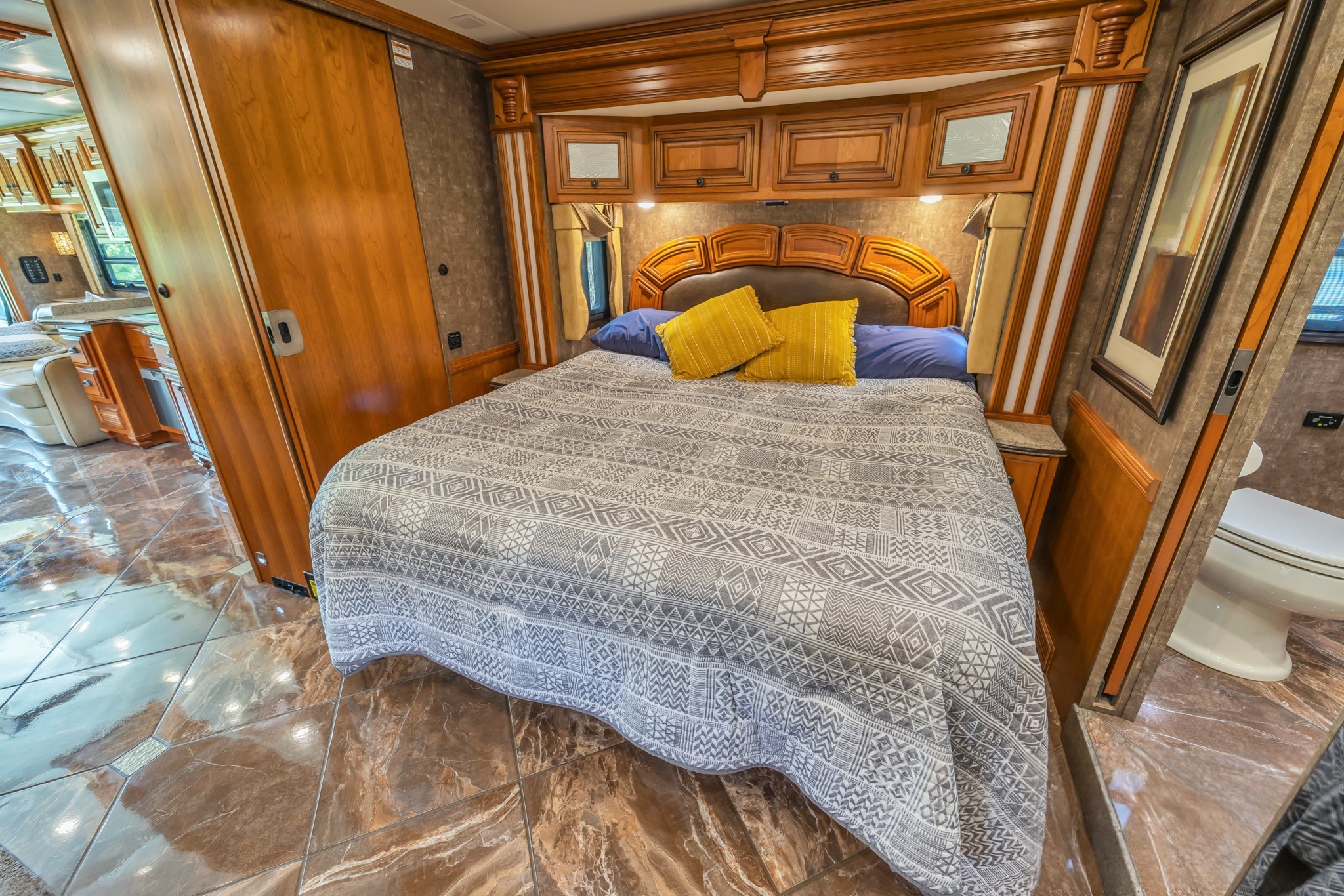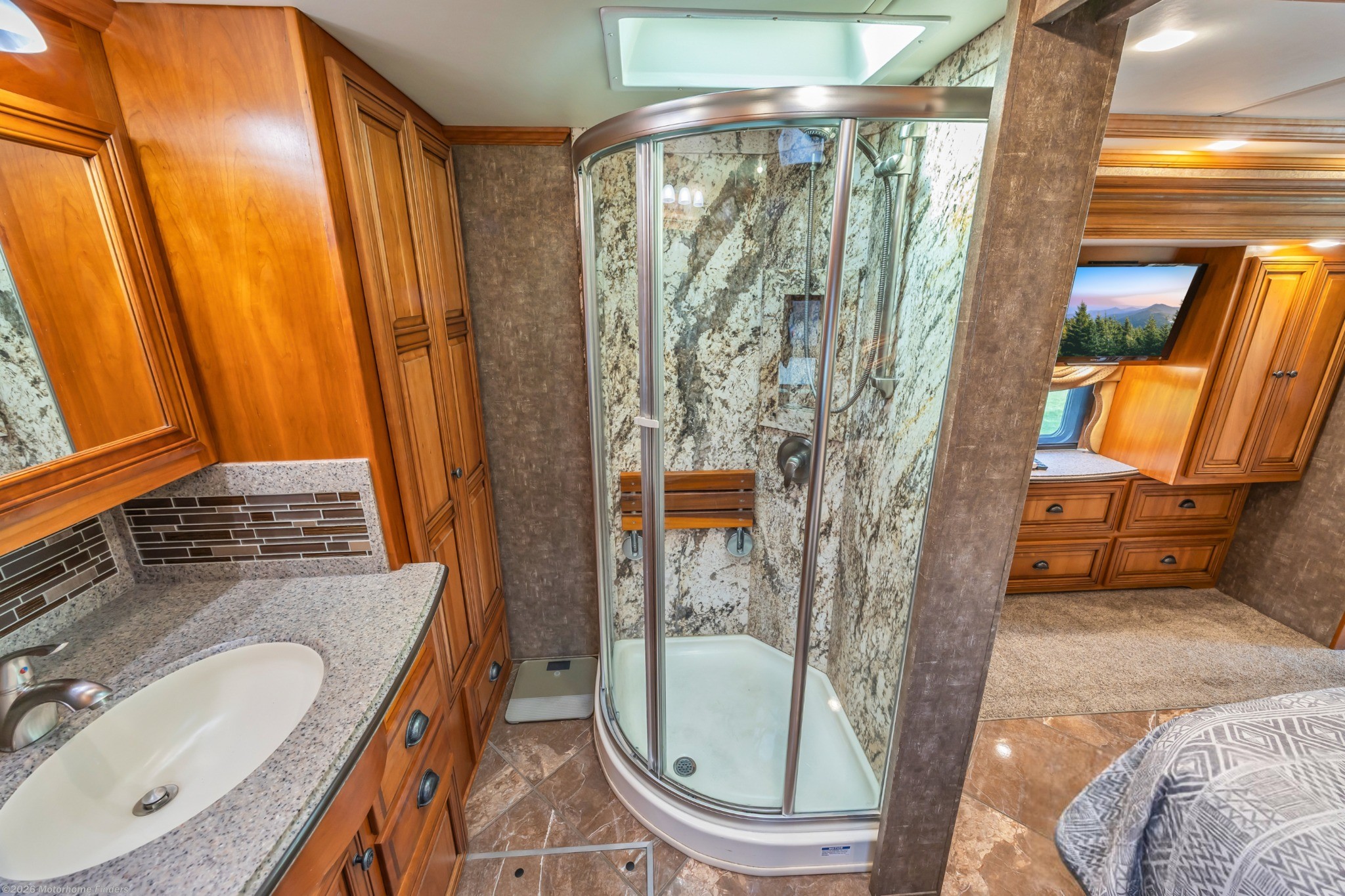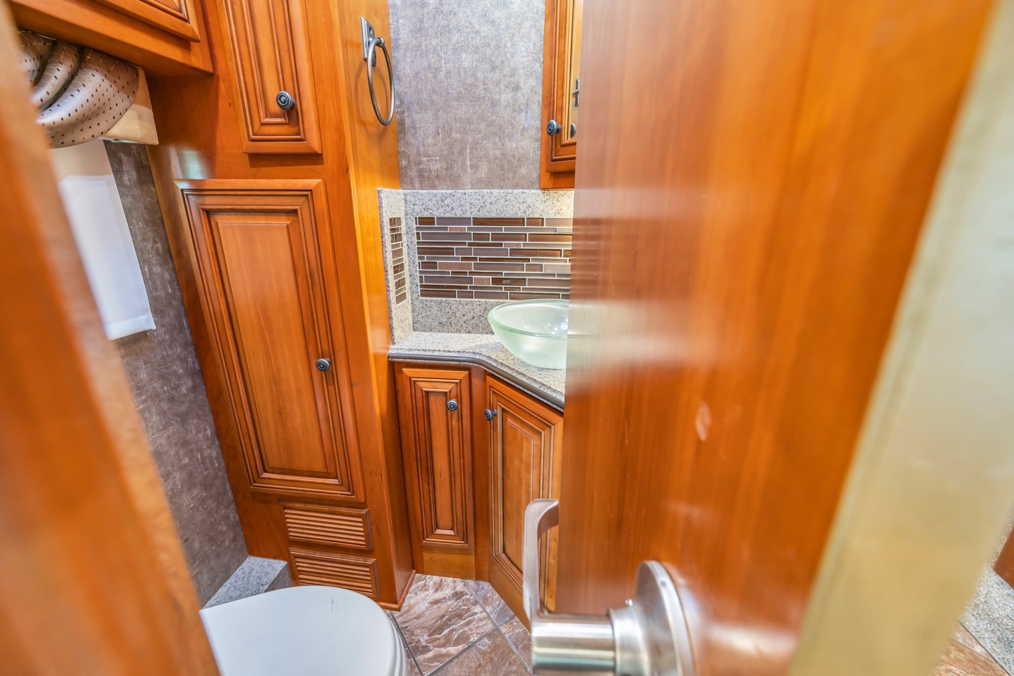 Cordova Décor with Carmel Glazed Cherry Cabinetry – Warm, residential styling with handcrafted Newmar woodwork.
