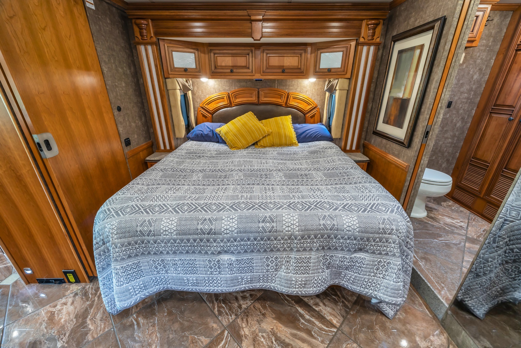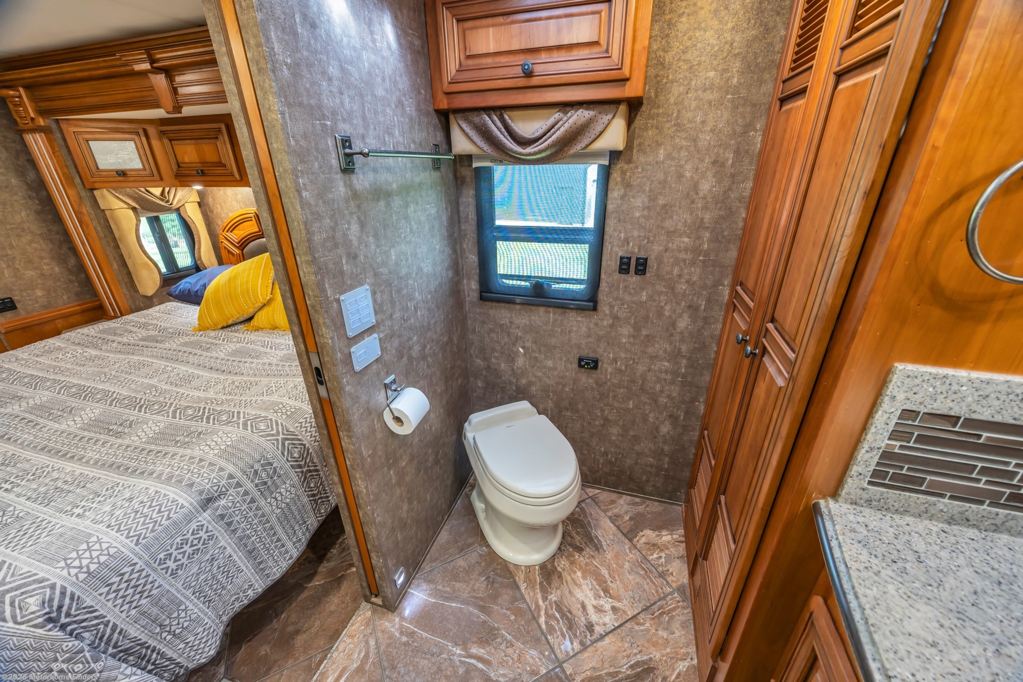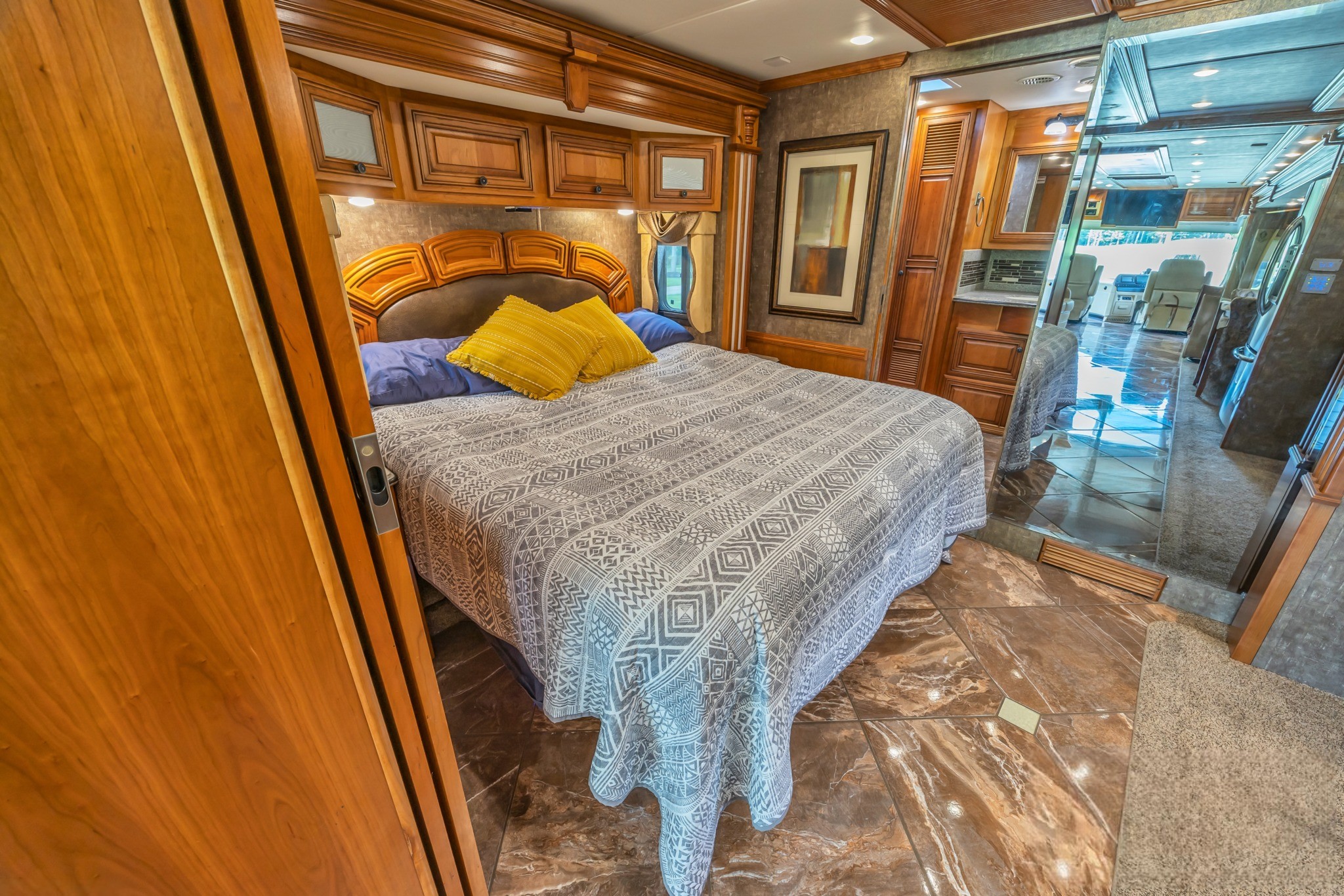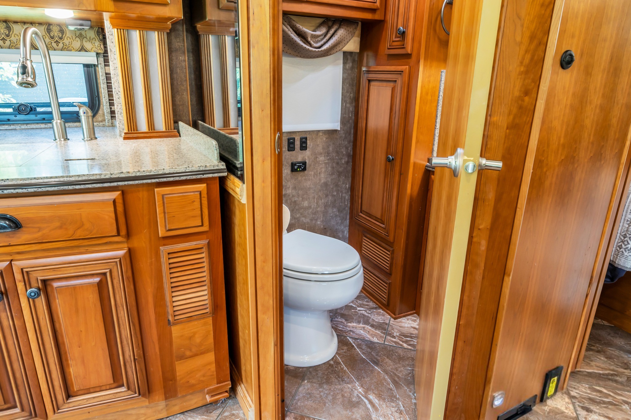 Cordova Décor with Carmel Glazed Cherry Cabinetry – Warm, residential styling with handcrafted Newmar woodwork.