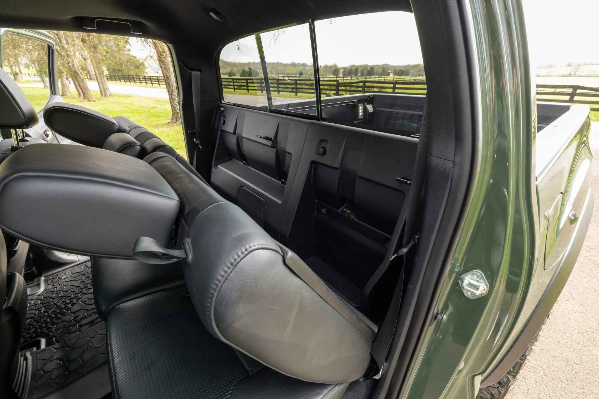 The truck is finished in Army Green (6V7) and is equipped with an aftermarket front bumper with a Warn winch as well as a hood scoop, a sunroof, LED headlights, Rigid fog lights, and a receiver hitch. The rear cargo area features tailgate protection and a 120-volt power outlet.