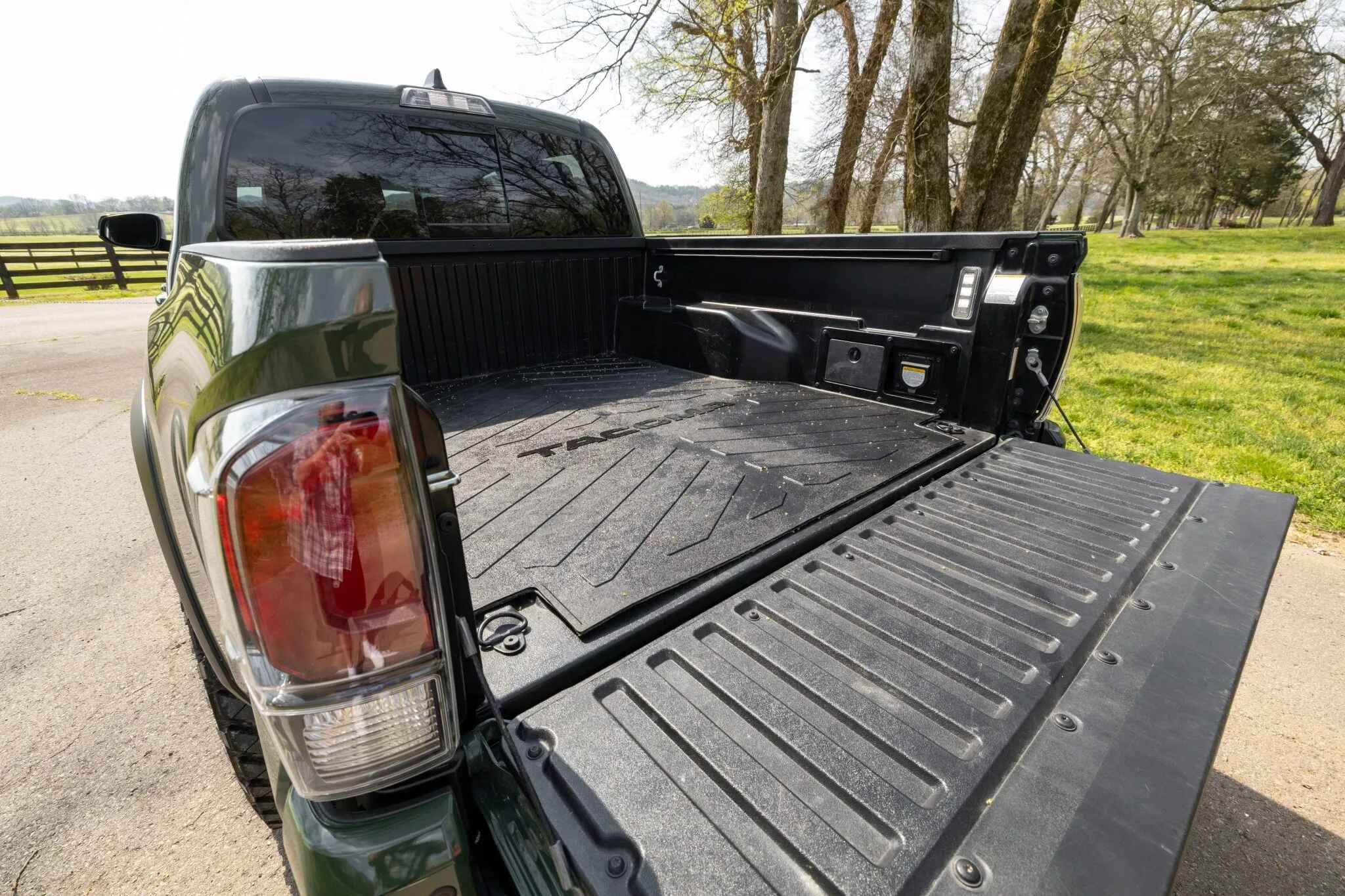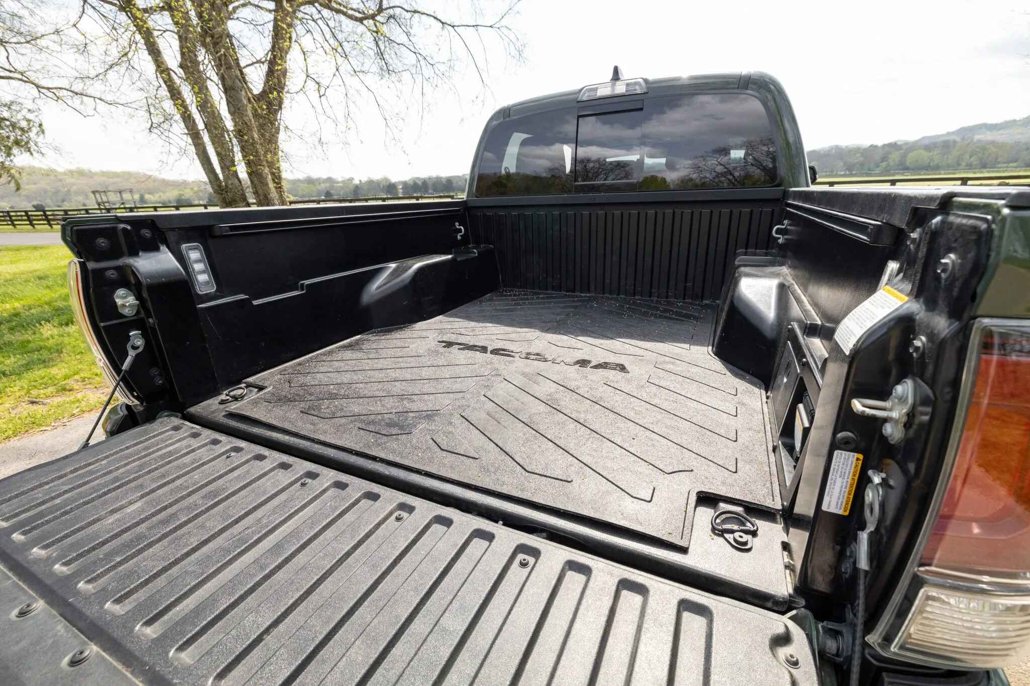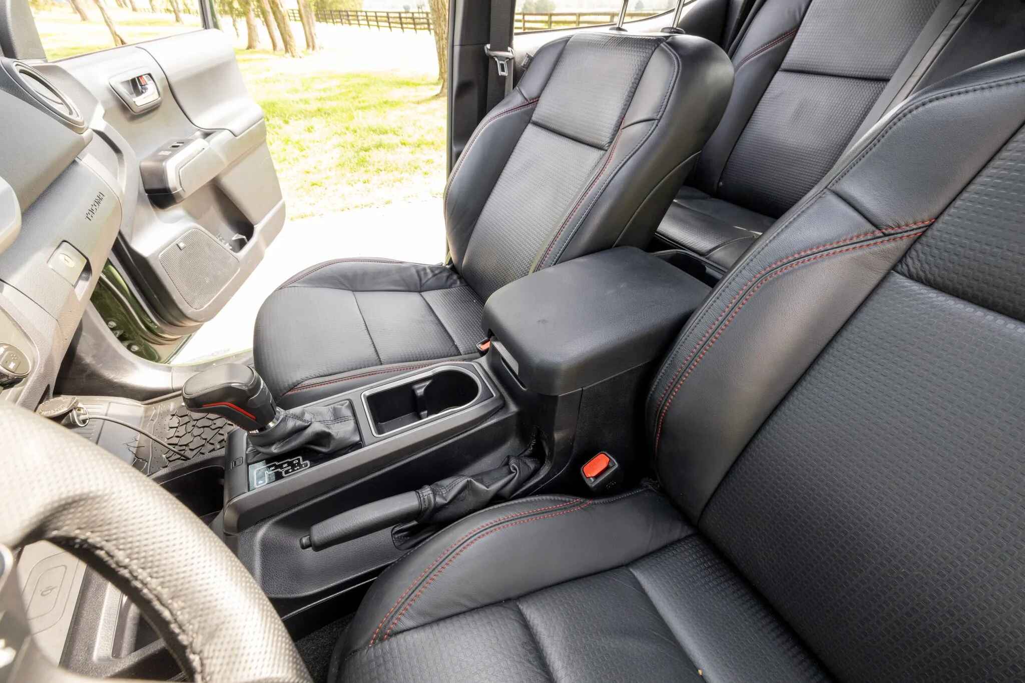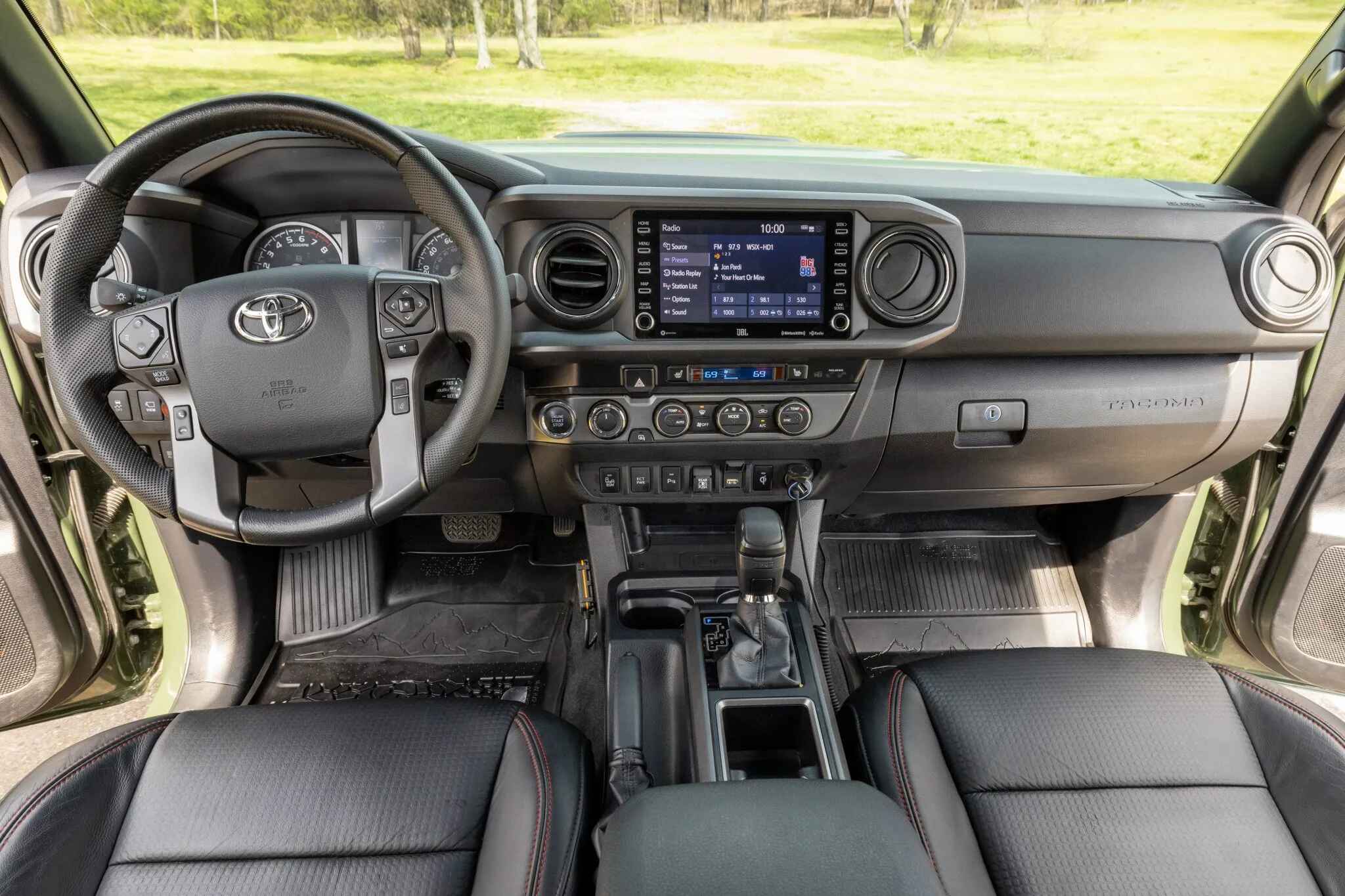 The heated front seats and rear bench are trimmed in black leather upholstery with contrasting stitching. Amenities include a Pedal Commander, dual-zone automatic climate control, a wireless charging pad, a powered sliding rear window, Tacoma-branded floor mats, and a JBL touchscreen infotainment system with a CD player.
