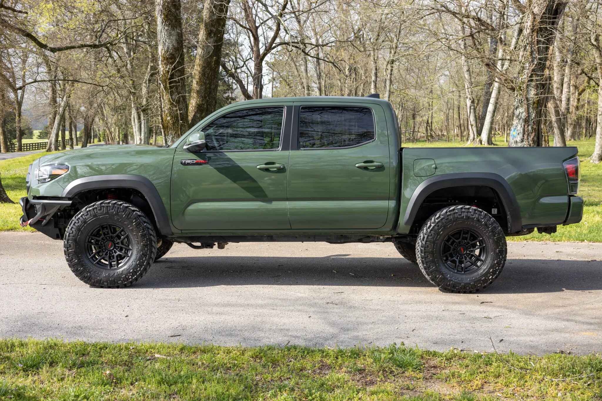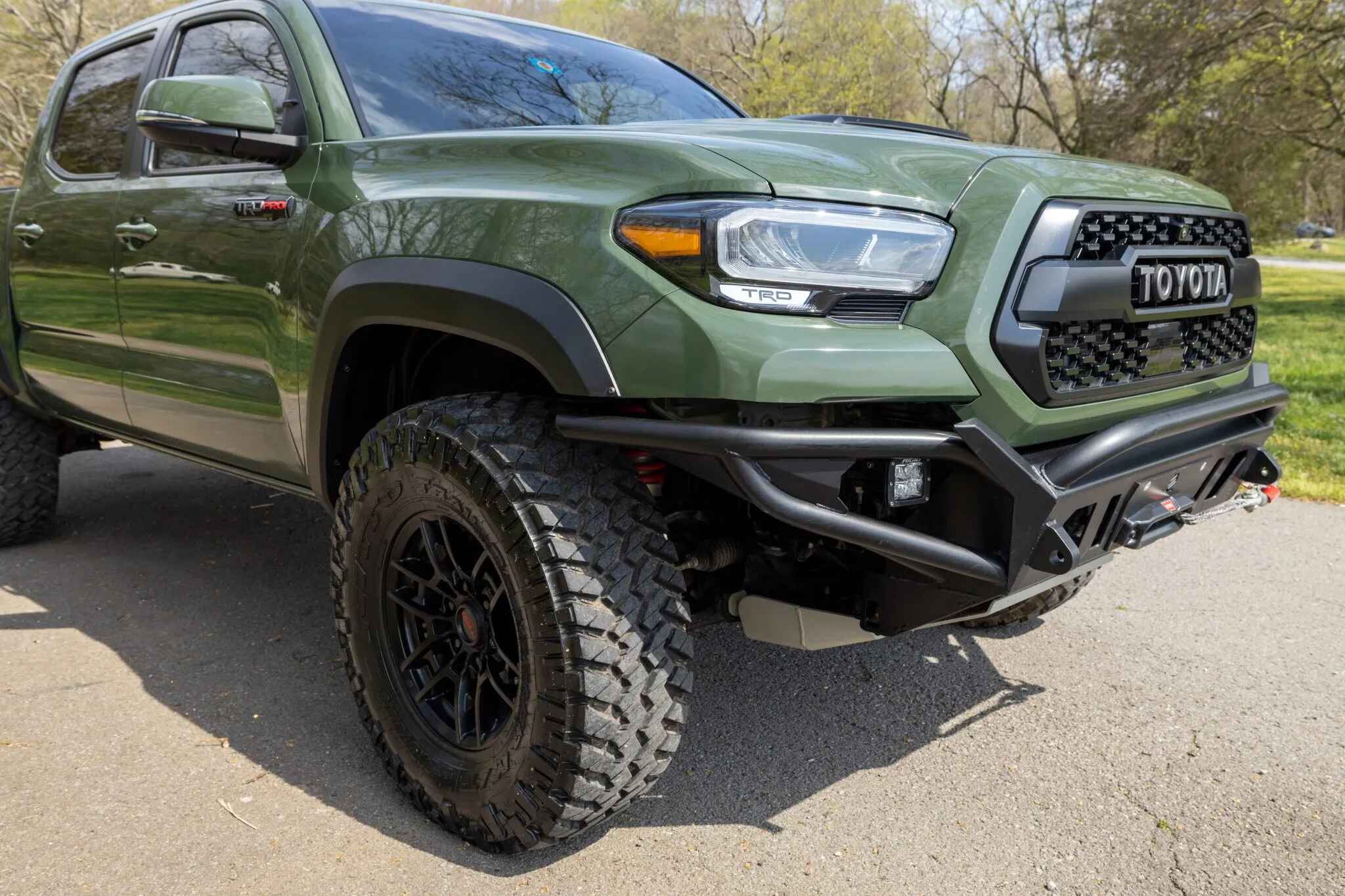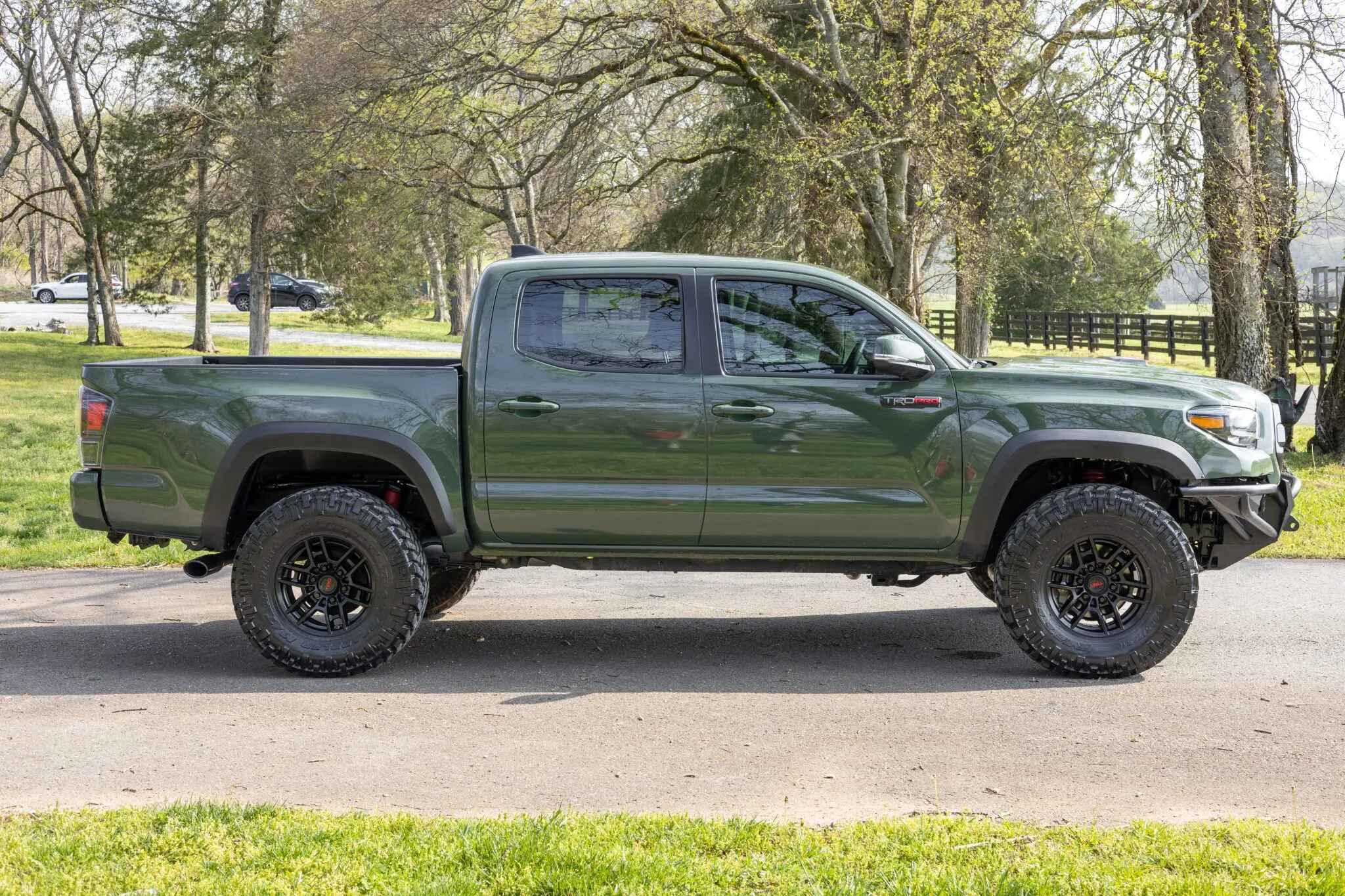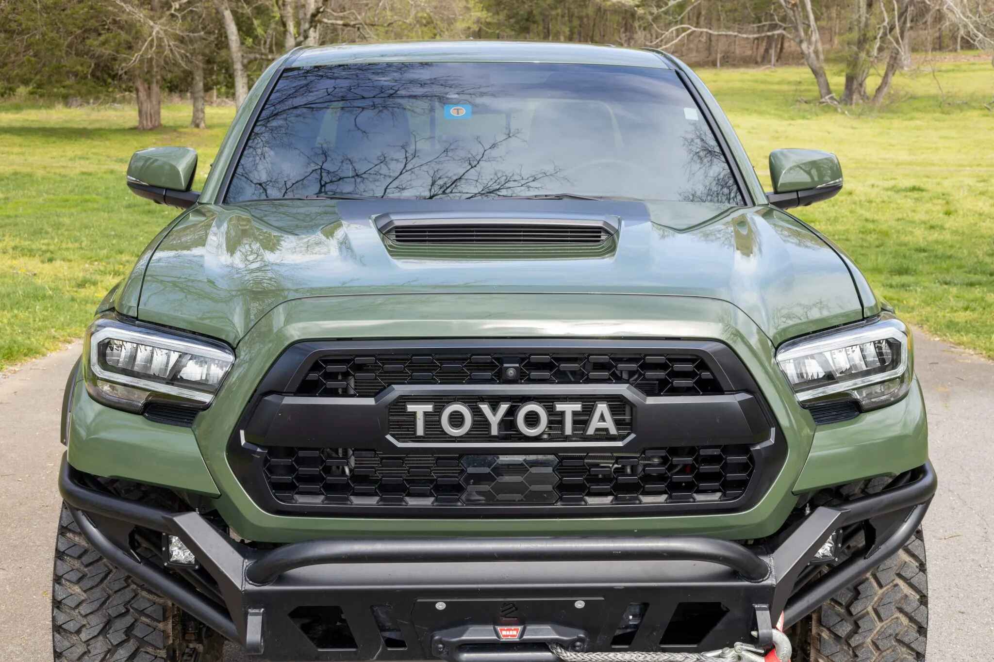This 2020 Toyota Tacoma TRD Pro is a double-cab pickup, finished in Army Green over black leather. Power comes from a 3.5-liter V6 linked to a six-speed automatic transmission, a dual-range transfer case, and a locking rear differential. Additional equipment includes an aftermarket front bumper with a Warn winch, a TRD Pro front skid plate, 16″ TRD wheels, LED headlights, Rigid fog lights, a sunroof, parking sensors, dual-zone automatic climate control, heated and power-adjustable front seats, a wireless charging pad, and a JBL touchscreen infotainment system with a CD player.