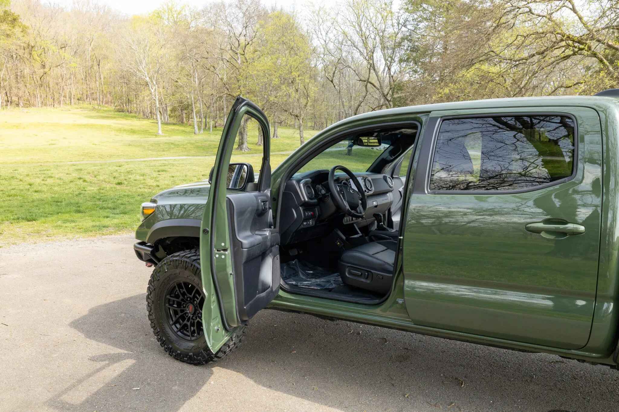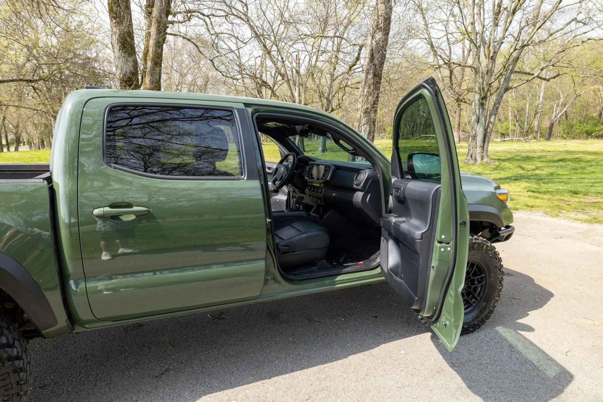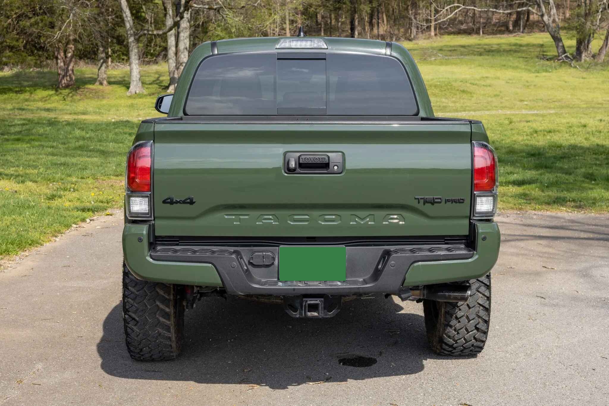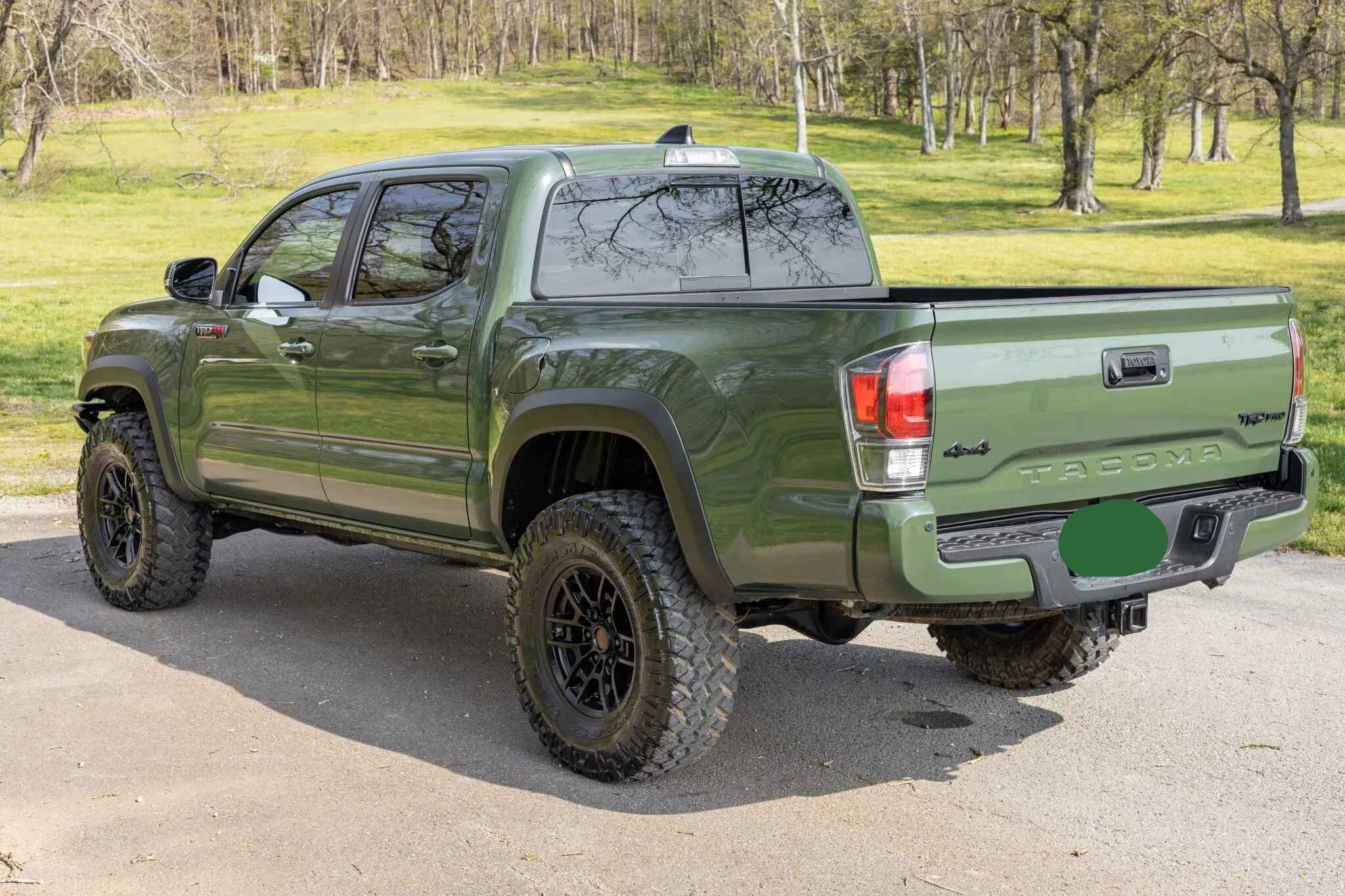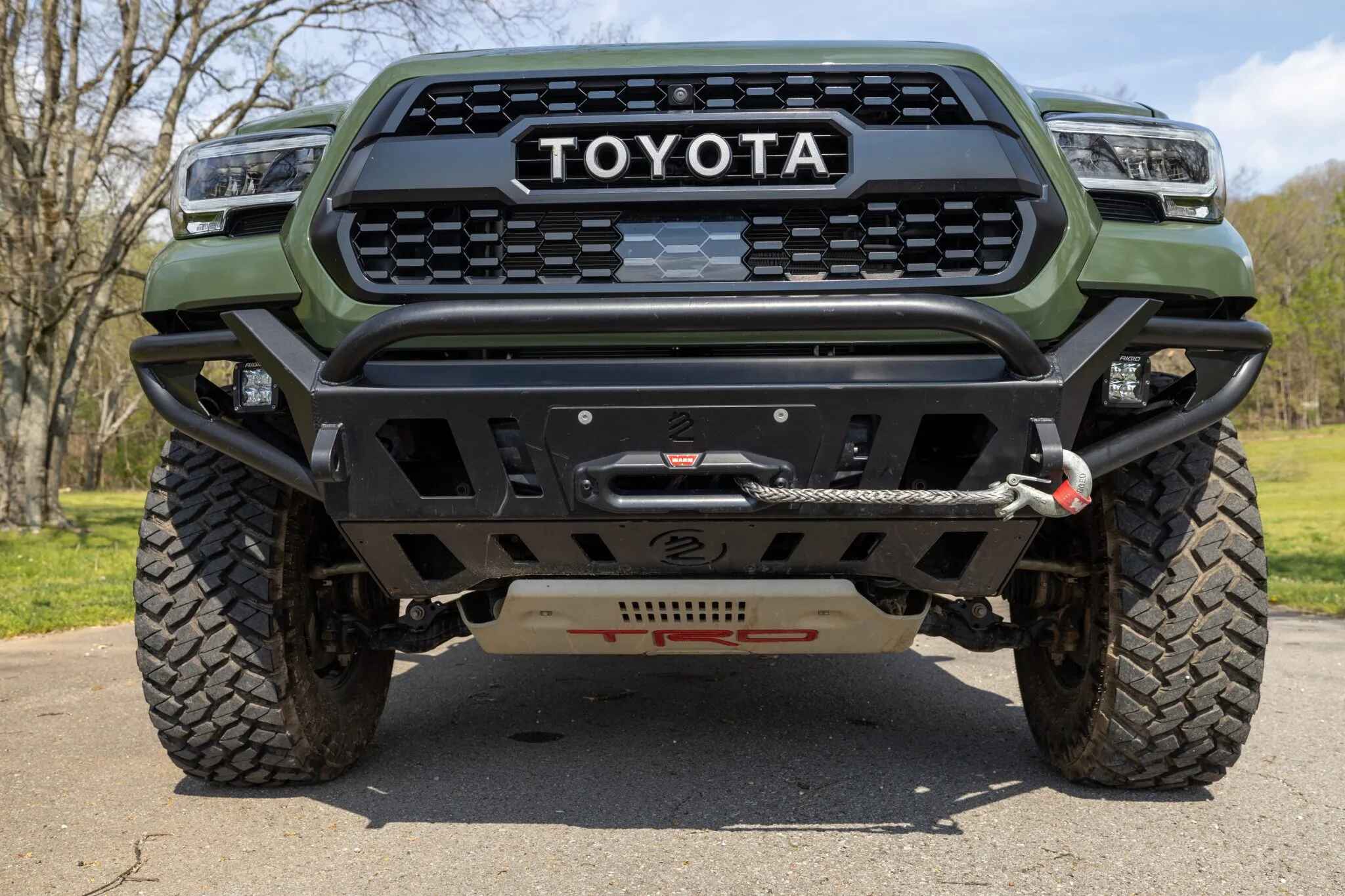 This 2020 Toyota Tacoma TRD Pro is a double-cab pickup, finished in Army Green over black leather. Power comes from a 3.5-liter V6 linked to a six-speed automatic transmission, a dual-range transfer case, and a locking rear differential. Additional equipment includes an aftermarket front bumper with a Warn winch, a TRD Pro front skid plate, 16″ TRD wheels, LED headlights, Rigid fog lights, a sunroof, parking sensors, dual-zone automatic climate control, heated and power-adjustable front seats, a wireless charging pad, and a JBL touchscreen infotainment system with a CD player.
