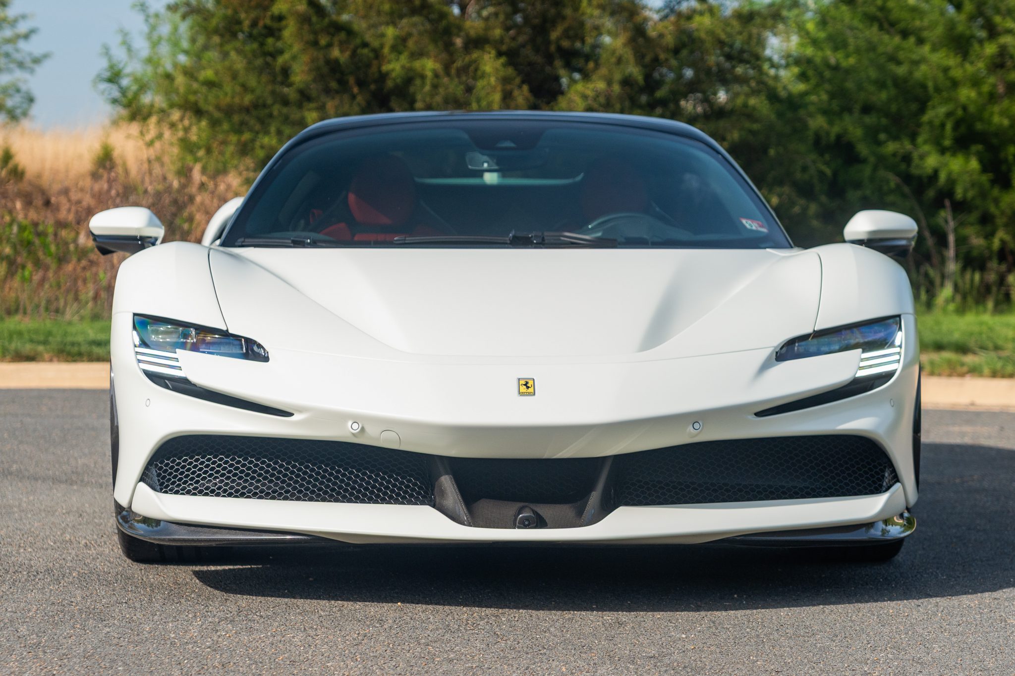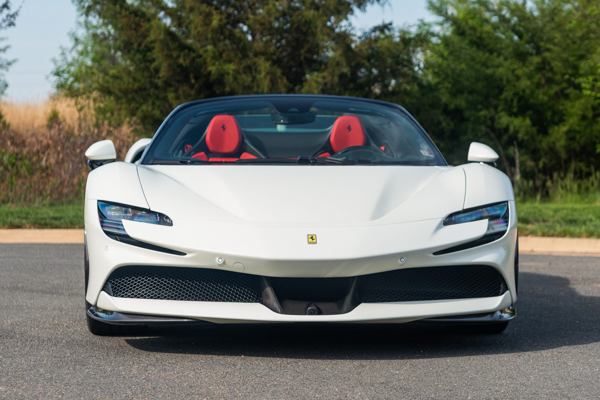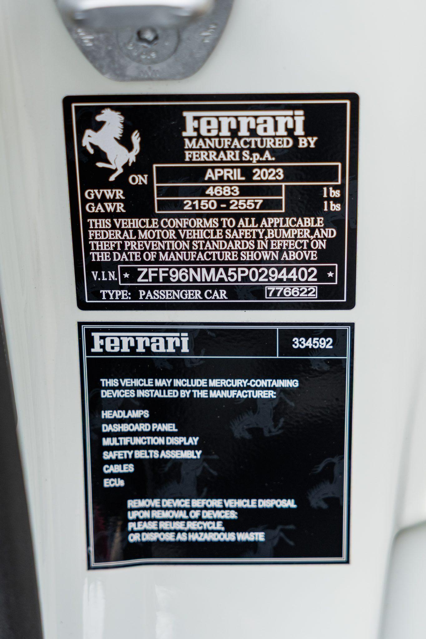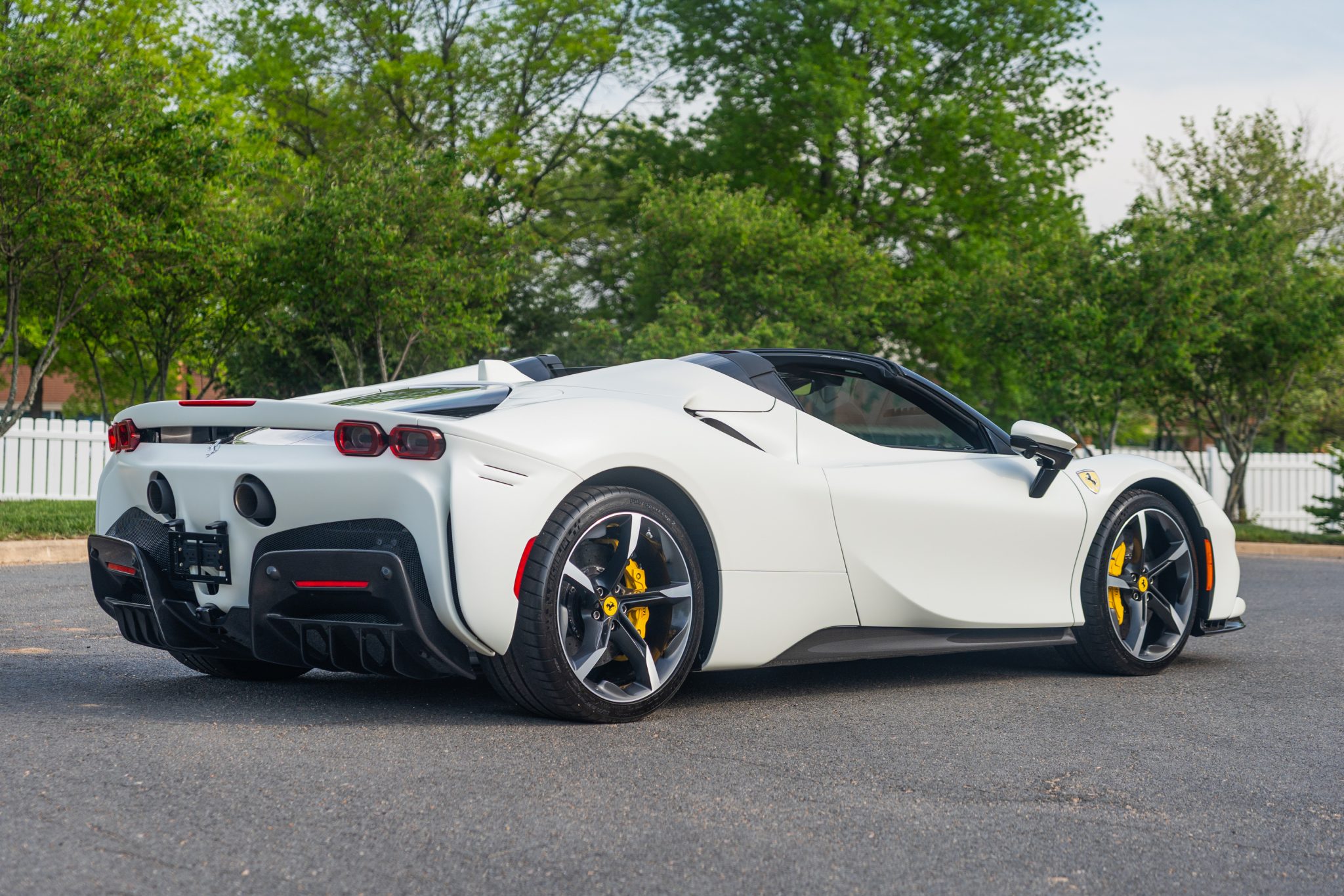 This example is finished in Bianco Avus with a carbon-fiber rear diffuser, front splitter, side skirts, engine cover trim, and side air splitters. Additional details include adaptive headlights, Scuderia Ferrari fender shields, a power-retractable hardtop, and front and rear parking sensors. A Formula 1–inspired drag-reduction system utilizes active aerodynamics, a two-piece rear wing, and underbody vortex generators. Satin paint protection film has been applied to the body.
