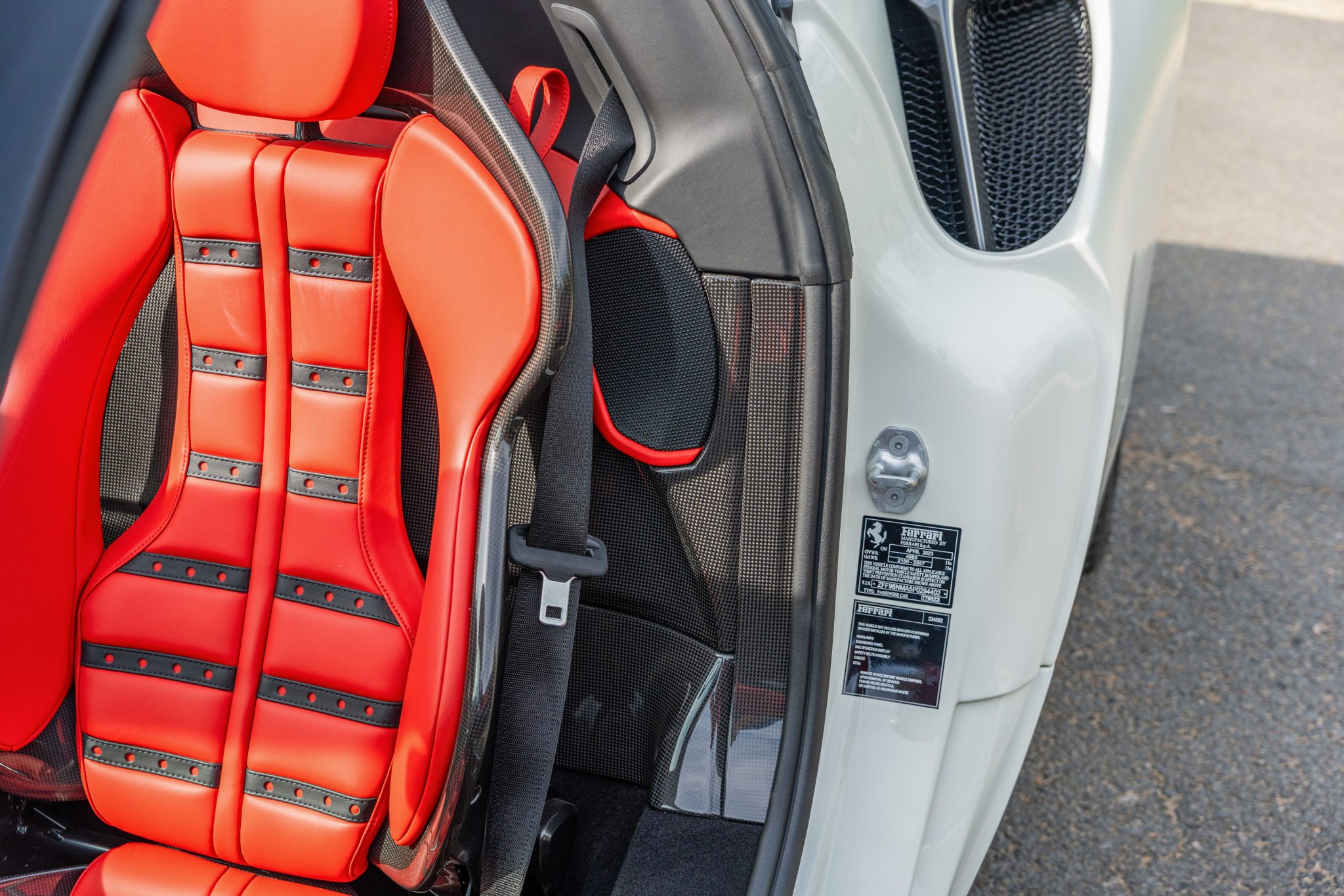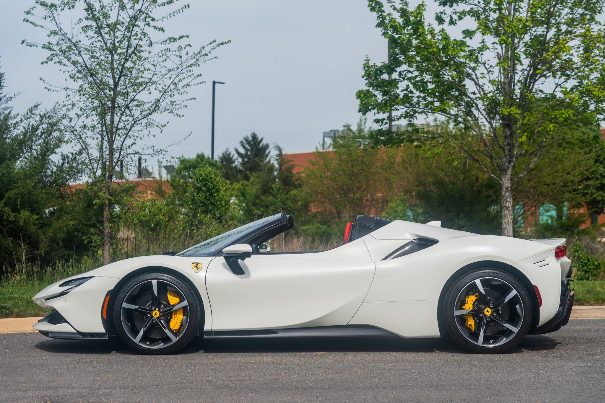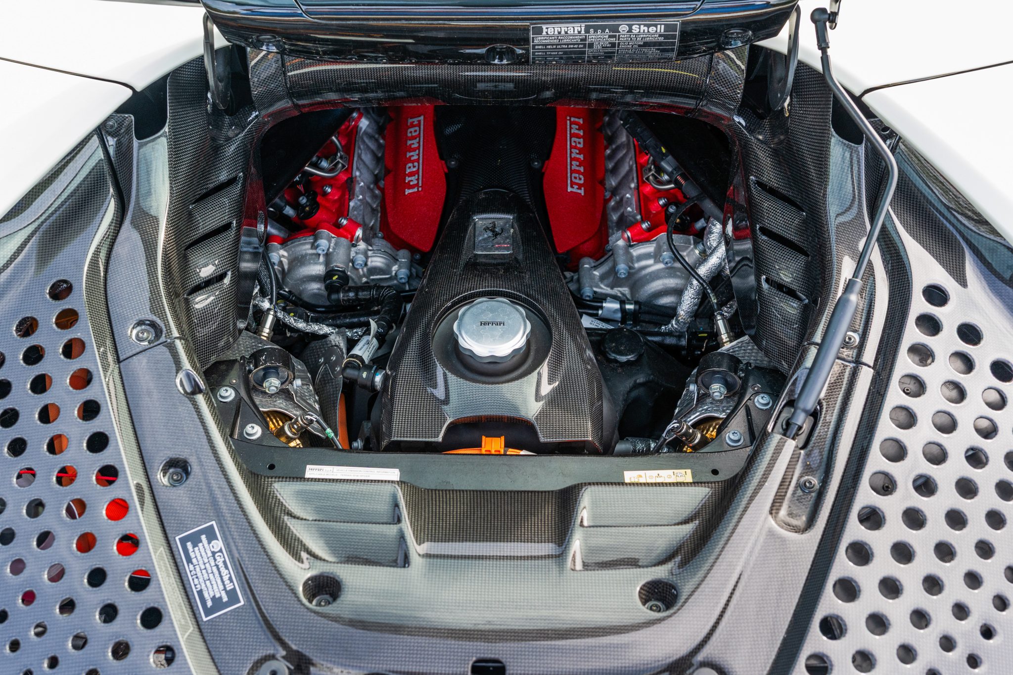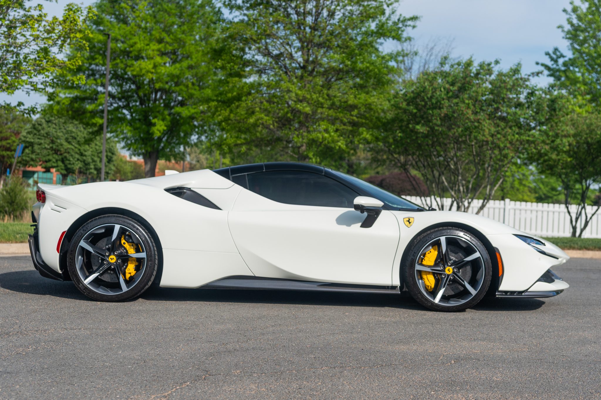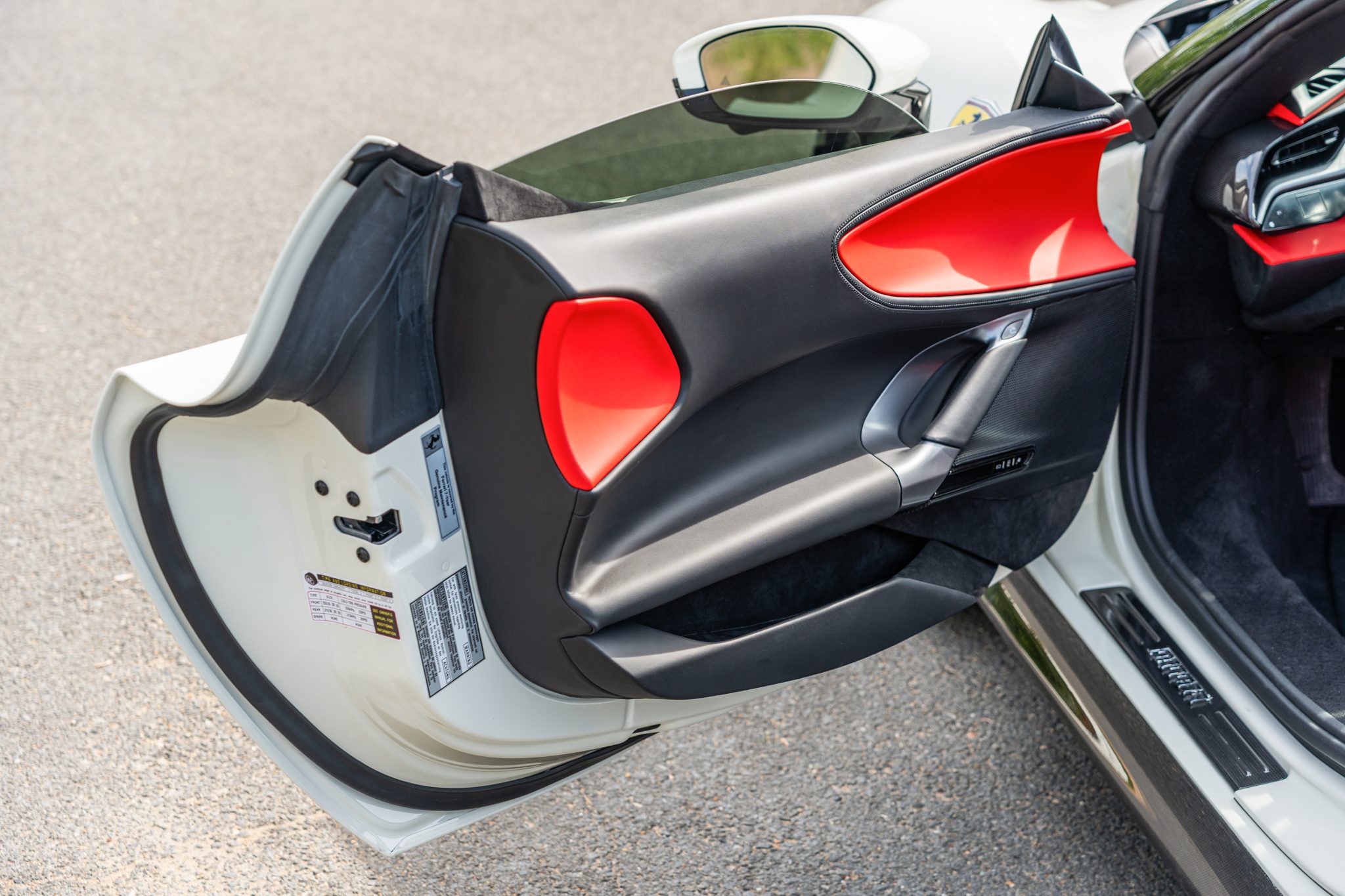 This example is finished in Bianco Avus with a carbon-fiber rear diffuser, front splitter, side skirts, engine cover trim, and side air splitters. Additional details include adaptive headlights, Scuderia Ferrari fender shields, a power-retractable hardtop, and front and rear parking sensors. A Formula 1–inspired drag-reduction system utilizes active aerodynamics, a two-piece rear wing, and underbody vortex generators. Satin paint protection film has been applied to the body.