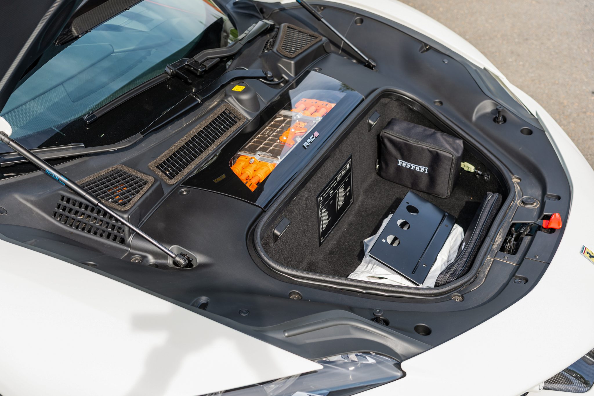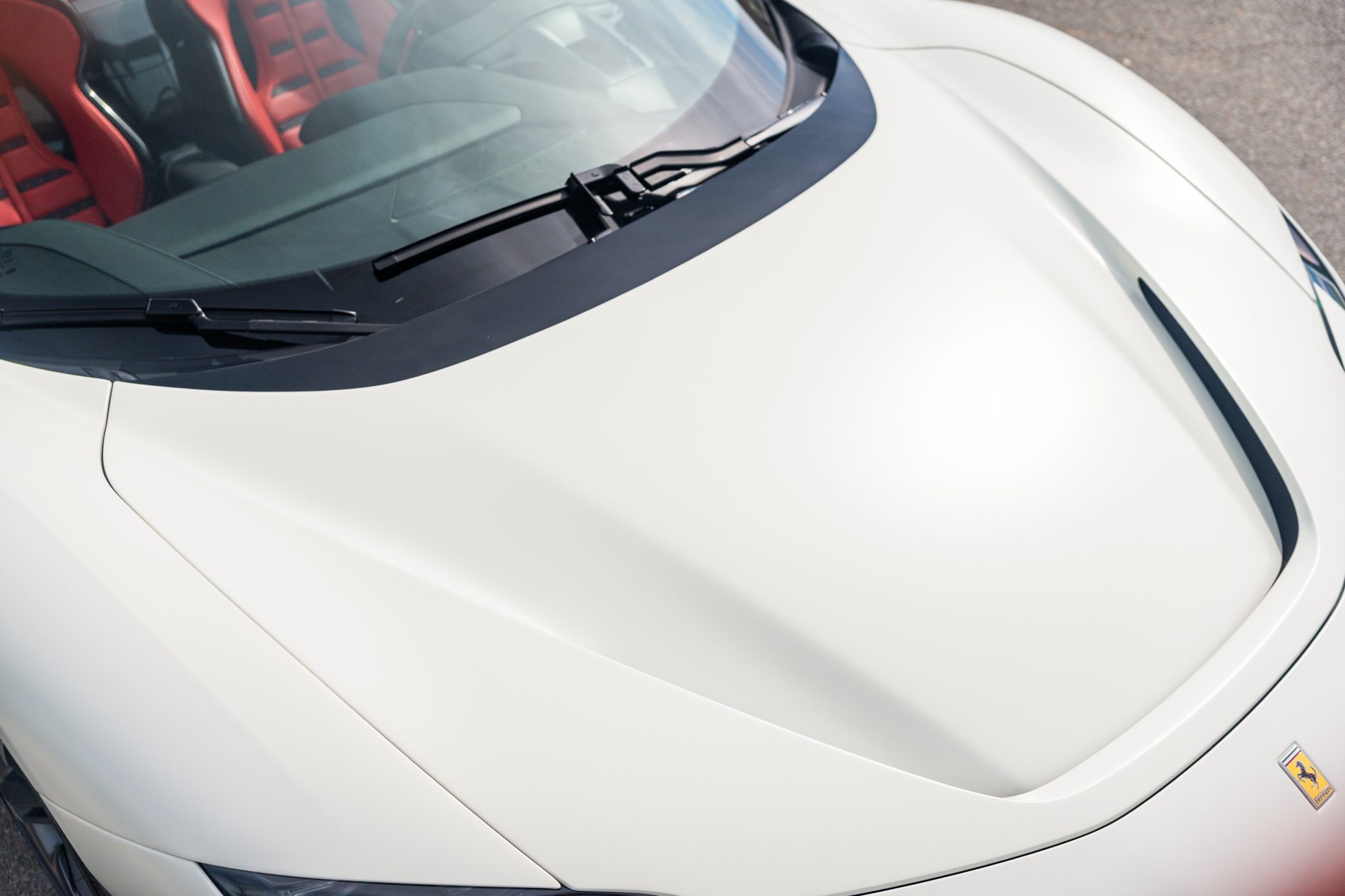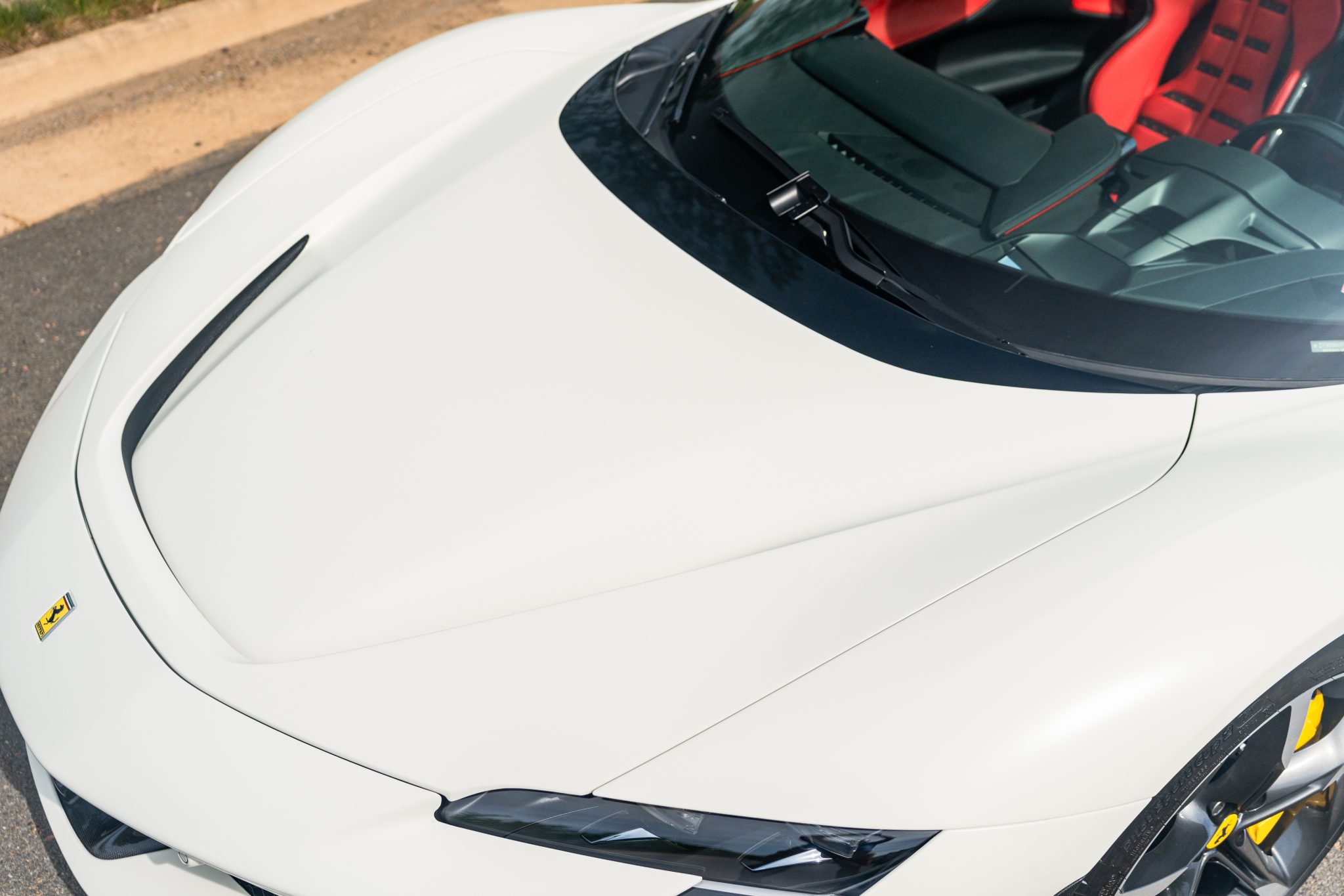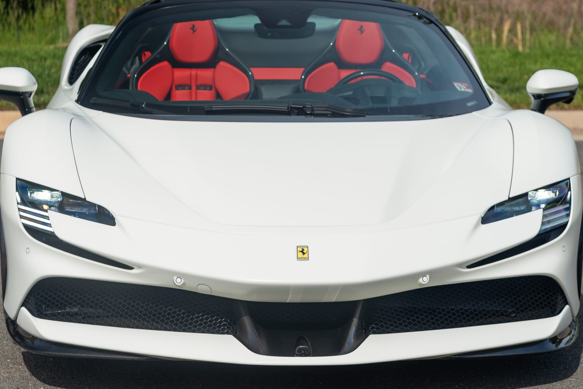 This example is finished in Bianco Avus with a carbon-fiber rear diffuser, front splitter, side skirts, engine cover trim, and side air splitters. Additional details include adaptive headlights, Scuderia Ferrari fender shields, a power-retractable hardtop, and front and rear parking sensors. A Formula 1–inspired drag-reduction system utilizes active aerodynamics, a two-piece rear wing, and underbody vortex generators. Satin paint protection film has been applied to the body.