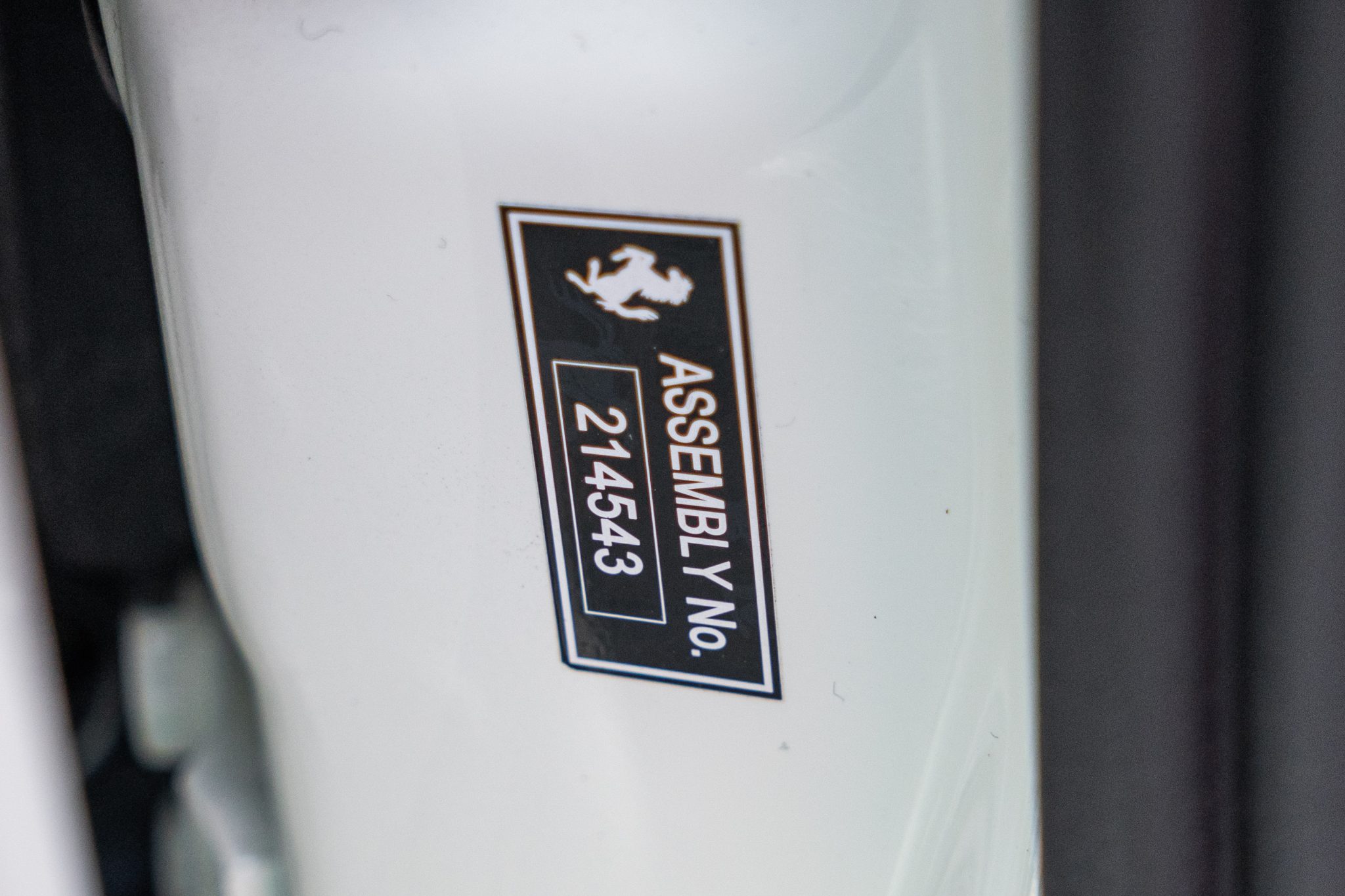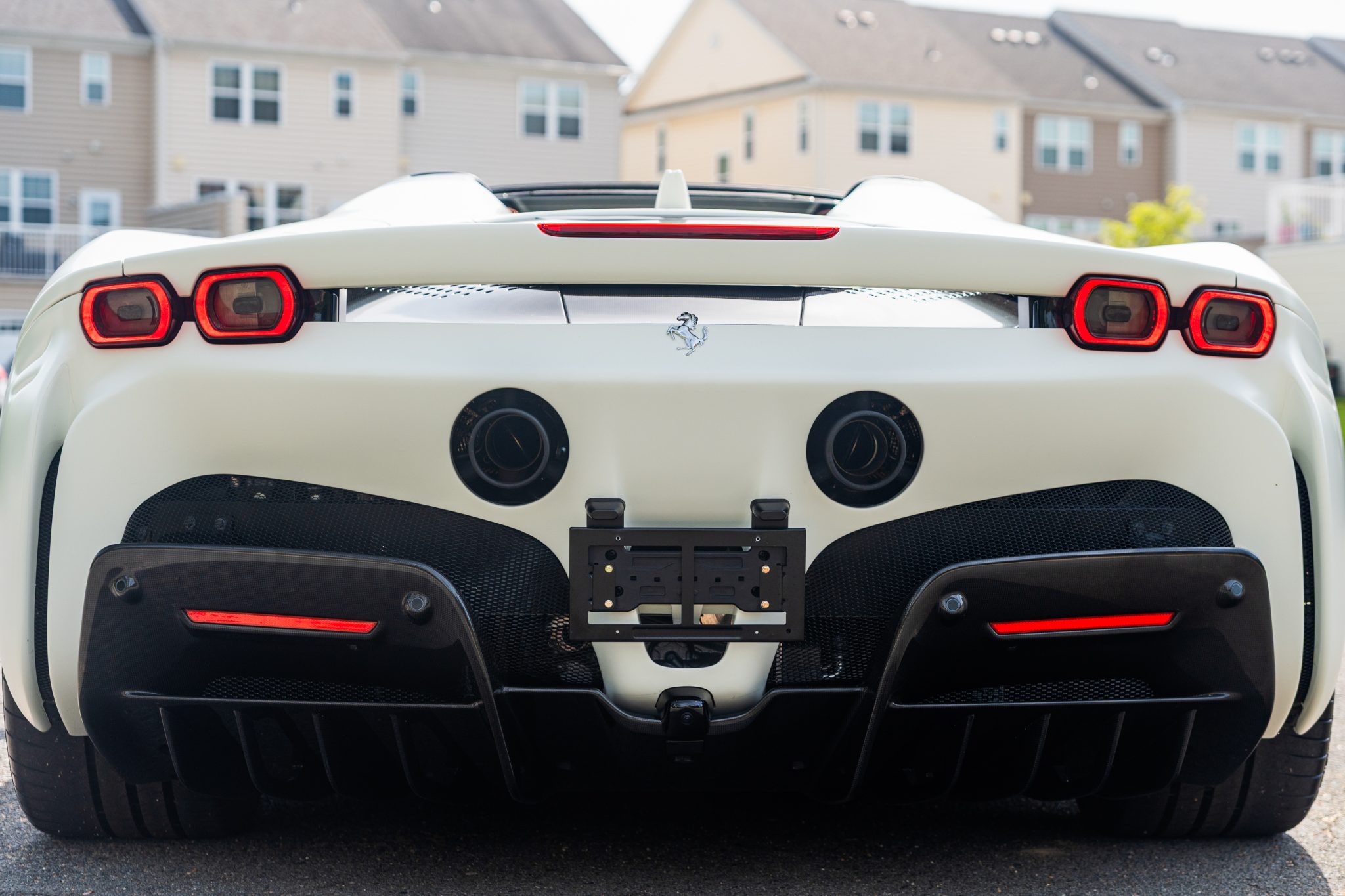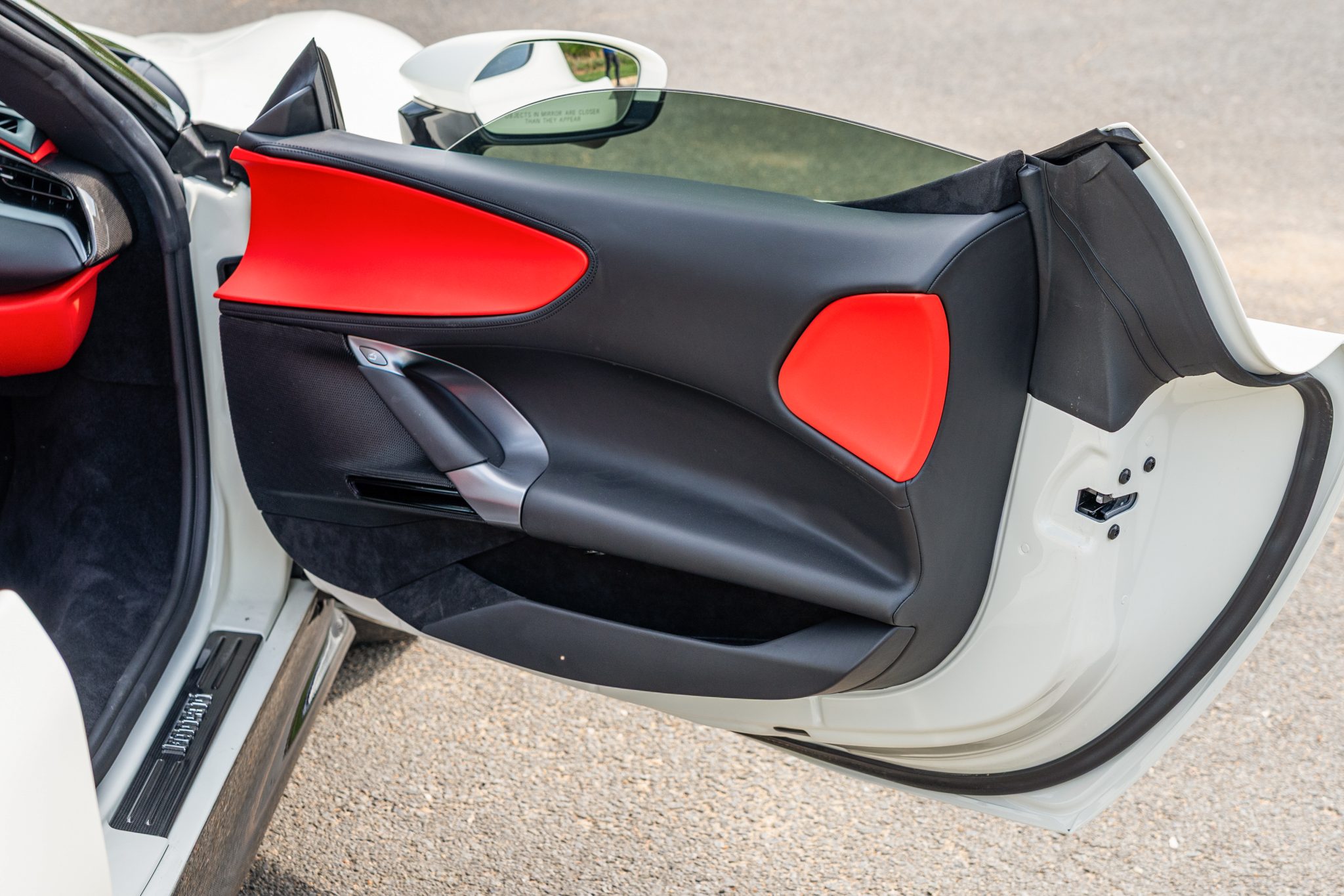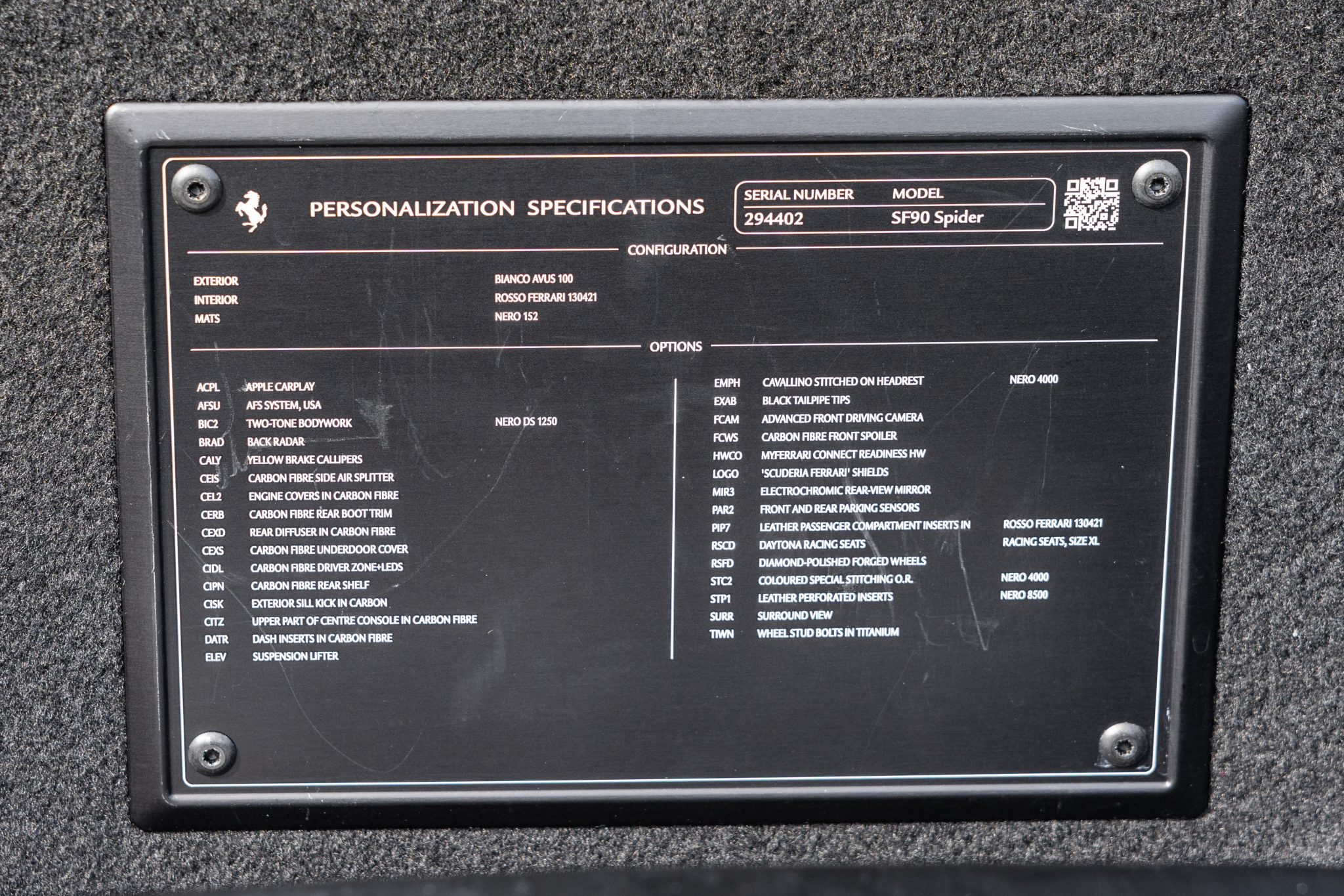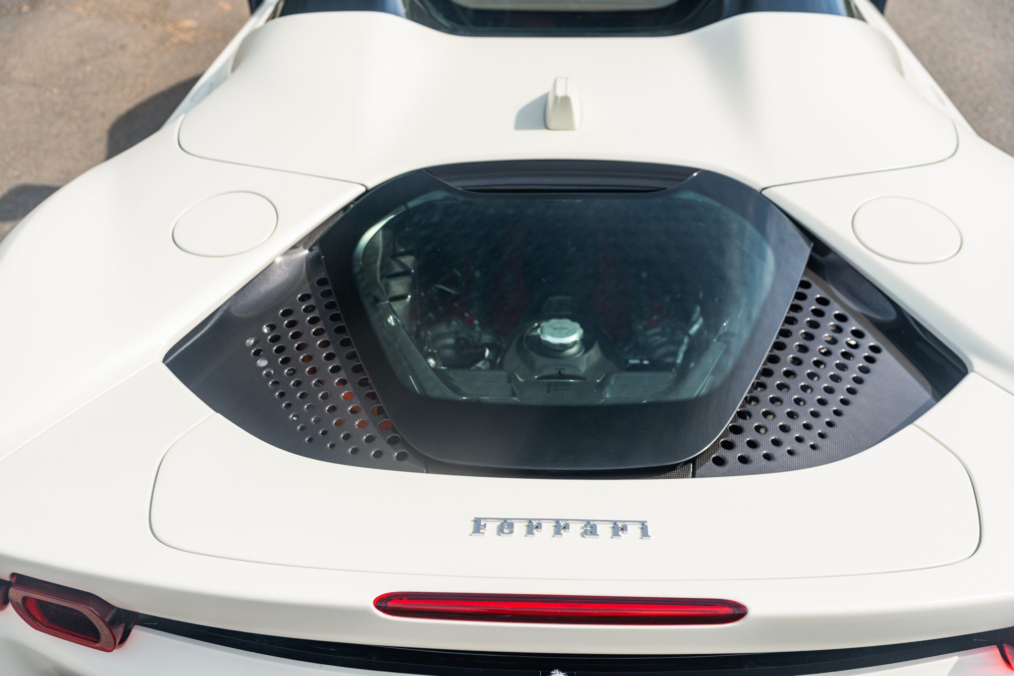 This example is finished in Bianco Avus with a carbon-fiber rear diffuser, front splitter, side skirts, engine cover trim, and side air splitters. Additional details include adaptive headlights, Scuderia Ferrari fender shields, a power-retractable hardtop, and front and rear parking sensors. A Formula 1–inspired drag-reduction system utilizes active aerodynamics, a two-piece rear wing, and underbody vortex generators. Satin paint protection film has been applied to the body.