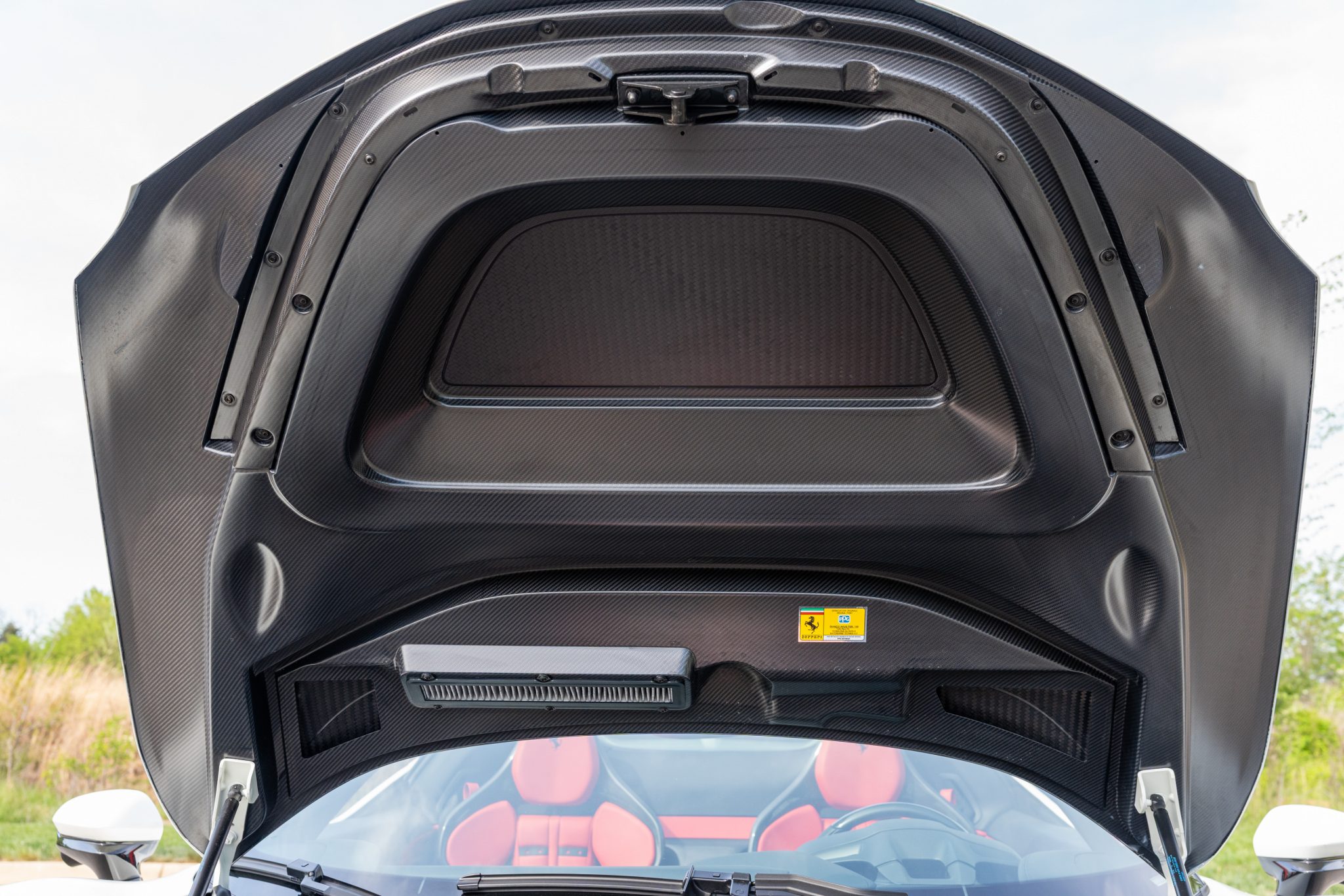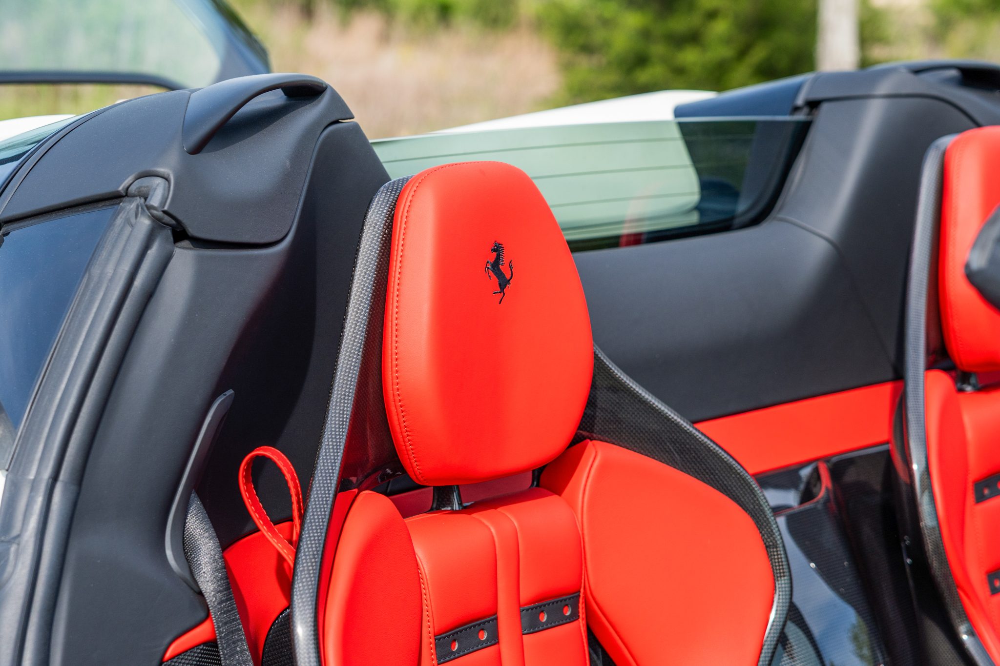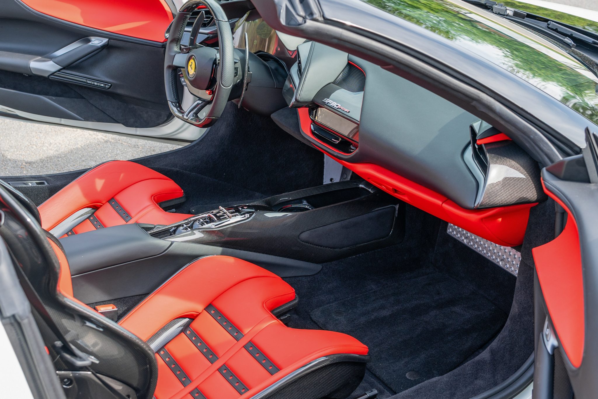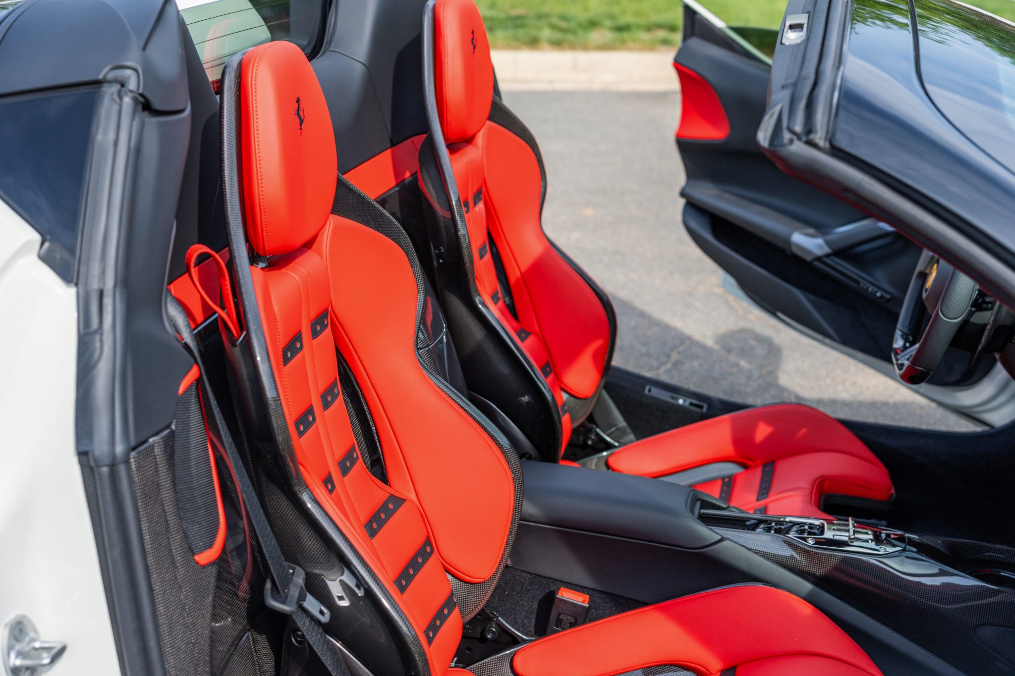 The Daytona-style carbon-fiber racing seats are trimmed in Rosso Ferrari leather with Cavallino Rampante logos on the headrests, while carbon-fiber trim accents the cabin. Additional appointments include an electrochromic rearview mirror, a surround-view camera system, Apple CarPlay, navigation, and dual-zone automatic climate control.