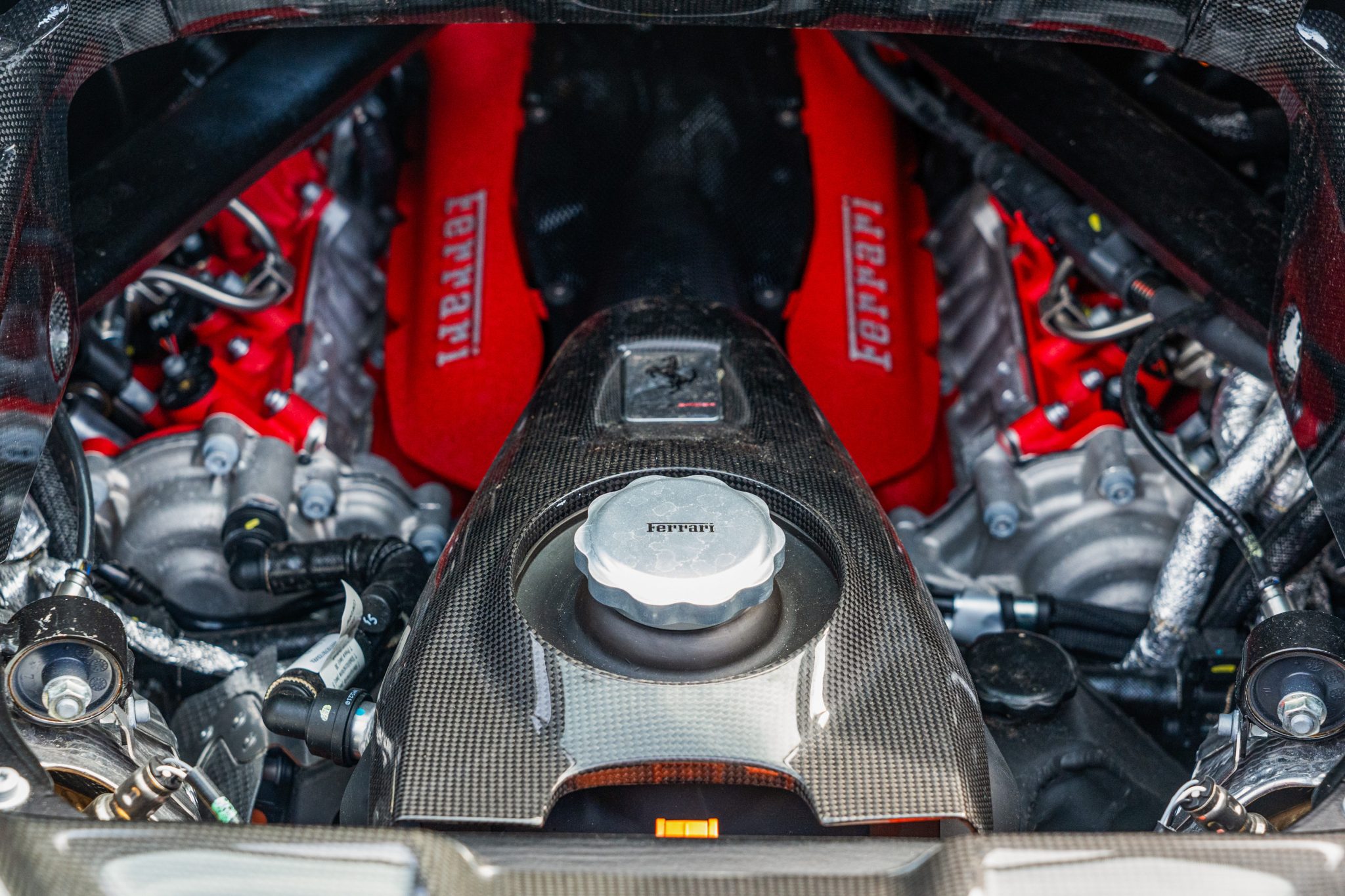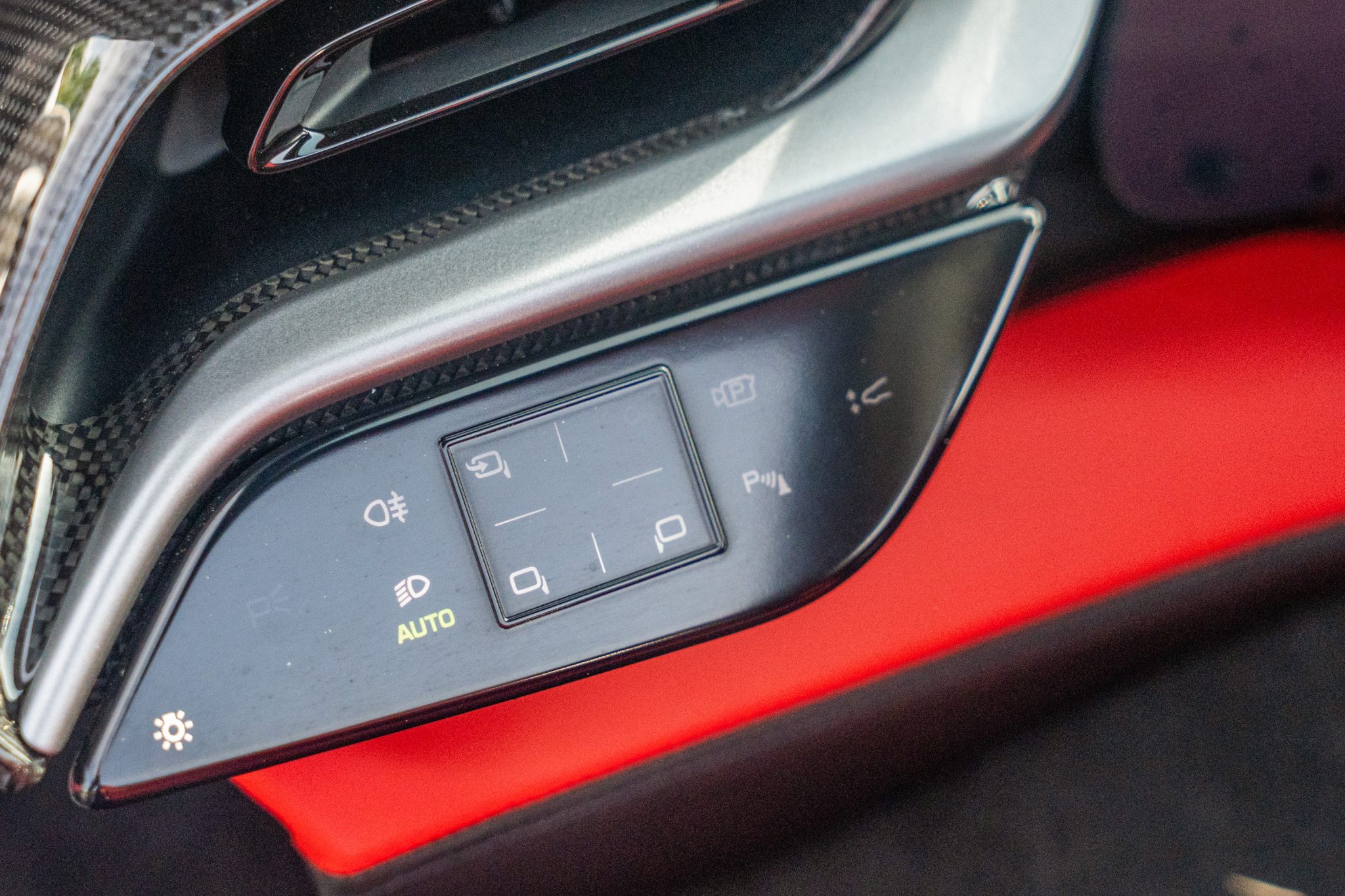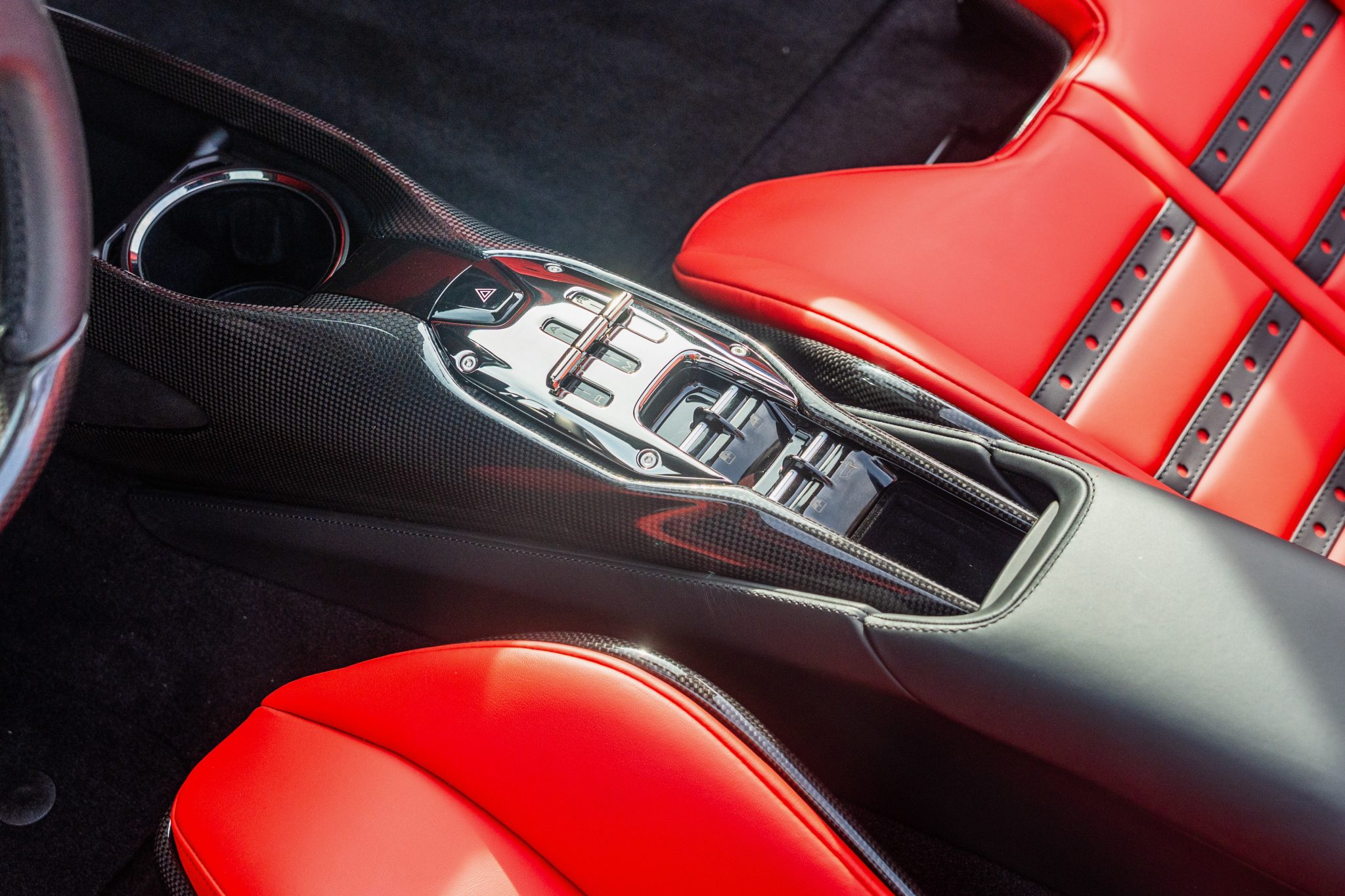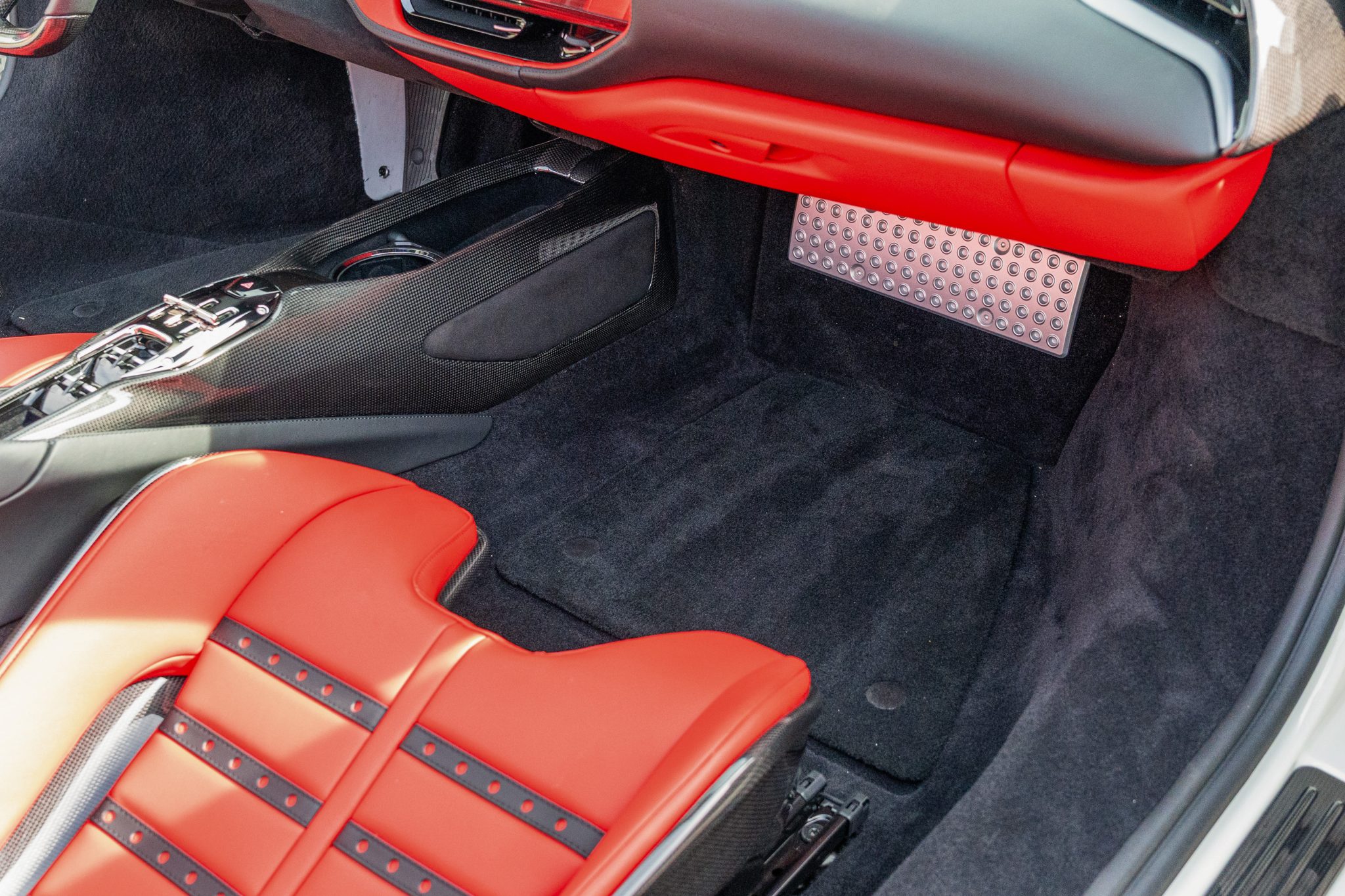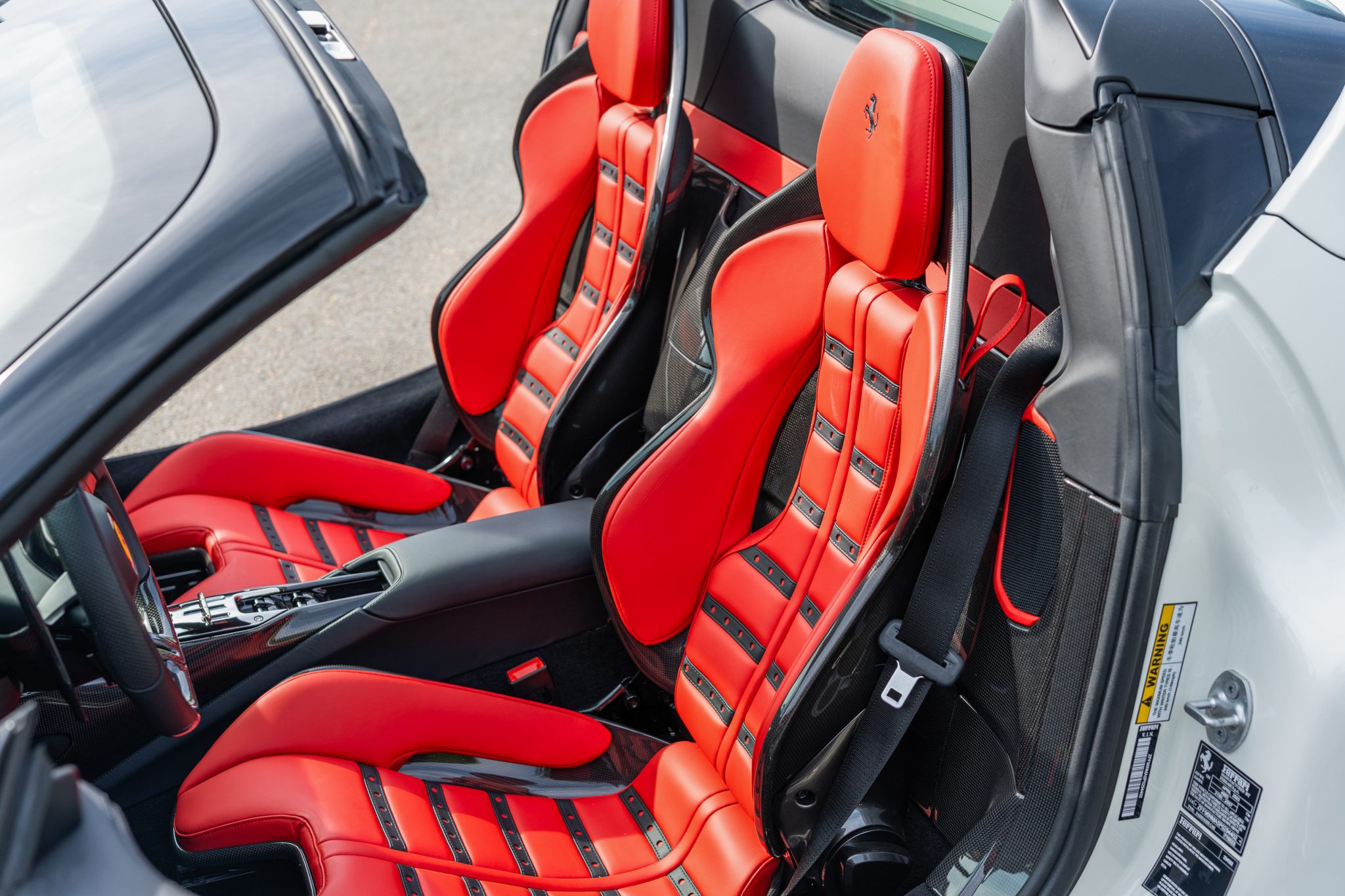 The Daytona-style carbon-fiber racing seats are trimmed in Rosso Ferrari leather with Cavallino Rampante logos on the headrests, while carbon-fiber trim accents the cabin. Additional appointments include an electrochromic rearview mirror, a surround-view camera system, Apple CarPlay, navigation, and dual-zone automatic climate control.