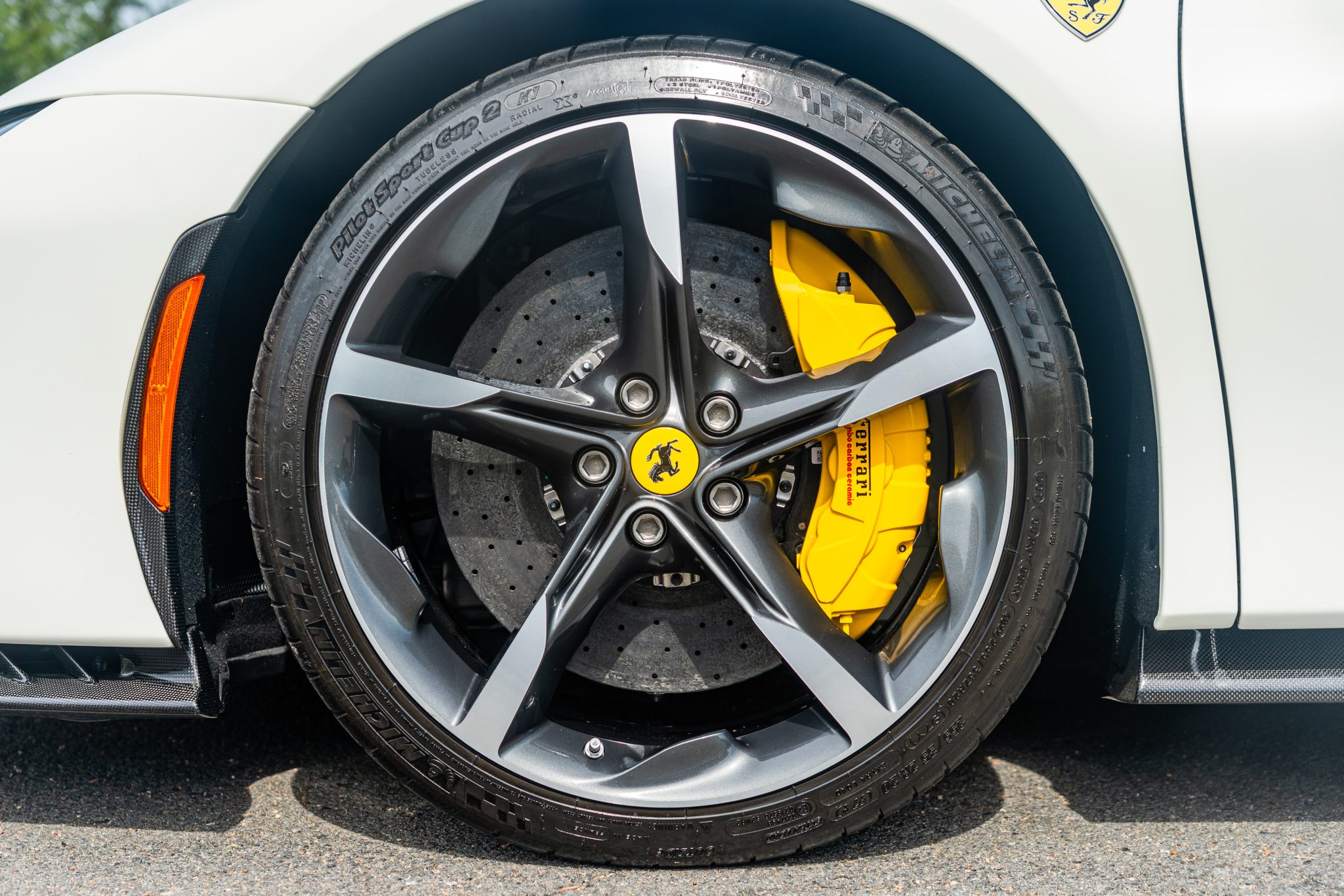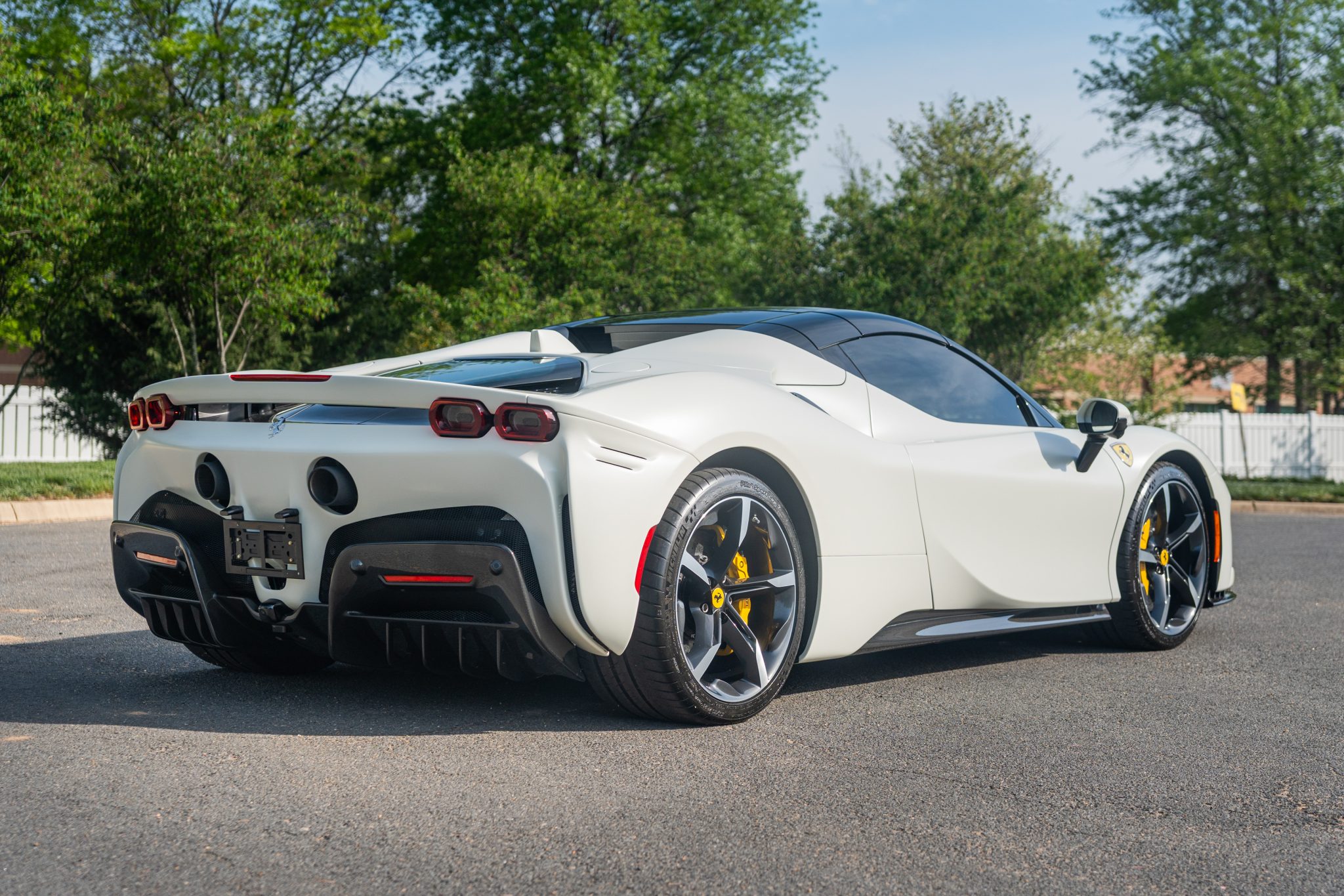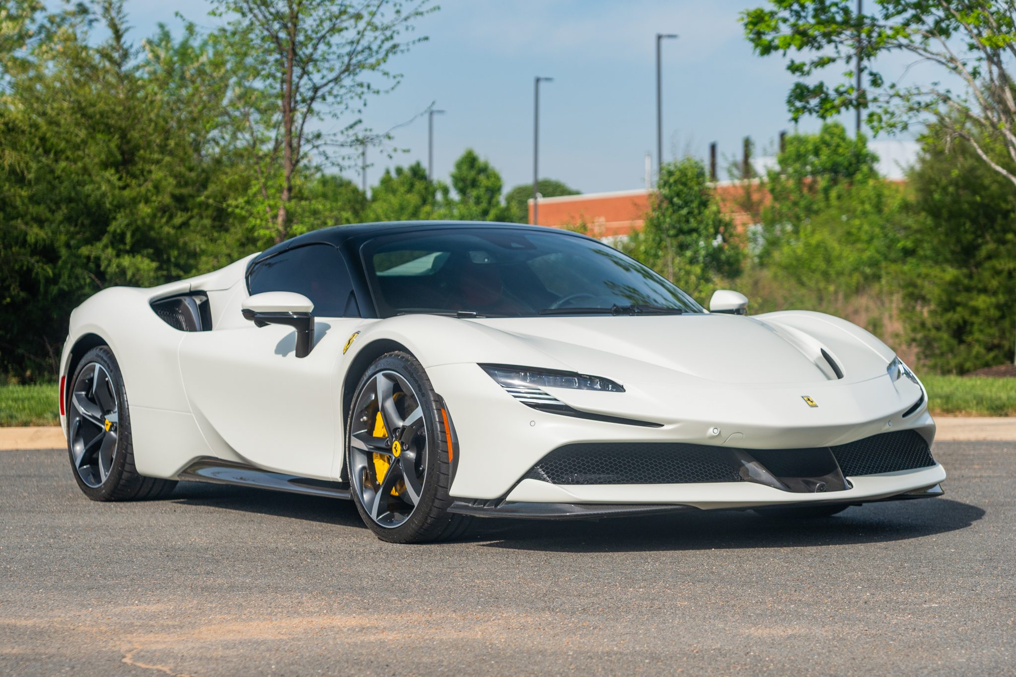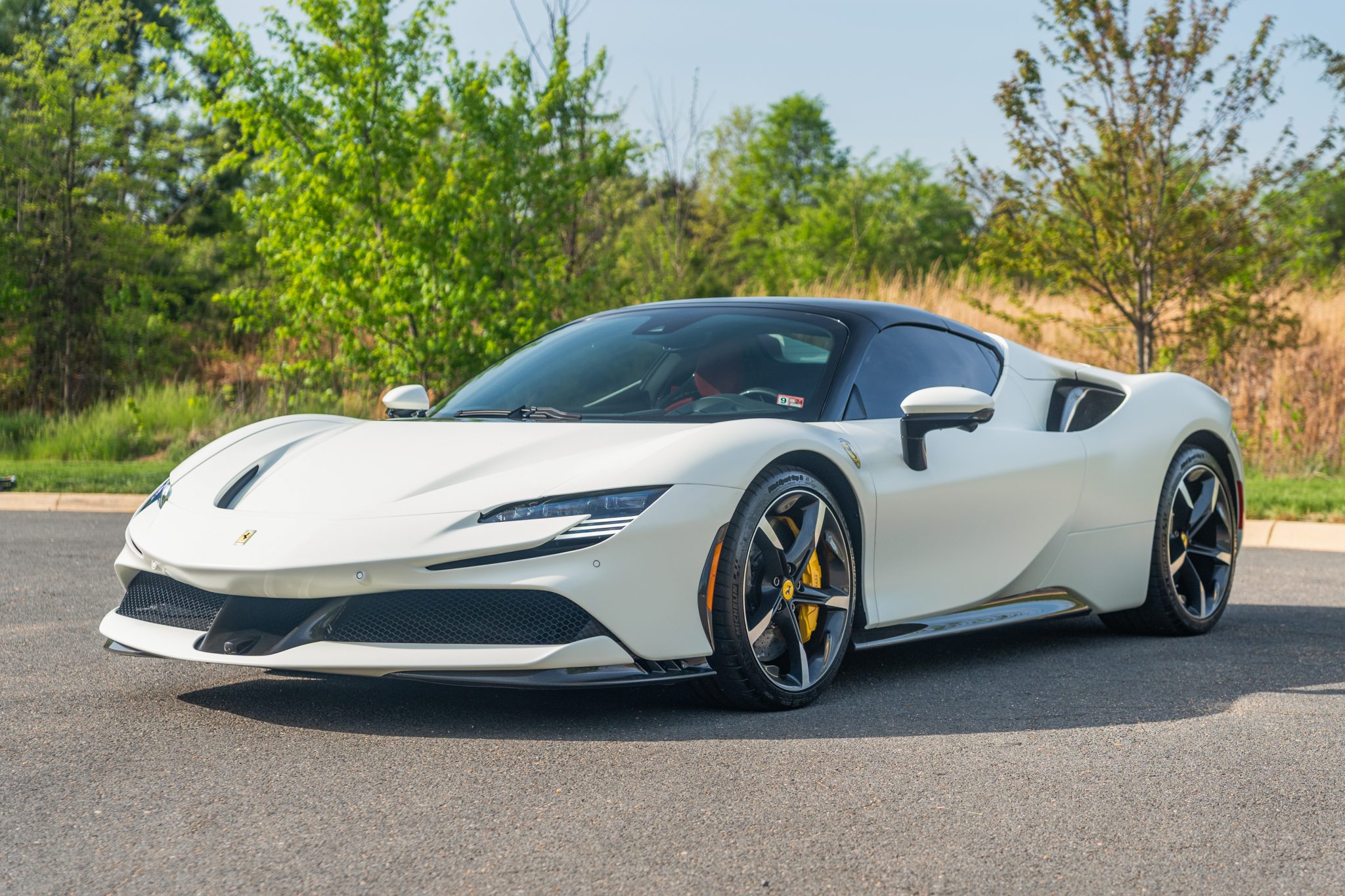 The 20″ forged diamond wheels are mounted with Michelin tires. The SF90 features an aluminum chassis as well as a magnetorheological suspension. The electronic Side Slip Control (eSSC) system can distribute torque to all four wheels, while the electric traction control system (eTC) can deliver power to individual corners. The regenerative brake system is controlled via a brake-by-wire system that splits braking between the hydraulic system and the electric motors. Yellow-finished calipers over carbon-ceramic rotors are fitted at all four corners. A suspension lift system was optioned from the factory.