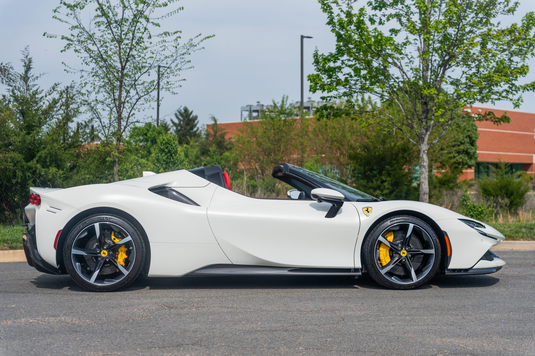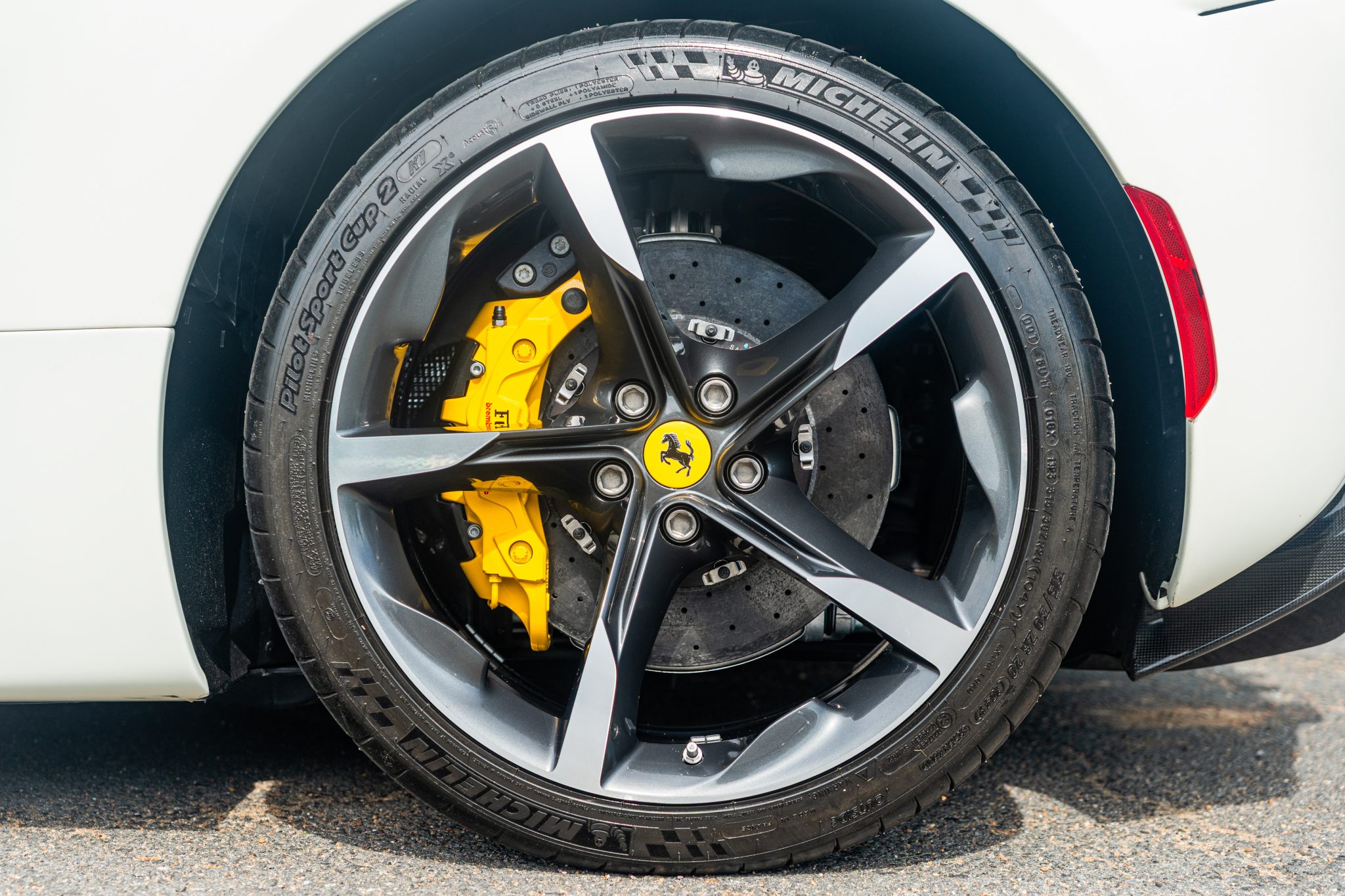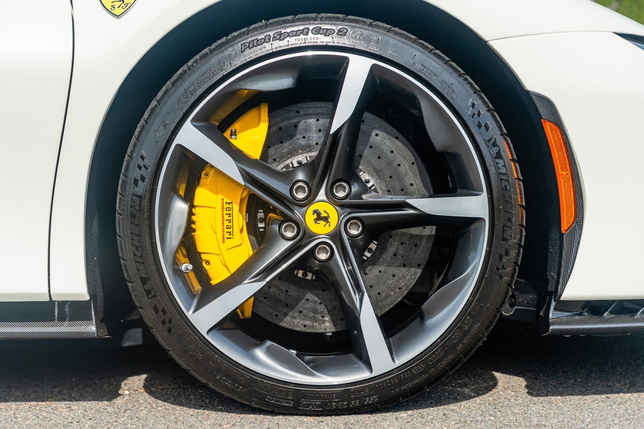 The 20″ forged diamond wheels are mounted with Michelin tires. The SF90 features an aluminum chassis as well as a magnetorheological suspension. The electronic Side Slip Control (eSSC) system can distribute torque to all four wheels, while the electric traction control system (eTC) can deliver power to individual corners. The regenerative brake system is controlled via a brake-by-wire system that splits braking between the hydraulic system and the electric motors. Yellow-finished calipers over carbon-ceramic rotors are fitted at all four corners. A suspension lift system was optioned from the factory.