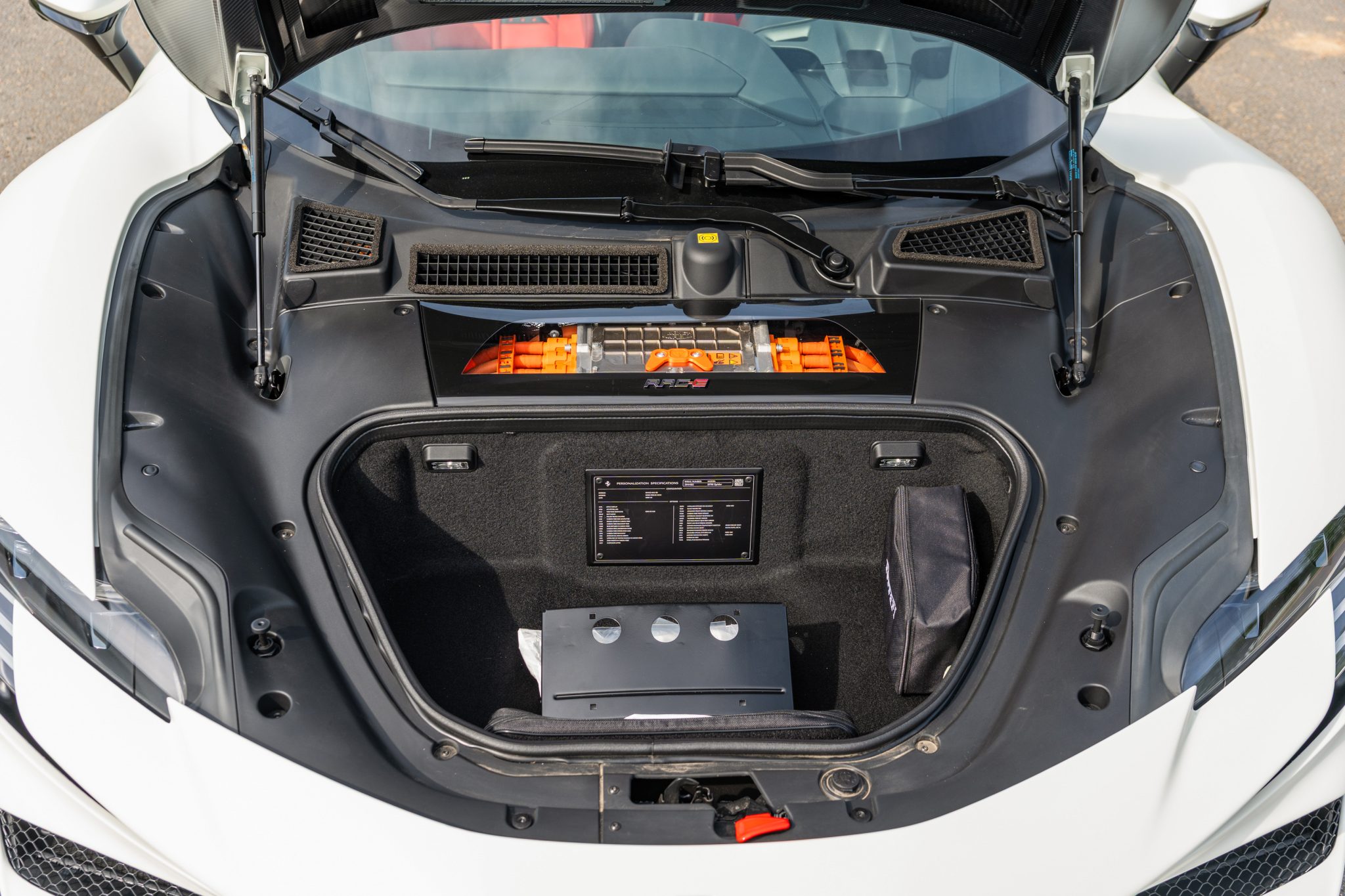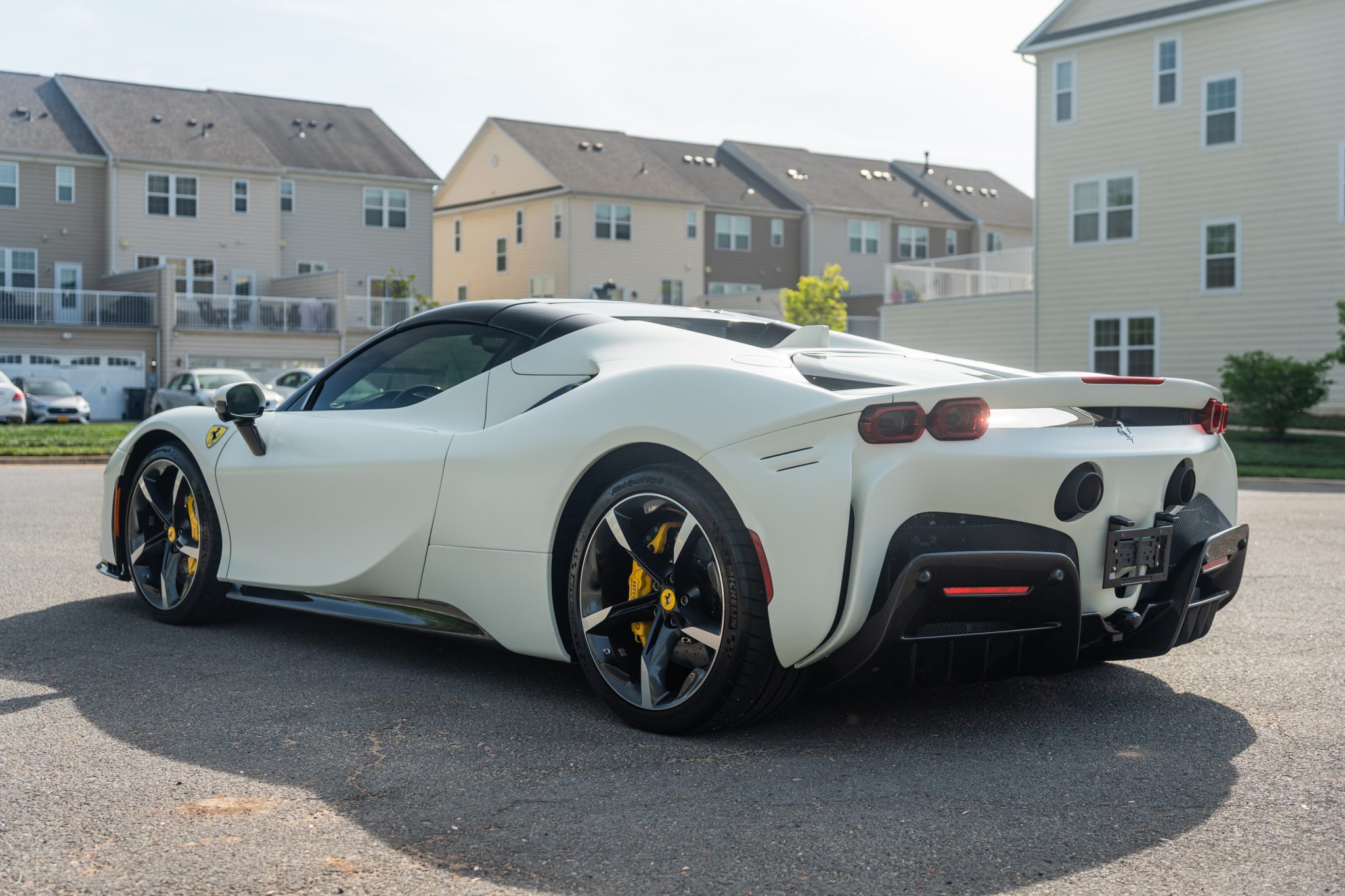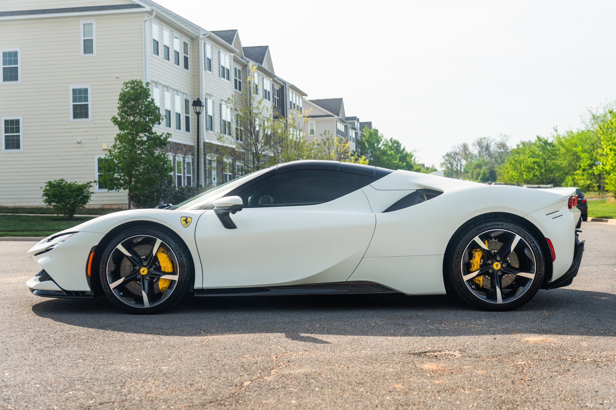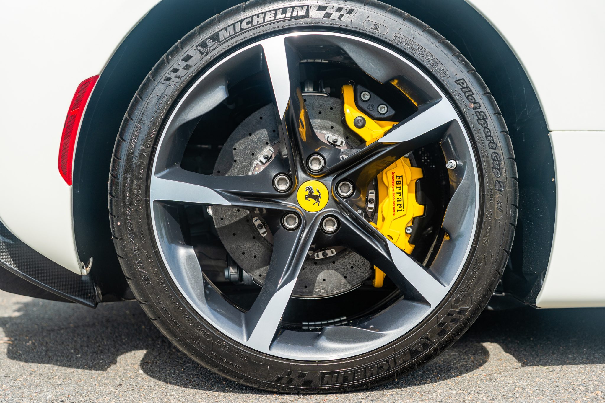The 20″ forged diamond wheels are mounted with Michelin tires. The SF90 features an aluminum chassis as well as a magnetorheological suspension. The electronic Side Slip Control (eSSC) system can distribute torque to all four wheels, while the electric traction control system (eTC) can deliver power to individual corners. The regenerative brake system is controlled via a brake-by-wire system that splits braking between the hydraulic system and the electric motors. Yellow-finished calipers over carbon-ceramic rotors are fitted at all four corners. A suspension lift system was optioned from the factory.
