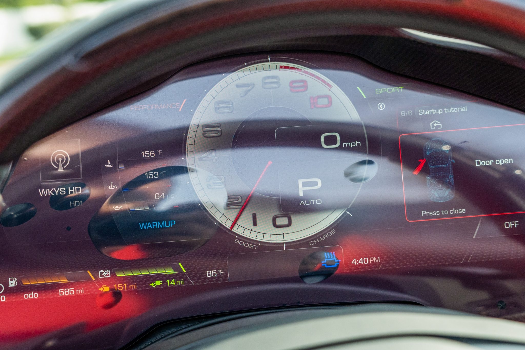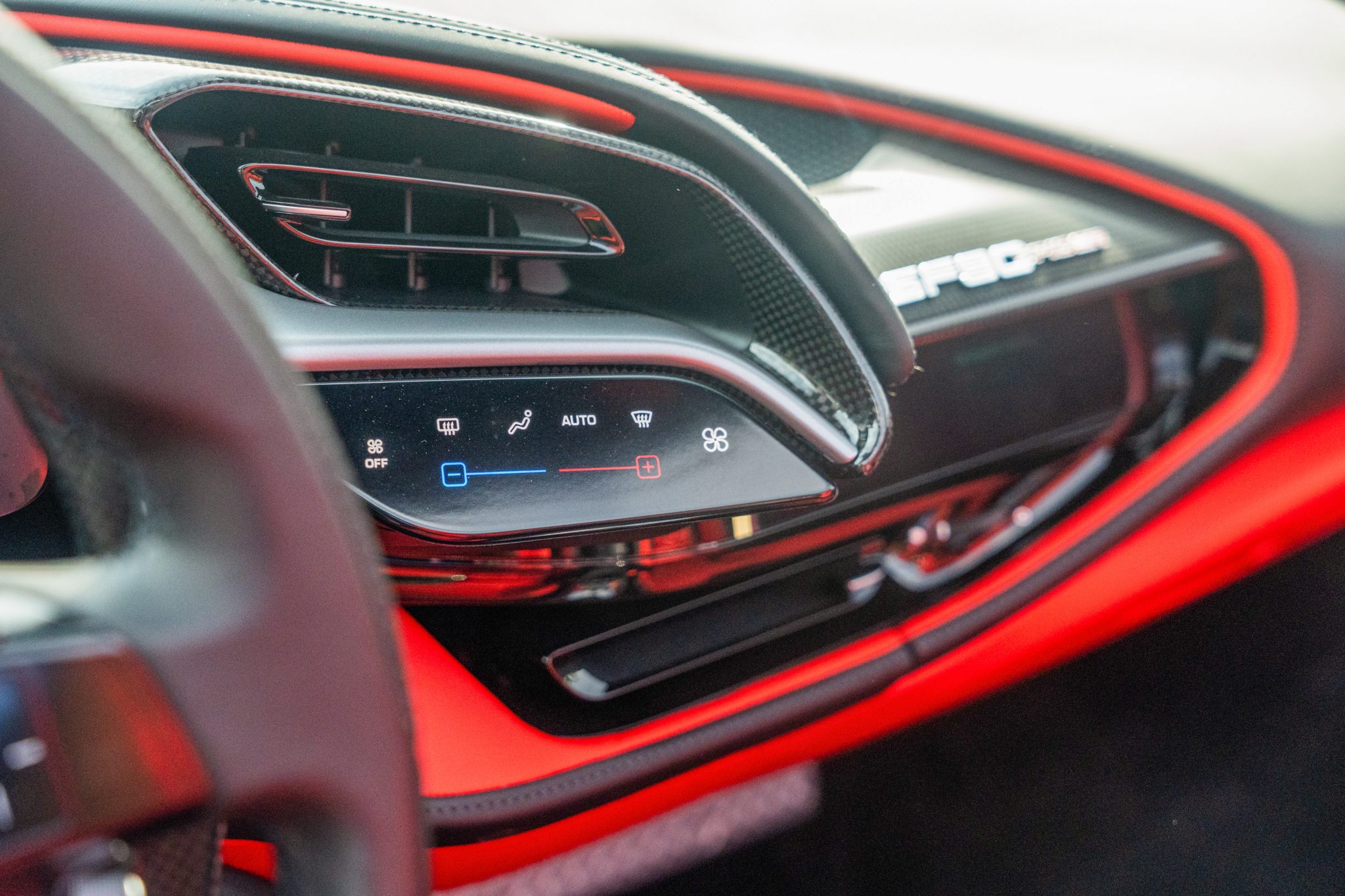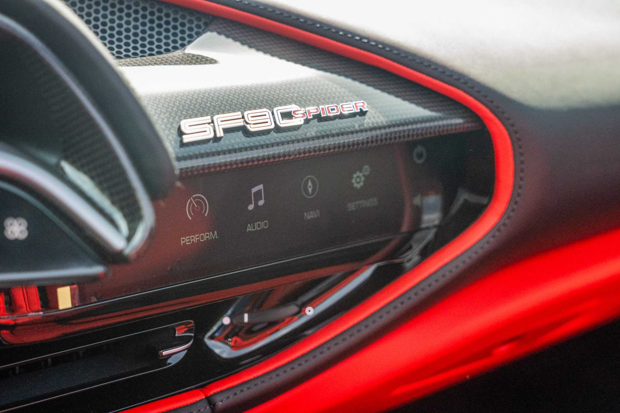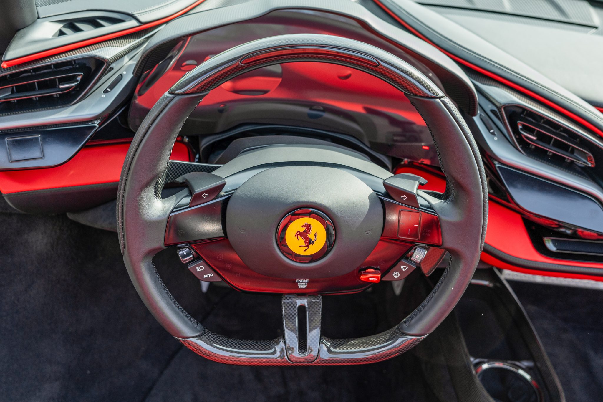 The carbon-fiber- and leather-trimmed steering wheel sits ahead of column-mounted carbon-fiber paddle shifters and is equipped with an engine-start button, a manettino driving-mode selector, and shift lights. The digital instrument cluster is complemented by a head-up display.
