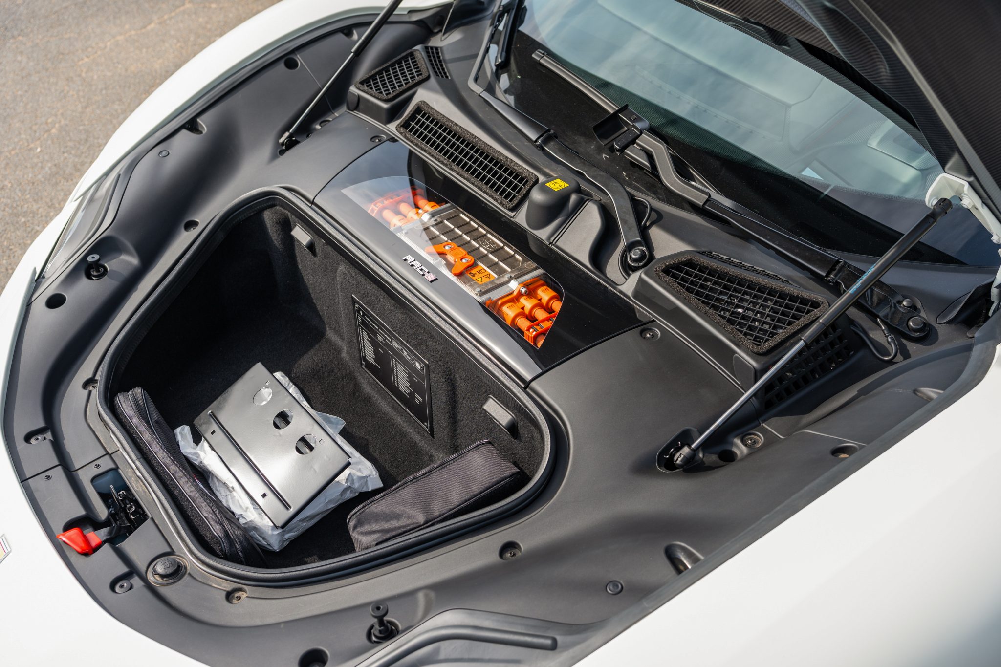 The twin-turbocharged 4.0-liter F154 FA V8 is paired with a trio of electric motors for a combined power output of 986 horsepower and 590 lb-ft of torque. A 7.9-kWh lithium-ion battery pack is mounted between the engine and the carbon-fiber cabin bulkhead.