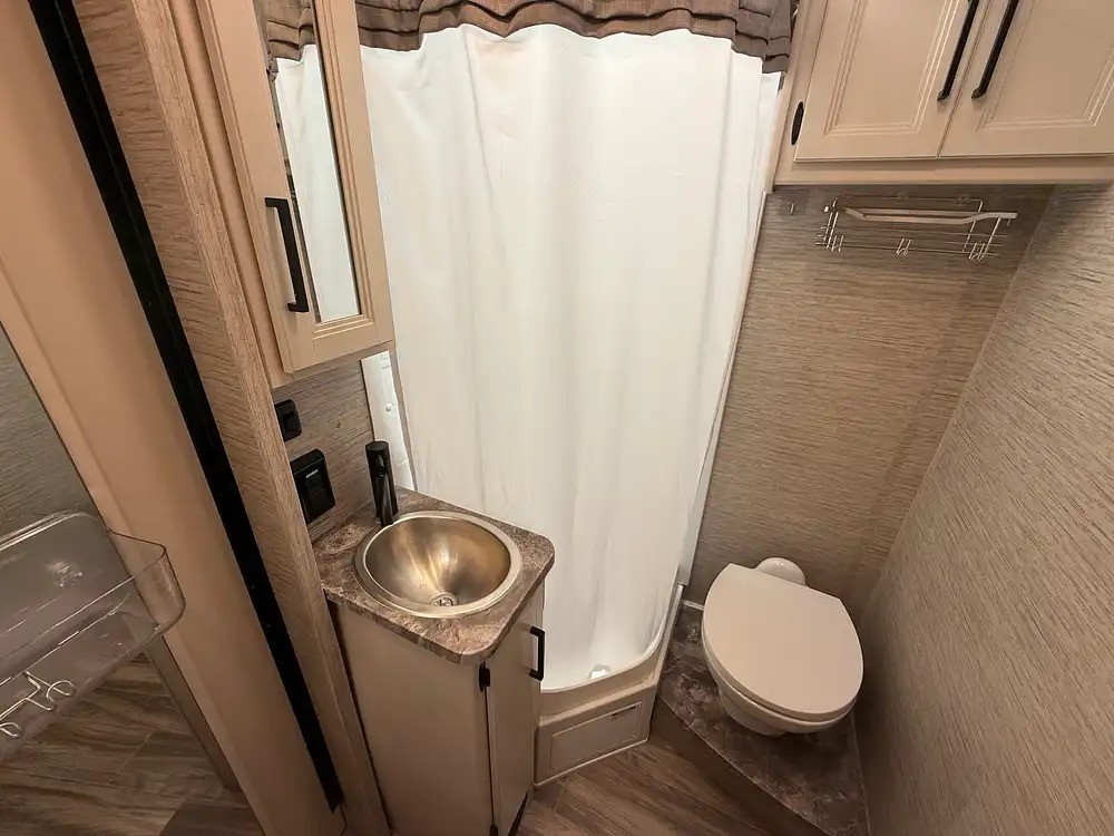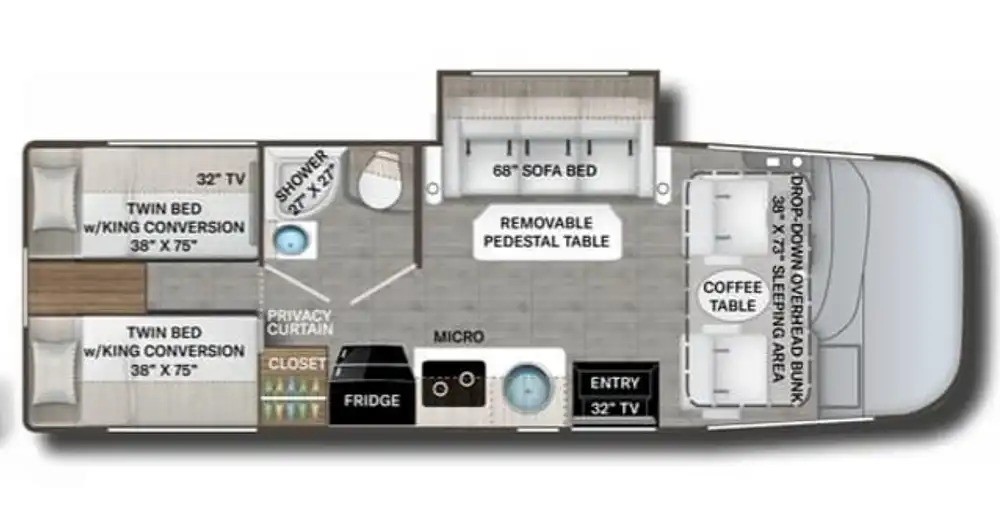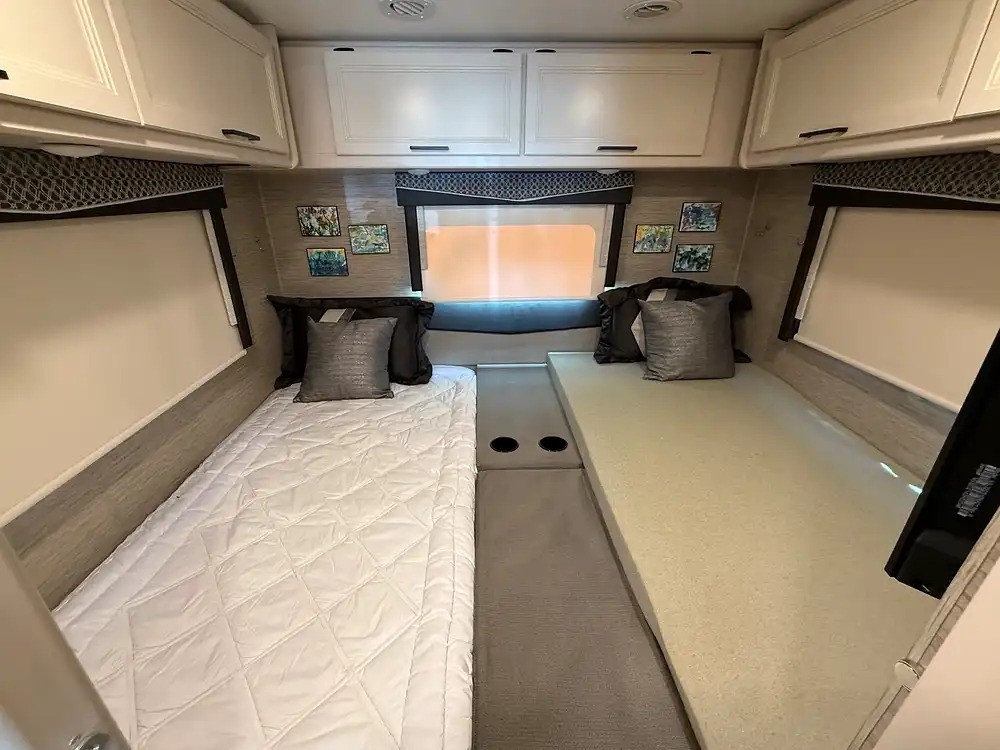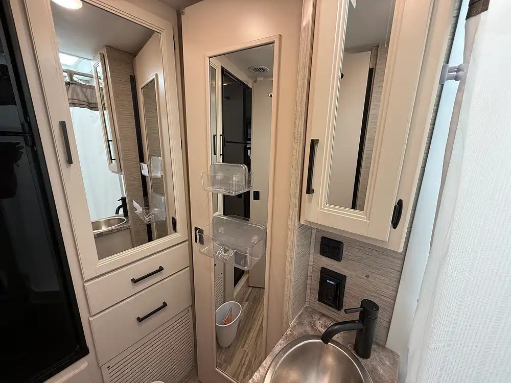 The bathroom is cleverly designed with double doors that open to create a larger bath and dressing area. It includes a sink, vanity with mirror, medicine and linen cabinets, a shower, and a toilet. At the rear, the bedroom offers versatility with two twin beds that easily convert to a full-width king-size bed, plus plenty of overhead storage, a privacy door, and a second flatscreen TV.