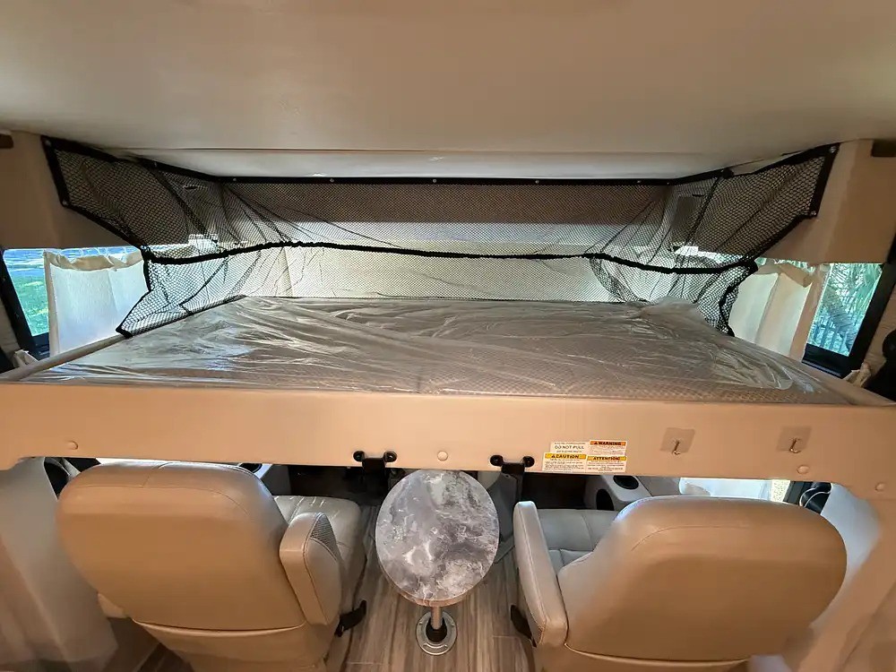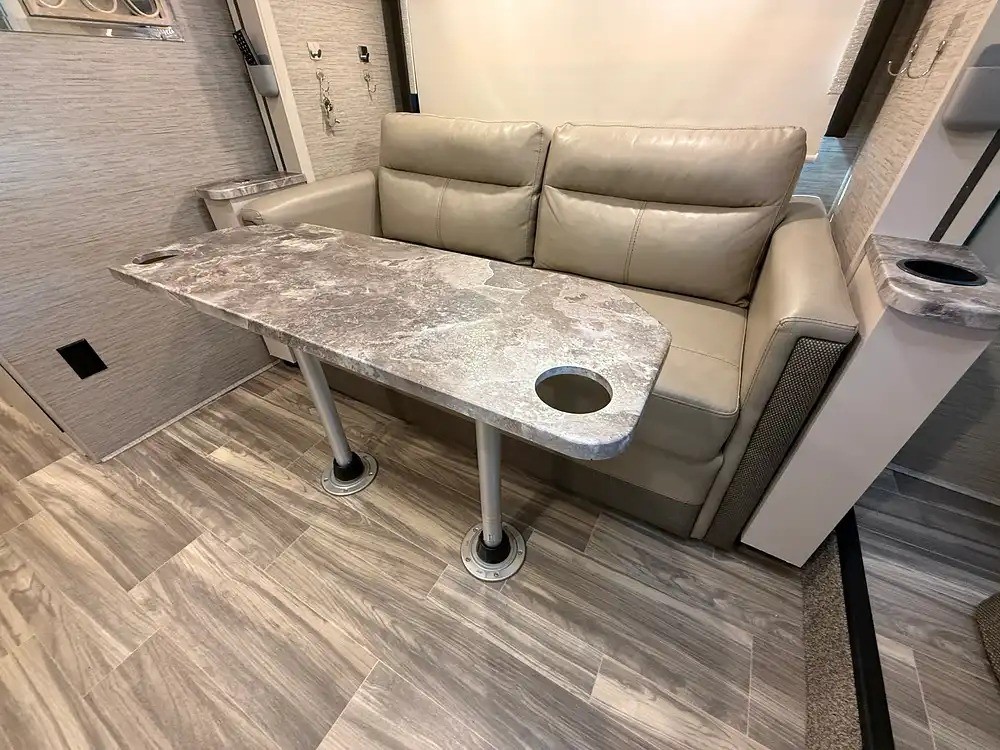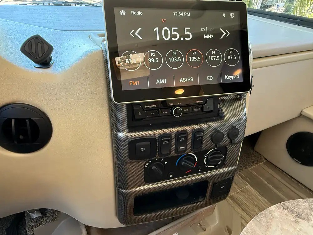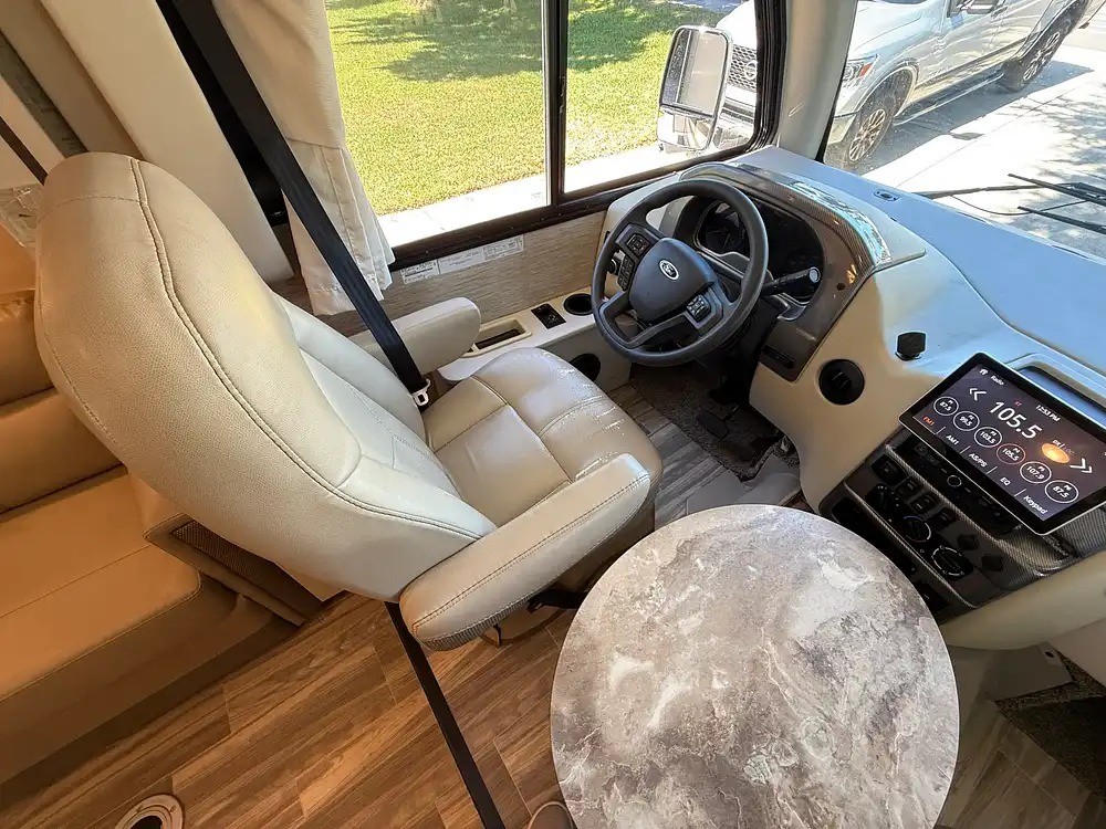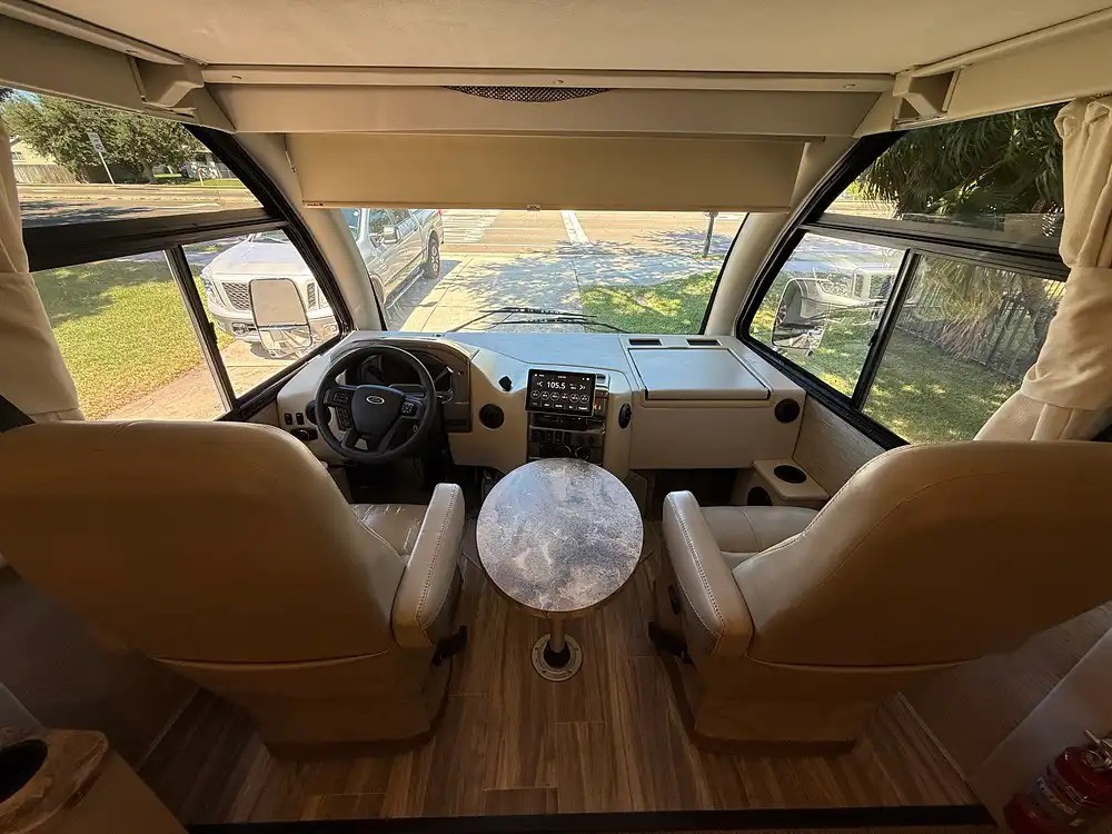 The cockpit area is thoughtfully designed for comfort and safety, featuring two reclining and swiveling captain's chairs, a removable coffee table, power windshield shade, and a 10" display with AM/FM Bluetooth stereo, Apple CarPlay, and Android Auto-Link. The screen also serves as the monitor for the color backup and side-view cameras, giving added peace of mind while driving or parking.