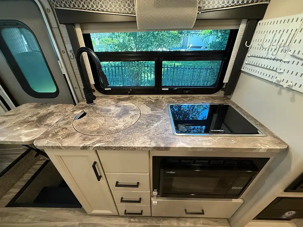 Inside, the living area provides a bright, comfortable space with a power-down overhead bunk, a tri-fold sofa bed, a stowable table, and a flat-screen TV. The kitchen is compact yet well-appointed, with a flip-up counter extension for extra prep space, a two-burner stove with electric start and cooktop cover, a convection microwave oven, a stainless steel sink, ample cabinetry, and a two-door refrigerator/freezer.